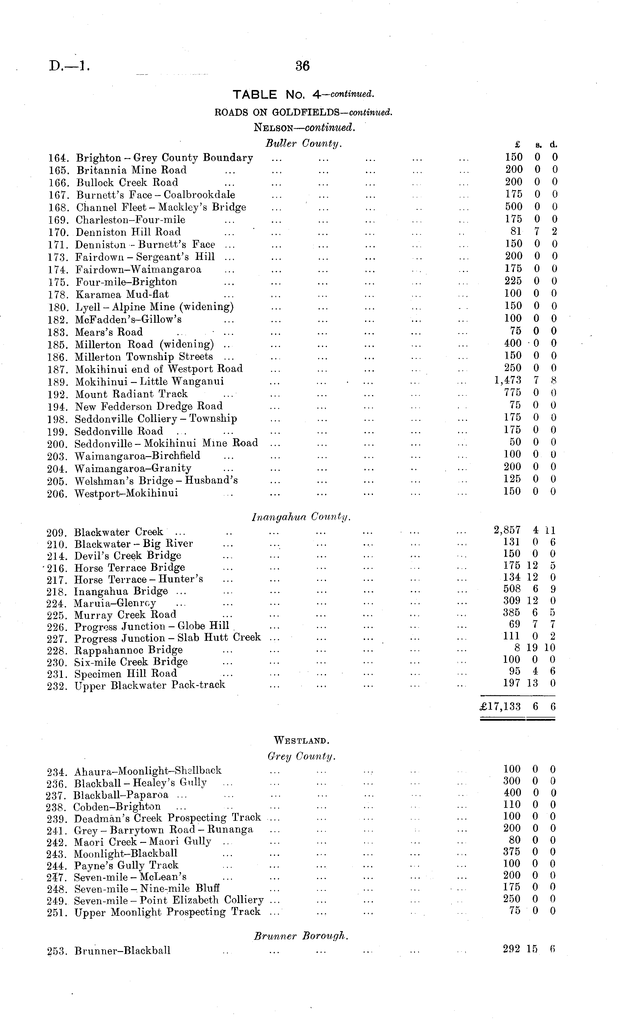 TABLE NO. A-— continued. ROADS ON GOLDFlELDS— continued. Nelson — continued. Buller County. £ a. d. 164. Brighton - Grey County Boundary ... ... ... ... ... 150 0 0 165. Britannia Mine Road ... ... ... ... ... ... 200 0 0 166. Bullock Creek Road ... ... ... ... ... ... 200 0 0 167. Burnett's Face-Coalbrookdale ... ... ... ... ... 175 0 0 168. Channel Fleet - Mackley's Bridge ... ... ... .. ... 500 0 0 169. Charleston-Four-mile ... ... ... ... ... ... 175 0 0 170. Denniston Hill Road ... ... ... ... ... .. 81 7 2 171. Denniston - Burnett's Face ... ... ... ... ... ... 150 0 0 173. Fairdown - Sergeant's Hill ... ... ... ... ... ... 200 0 0 174. Fairdown-Waimangaroa ... ... ... ... ... 175 0 0 175. Four-mile-Brighton ... ... ... ... ... ... 225 0 0 178. Karamea Mud-flat ... ... ... ... ... ... 100 0 0 180. Lyell - Alpine Mine (widening) ... ... ... ... -. 150 0 0 182. McFadden's-Gillow's ... ... ... ... ... ... 100 0 0 183. Mears's Road ... ... ... ... ... ... ■■• 75 0 0 185. Millerton Road (widening) .. ... ... ... ... ... 400 0 0 186. Millerton Township Streets ... ... ... ... ... ... 150 0 0 187. Mokihinui end of Westport Road ... ... ... ..,. ... 250 0 0 189. Mokihinui - Little Wanganui ... ... • ... ... ... 1,473 7 8 192. Mount Radiant Track ... ... ... ... ... .... 775 0 0 194. New Fedderson Dredge Road ... ... ... ... .'. 75 0 0 198. Seddonville Colliery - Township ... ... ... ... ... 175 0 0 199. Seddonville Road ... ... ... ... ••• ••• ... 175 0 0 200. Seddonville - Mokihinui Mine Road ... ... ... ... ... 50 0 0 203. Waimangaroa-Birchfield ... ... ... ... ... ... 100 0 0 204. Waimangaroa-Granity ... ... ... ... .-. ..." 200 0 0 205. Welshman's Bridge-Husband's ... ... ... ... ... 125 0 0 206. Westport-Mokihinui ... ... ... ••• ••■ •■■ 150 0 0 Inangahua County. 209. Blackwater Creek ... .. ... ... ••■ ■•■ ••■ 2,857 4 11 210. Blackwater - Big River ... ... ... .... ... ... 131 0 6 214. Devil's Creek Bridge ... ... ••• ••• ••■ •_._. 150 0 0 216. Horse Terrace Bridge ... ■■• ■■• ■•■ ■•■'• • •■ 175 12 5 217. Horse Terrace-Hunter's ... ... ... ... ••■ •■• 134 12 0 218. Inangahua Bridge ... ... ••• ■•• ••• ••■ ••• 508 6 9 224. Maruia-Glenrcy ... ... ... ••• •■• •■■'• ••■ 309 12 0 225. Murray Creek Road ... ... ... •■• •■- •■■ 385 6 5 226. Progress Junction - Globe Hill . ... ... ... ... ... 69 7 7 227. Progress Junction - Slab Hutt Creek ... ... ... ... ... 11l 0 2 228. Rappahannoc Bridge ... ... •■■ ■•■ ••• •■• 8 19 10 230. Six-mile Creek Bridge ...- ... ••■ ••'■ -•• ••■ 100 0 0 231. Specimen Hill Road ... ... .-.., ••■ ■•■ •■■■ 95 4 6 232. Upper Blackwater Pack-track ... ... ... ... ... 197 13 0 £17,133 6 6 Westland. Grey County. 234. Ahaura-Moonlight-Shellback ... ... .... 100 0 0 236. Blackball-Healey's Gully ... ... ... ... ... 300 0 0 237. BlackbaJJ.-Papar.oa ... ... •■■ ... ■•■ 400 0 0 238. Cobden-Brighton ... ... ■■• ■■■ ■'■:■ ■■• HO 0 0 239. Deadman's Creek Prospecting Track ... ... ... ... 100 0 0 241. Grey-Barrytown Road-Runanga ... ... ... ... 200 0 0 242. Maori Creek-Maori Gully ... ... ... ... ... .. 80 0 0 243. Moonlight-Blackball ... ... ••• ... ••- •-,. 375 0 0 244. Payne's Gully Track ... ... ... ... • •• ... 100 0 0 217. Seven-mile-McLean's ... ... ... ... ... ... 200 0 0 248. Seven-mile - Nine-mile Bluff ... ... ... ... •■ 175 0 0 249. Seven-mile - Point Elizabeth Colliery ... ... ... ... 250 0 0 251. Upper Moonlight Prospecting Track ... ... ... ... 75 0 0 Brunner Borough. 253. Brunner-Blackball ... ... ... ... ' ... ... 292 15 6