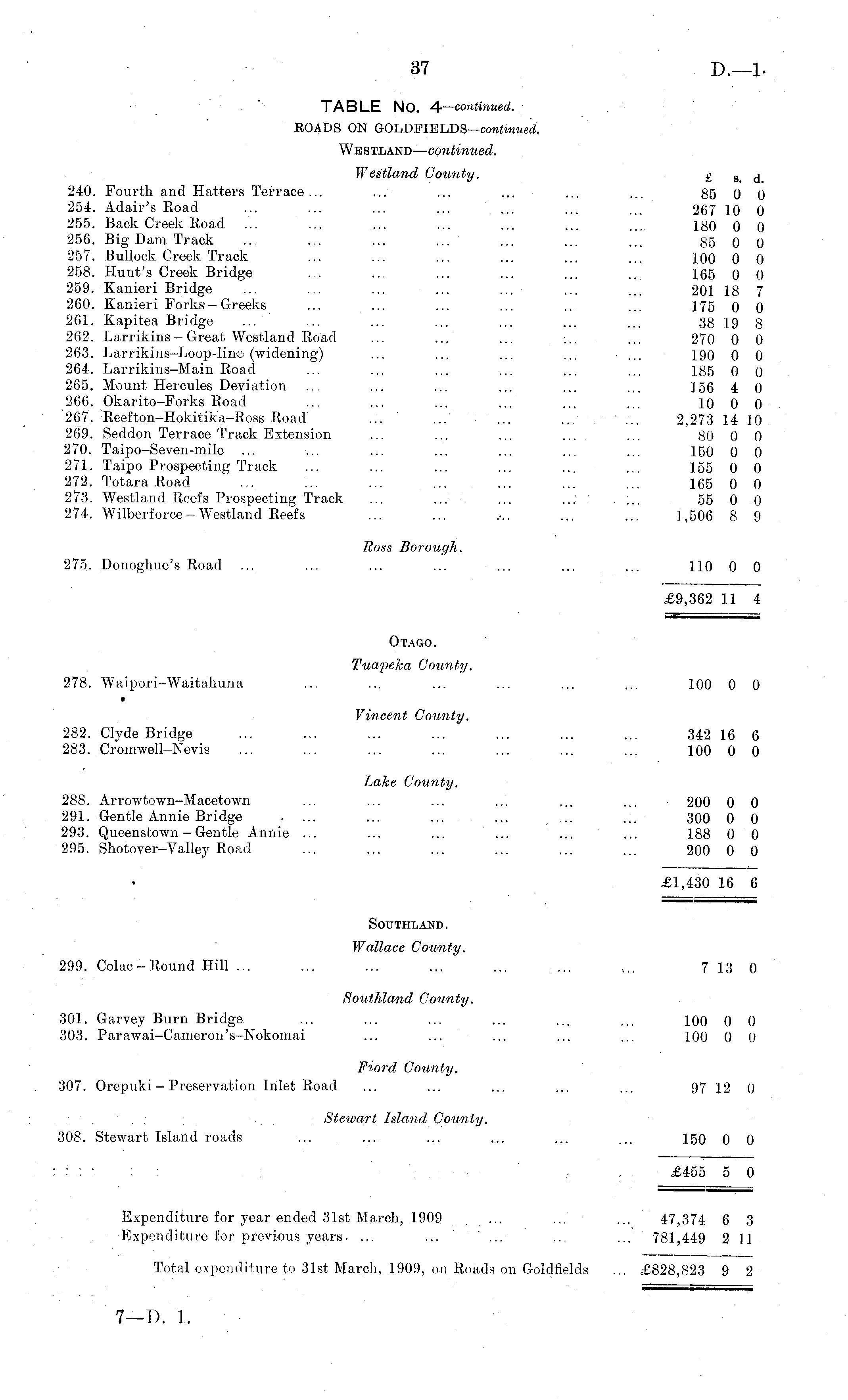 TABLE NO. A-—continued. ROADS ON GOLDFlELDS— continued. Westland— continued. Westland County. £ s d 240. Fourth and Hatters Terrace... ... ... ... ... ... 85 0 0 254. Adair's Road ... ... ... ... ... ... ... 267 10 0 255. Back Creek Road ... ... ... ... ... ... ... 180 0 0 256. Big Dam Track ... ... ... ... ... ... ... 85 0 0 257. Bullock Creek Track ... ... ... ... ... ... 100 0 0 258. Hunt's Creek Bridge ... ... ... ... ... ... 165 0 0 259. Kanieri Bridge ... ... ... ... ... ... ... 201 18 7 260. Kanieri Forks-Greeks ... ... ... ... ... ... 175 0 0 261. Kapitea Bridge ... ... ... ... ... ... ... 38 19 8 262. Larrikins - Great Westland Road ... ... ... ... ... 270 0 0 263. Larrikins-Loop-line (widening) ... ... ... ... ... 190 0 0 264. Larrikins-Main Road ... ... ... ... ... ... 185 0 0 265. Mount Hercules Deviation ... ... ... ... ... ... 156 4 0 266. Okarito-Forks Road ... ... ... ... ... ... 10 0 0 267. Reefton-Hokitika-Ross Road ... ... ... ... ... 2,273 14 10 269. Seddon Terrace Track Extension ... ... ... ... ... 80 0 0 270. Taipo-Seven-mile ... ... ... ... ... ... ... 150 0 0 271. Taipo Prospecting Track ... ... ... ... ... ... 155 o 0 272. Totara Road ... ... ... ... ... ... ... 165 0 0 273. Westland Reefs Prospecting Track ... ... ... ..; : ;.. 55 0 0 274. Wilberforce - Westland Reefs ... ... .... ... ... 1,506 8 9 Ross Borough. 275. Donoghue's Road ... ... ... ... ... ... ... 110 0 0 £9,362 11 4 Otago. Tuapeka County. 278. Waipori-Waitahuna ... ... ... ... ... ... 100 0 0 Vincent County. 282. Clyde Bridge ... ... ... ... ... ... ... 342 16 6 283. Cromwell-Nevis ... ... ... ... ... ... ... 100 0 0 Lake County. 288. Arrowtown-Macetown ... ... ... ... ... ... 200 0 0 291. Gentle Annie Bridge .... ... ... ... ... ... 300 0 0 293. Queenstown - Gentle Annie ... ... ... ... ... ... 188 0 0 295. Shotover-Valley Road ... ... ... ... ... ... 200 0 0 £1,430 16 6 Southland. Wallace County. 299. Colac-Round Hill ... ... ... ... ... ... .... 7 13 0 Southland County. 301. Garvey Burn Bridge ... ... ... ... ... ... 100 0 0 303. Parawai-Cameron's-Nokomai ... ... ... ... ... 100 0 0 Fiord County. 307. Orepuki - Preservation Inlet Road ... ... ... ... ... 97 12 0 Stewart Island County. 308. Stewart Island roads ... ... ... ... ... ... 150 0 0 £455 5 0 Expenditure for year ended 31st March, 1909 ... ... ... 47,374 6 3 Expenditure for previous years. ... ... ... ... ... 781,449 211 Total expenditure to 31st March, 1909, on Roads on Goldfields ... £828,823 9 2