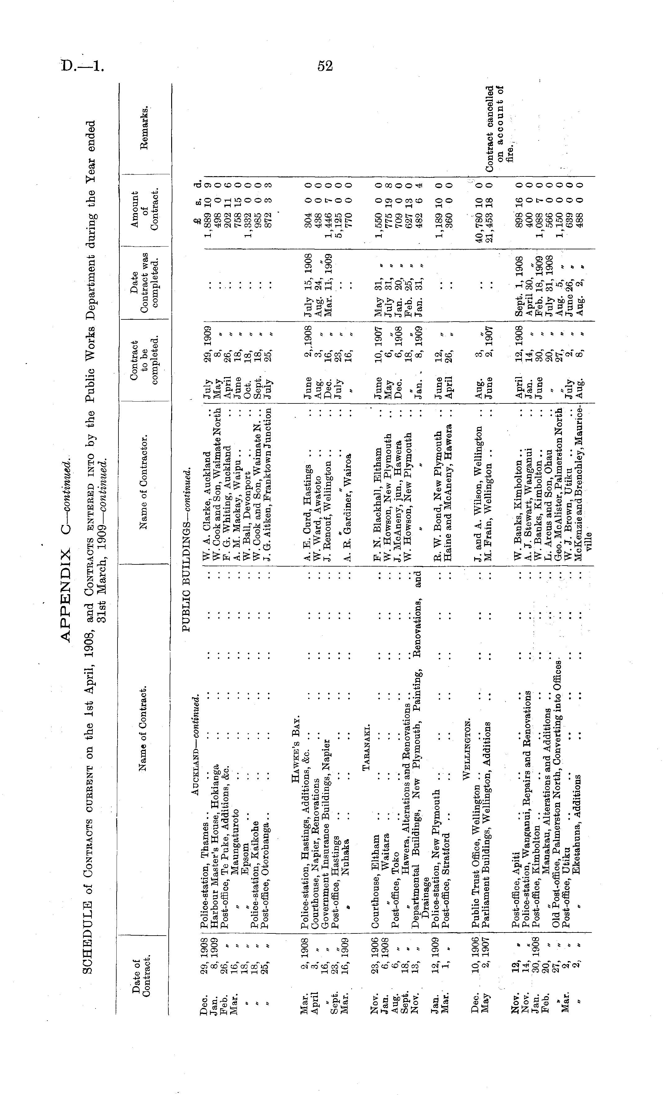 Date of Contract. Name of Contract. Name of Contractor. | Contract to be completed. Date Contract was completed. Amount of Contract. Remarks. PUBLIC BUILDINGS-coratimwed. Auckland — continued. £ s. d. 1,889 10 9 498 0 0 202 11 6 758 15 0 1,332 0 0 985 0 0 872 3 3 Dec. Jan. Feb. Mar. 29, 1908 8, 1909 26, „ 16, „ 18, „ 18, „ 25, „ Police-station, Thames .. .. .. .. .. .. .. W. A. Clarke, Auckland Harbour Master's House, Hokianga .. .. .. .. .. W. Cook and Son, Waimate North Post-office, Te Puke, Additions, &c. .. .. .. .. .. F. G. Whiting, Auckland Maungaturoto .. .. .. .. .. ..A.M. Mackay, Waipu Epsom .. .. .. .. .. .. .. W. Ball, Devonport Police-station, Kaikohe .. .. .. .. .. .. W. Cook and Son, Waimate N. .. Post-office, Otorohanga .. .. .. .. .. .. .. J. G. Aitken, Franktown Junction July May April June Oct. Sept. July 29, 1909 8, „ 26, „ 18, „ 18, „ 18, „ 25, „ Mar. April Sept. Mar. 2, 1908 3, „ 16, „ 23 16,' 1909 Hawke's Bay. Police-station, Hastings, Additions, &c. .. .. .. .. .. A. E. Curd, Hastings Courthouse, Napier, Renovations .. .. .. .. .. W. Ward, Awatoto Government Insurance Buildings, Napier .. .. .. .. J. Renouf, Wellington Post-office, Hastings Nuhaka .. .. .. .. .. .. .. A. R. Gardiner," Wairoa' '.'. June Aug. Dec. July 2,.1908 3, „ 16, „ 23, „ 16, „ July 15, 1908 Aug. 24, „ Mar. 11, 1909 304 0 0 438 0 0 1,446 7 0 5,125 0 0 770 0 0 Nov. Jan. Aug. Sept. Nov. 23, 1906 6, 1908 6, „ 18, „ 13, „ Taranaki. May 31, „ July 31, „ Jan. 20, „ Feb. 25, „ Jan. 31, „ Courthouse, Eltham .. .. .. .. .. .. .. F. N. Blackhall, Eltham Waitara .. .. .. ,. .. .. .. W. Howson, New Plymouth Post-office, Toko .. .. .. .. .. .. .. J. McAneny, jun., Hawera „ Hawera, Alterations and Renovations .. .. .. .. W. Howson, New Plymouth Departmental Buildings, New Plymouth, Painting, Renovations, and Drainage Police-station, New Plymouth .. .. .. .. .. .. R. W. Bond, New Plymouth .. Post-office, Stratford .. .. .. .. .. .. .. Haine and McAneny, Hawera .. June May Dec. Jan. . 10, 1907 6, „ 6, 1908 18, „ 8, 1909 1,550 0 0 775 19 8 709 0 0 627 13 0 482 6 4 Jan. Mar. 12, 1909 1, . June April 12, „ 26, „ 1,189 10 0 360 0 0 Dec. May 10, 1906 2, 1907 Wellington. 40,780 10 0 21,453 18 0 Public Trust Office, Wellington .. .. .. .. .. .. J. and A. Wilson, Wellington .. Parliament Buildings, Wellington, Additions .. .. .. .. M. Frain, Wellington .. Aug. June 3, „ 2, 1907 Nov. Nov. Jan. Feb. Mar. 12, „ 14, „ 30, 1908 20, „ 27, „ 2, „ 2, „ April Jan. June July Aug. 12, 1908 14, „ 30, „ 20, „ 27, „ 2, . 8, tf 898 16 0 400 0 0 1,088 7 0 566 0 0 1,150 0 0 639 0 0 488 0 0 Contract cancelled on account of fire. Post-office, Apiti .. .. .. .. .. .. .. W. Banks, Kimbolton Police-station, Wanganui, Repairs and Renovations .. .. .. A. J. Stewart, Wanganui Post-office, Kimbolton .. .. .. .. .. .. .. W. Banks, Kimbolton.. .'. Manakau, Alterations and Additions .. .. ,. .. L. Arcus and Son, Ohau Old Post-office, Palmerston North, Converting into Offices. .. .. Geo. McAlister, Palmerston North Post-office, Utiku .. .. .. .. .. .. .. W. J. Brown, Utiku .. Eketahuna, Adaitions .. .. .. .. .. McKenzie andBrenchley, Maurioeville Sept. 1, 1908 April 30, „ Feb. 18, 1909 July 31, 1908 Aug. 5, „ June 26, „ Aug. 2, „