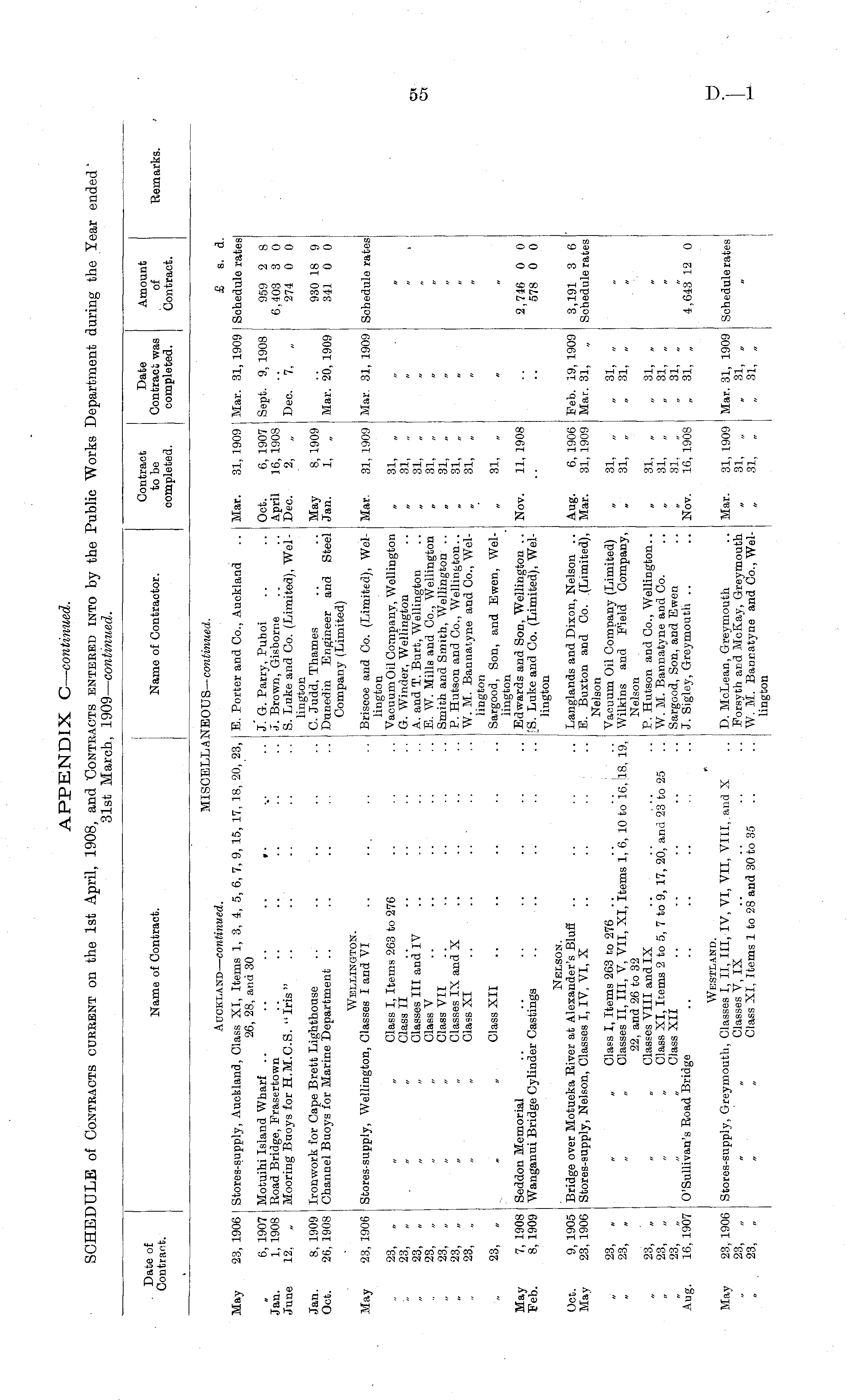 APPENDIX C— continued. SCHEDULE of Contracts current on the 1st April, 1908, and Contracts entered into by the Public Works Department during the Year ended 31st March, 1909— continued.