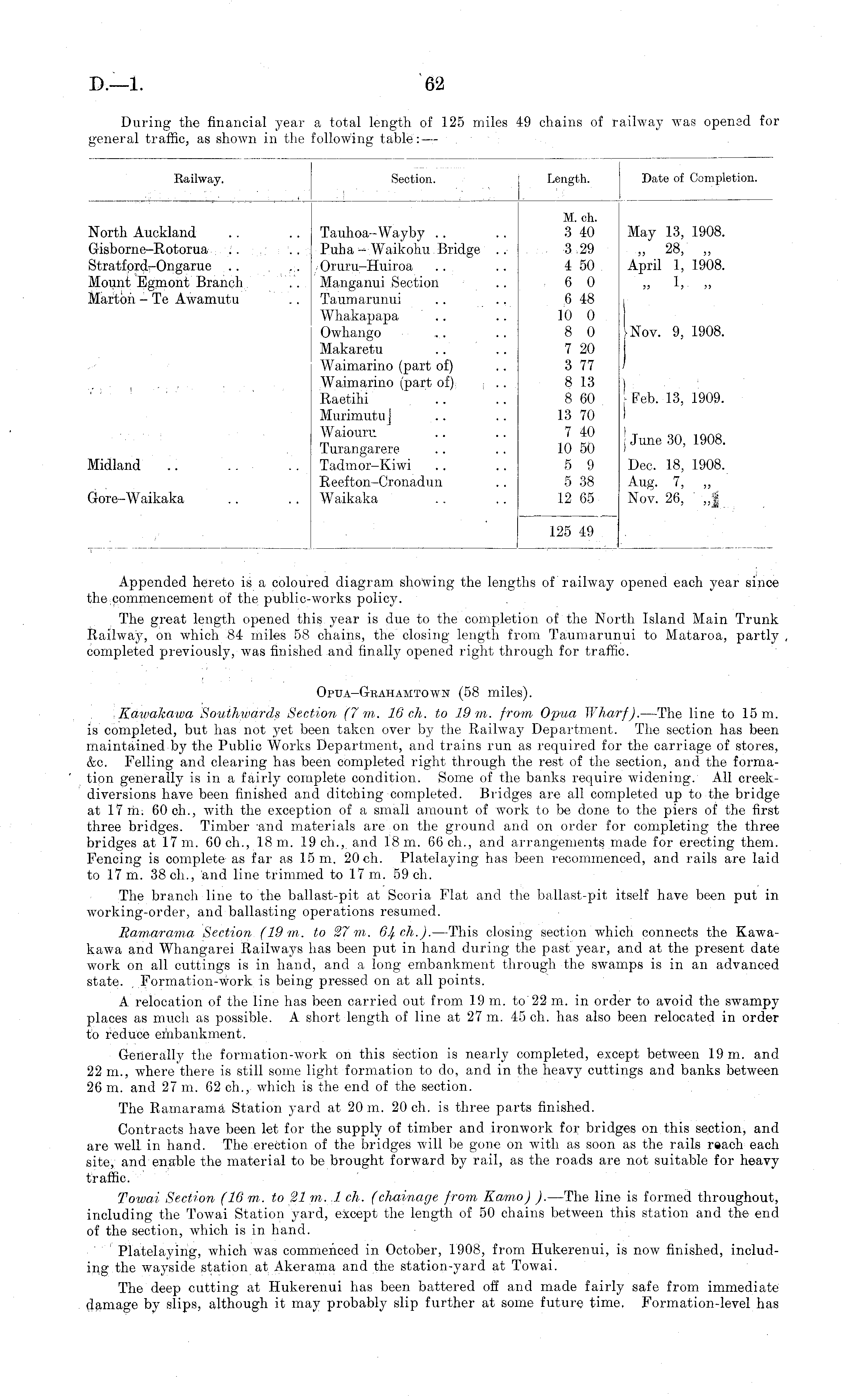 Appended hereto is a coloured diagram showing the lengths of railway opened each year since the commencement of the public-works policy. The great length opened this year is due to the completion of the North Island Main Trunk Railway, on which 84 miles 58 chains, the closing length from Taumarunui to Mataroa, partly completed previously, was finished and finally opened right through for traffic. Opua-Grahamtown (58 miles). Kawakawa Southwards Section (7 m. 16 eh. to 19 m. from Opua Wharf). —The line to 15 m. is completed, but has not yet been taken over by the Railway Department. The section has been maintained by the Public Works Department, and trains run as required for the carriage of stores, &c. Felling and clearing has been completed right through the rest of the section, and the formation generally is in a fairly complete condition. Some of the banks require widening. All creekdiversions have been finished and ditching completed. Bridges are all completed up to the bridge at 17 m. 60 eh., with the exception of a small amount of work to be done to the piers of the first three bridges. Timber 'and materials are on the ground and on order for completing the three bridges at 17 m. 60 eh., 18 m. 19 eh., and 18 m. 66 eh., and arrangements made for erecting them. Fencing is complete as far as 15 m. 20 eh. Platelaying has been recommenced, and rails are laid to 17 m. 38 eh., and line trimmed to 17 m. 59 eh. The branch line to the ballast-pit at Scoria Flat and the ballast-pit itself have been put in working-order, and ballasting operations resumed. Eam.arama Section (19 m. to 27 m. 61/. eh.). —This closing section which connects the Kawakawa and Whangarei Railways has been put in hand during the past year, and at the present date work on all cuttings is in hand, and a long embankment through the swamps is in an advanced state. Formation-work is being pressed on at all points. A relocation of the line has been carried out from 19 m. to 22 m. in order to avoid the swampy places as much as possible. A short length of line at 27 m. 45 eh. has also been relocated in order to reduce embankment. Generally the formation-work on this section is nearly completed, except between 19 m. and 22 m., where there is still some light formation to do, and in the heavy cuttings and banks between 26 m. and 27 m. 62 eh., which is the end of the section. The Ramarama Station yard at 20 m. 20 eh. is three parts finished. Contracts have been let for the supply of timber and ironwork for bridges on this section, and are well in hand. The erection of the bridges will be gone on with as soon as the rails reach each site, and enable the material to be brought forward by rail, as the roads are not suitable for heavy traffic. Towai Section (16 m. to 21m. 1 eh. (chainage from Kamo) ). —The line is formed throughout, including the Towai Station yard, except the length of 50 chains between this station and the end of the section, which is in hand. Platelaying, which was commenced in October, 1908, from Hukerenui, is now finished, including the wayside station at Akerama and the station-yard at Towai. The deep cutting at Hukerenui has been battered off and made fairly safe from immediate damage by slips, although it may probably slip further at some future time, Formation-level has