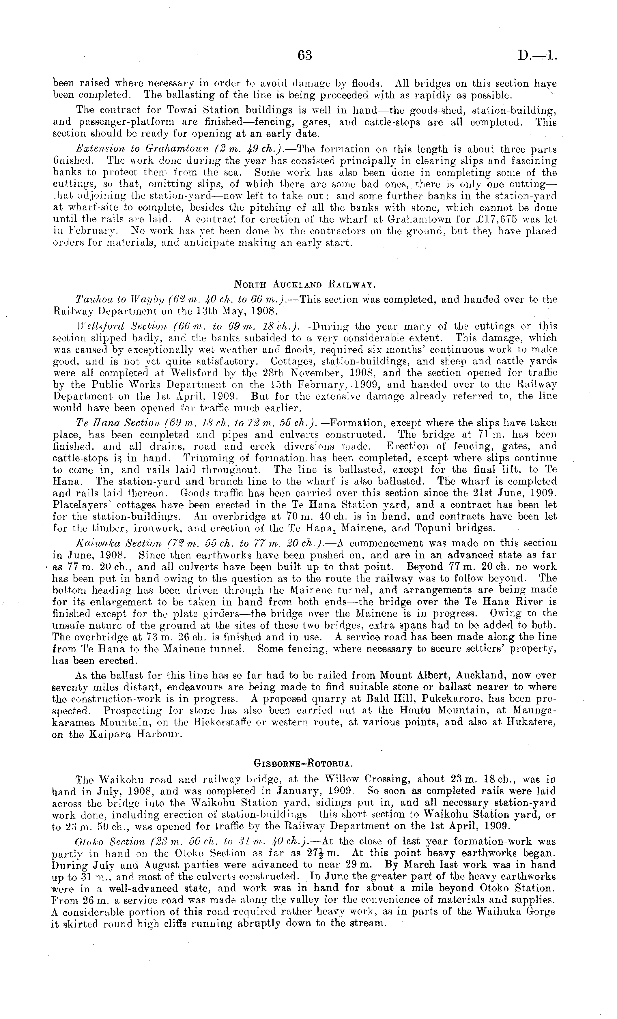 been raised where necessary in order to avoid damage by floods. All bridges on this section have been completed. The ballasting of the line is being proceeded with as rapidly as possible. The contract for Towai Station buildings is well in hand —the goods-shed, station-building, and passenger-platform are finished—fencing, gates, and cattle-stops are all completed. This section should be ready for opening at an early date. Extension to Grahamtown (2 m. If9ch.). —The formation on this length is about three parts finished. The work done during the year has consisted principally in clearing slips and fascining banks to protect them from the sea. Some work lias also been done in completing some of the cuttings, so that, omitting slips, of which there are some bad ones, there is only one cutting— that adjoining the station-yard—now left to take out; and some further banks in the station-yard at wharf-site to complete, besides the pitching of all the banks with stone, which cannot be done until the rails are laid. A contract for erection of the wharf at Grahamtown for £17,675 was let in February. No work has yet been done by the contractors on the ground, but they have placed orders for materials, and anticipate making an early start. North Auckland Railway. Tauhoa to Wayby (62 m. J r o eh. to 66 m.). —This section was completed, and handed over to the Railway Department on the 13th May, 1908. Wellsford Section (66 m. to 69 m. 18 eh.). —During the year many of the cuttings on this section slipped badly, and the banks subsided to a very considerable extent. This damage, which was caused by exceptionally wet weather and floods, required six months' continuous work to make good, and is not yet quite satisfactory. Cottages, station-buildings, and sheep and cattle yards were all completed at Wellsford by the 28th November, 1908, and the section opened for traffic by the Public Works Department on the 15th February, .1909, and handed over to the Railway Department on the Ist April, 1909. But for the extensive damage already referred to, the line would have been opened for traffic much earlier. Te Hana Section (69 m. 18 eh. to 72 m. 55 eh.). —Formation, except where the slips have taken place, has been completed and pipes and culverts constructed. The bridge at 71 m. has been finished, and all drains, road and creek diversions made. Erection of fencing, gates, and cattle-stops is. in hand. Trimming of formation has been completed, except where slips continue to come in, and rails laid throughout. The line is ballasted, except for the final lift, to Te Hana. The station-yard and branch line to the wharf is also ballasted. The wharf is completed and rails laid thereon. Goods traffic has been carried over this section since the 21st June, 1909. cottages have been erected in the Te Hana Station yard, and a contract has been let for the station-buildings. An overbridge at 70 m. 40 eh. is in hand, and contracts have been let for the timber, ironwork, and erection of the Te Hanaj Mainene, and Topuni bridges. Kaiwaka Section (72 m. 55 eh. to 77 m. 20 eh.). —A commencement was made on this section in June, 1908. Since then earthworks have been pushed on, and are in an advanced state as far as 77 m. 20 eh., and all culverts have been built up to that point. Beyond 77 m. 20 eh. no work has been put in hand owing to the question as to the route the railway was to follow beyond. The bottom heading has been driven through the Mainene tunnel, and arrangements are being made for its enlargement to be taken in hand from both ends—the bridge over the Te Hana River is finished except for the plate girders—the bridge over the Mainene is in progress. Owing to the unsafe nature of the ground at the sites of these two bridges, extra spans had to be added to both. The overbridge at 73 m. 26 eh. is finished and in use. A service road has been made along the line from Te Hana to the Mainene tunnel. Some fencing, where necessary to secure settlers' property, has been erected. As the ballast for this line has so far had to be railed from Mount Albert, Auckland, now over seventy miles distant, endeavours are being made to find suitable stone or ballast nearer to where the construction-work is in progress. A proposed quarry at Bald Hill, Pukekaroro, has been prospected. Prospecting for stone has also been carried out at the Houtu Mountain, at Maungakaramea Mountain, on the Bickerstaffe or western route, at various points, and also at Hukatere, on the Kaipara Harbour. Gisborne-Rotorua. The Waikohu road and railway bridge, at the Willow Crossing, about 23m. 18ch., was in hand in July, 1908, and was completed in January, 1909. So soon as completed rails were laid across the bridge into the W T aikohu Station yard, sidings put in, and all necessary station-yard work done, including erection of station-buildings—this short section to Waikohu Station yard, or to 23 m. 50 eh., was opened for traffic by the Railway Department on the Ist April, 1909. Otoko Section (23 m,. 50 eh. to Sim. eh.). —At the close of last year formation-work was partly in hand on the Otoko Section as far as 27i m. At this point heavy earthworks began. During July and August parties were advanced to near 29 m. By March last work was in hand up to 31 m., and most of the culverts constructed. In June the greater part of the heavy earthworks were in a well-advanced state, and work was in hand for about a mile beyond Otoko Station. From 26 m. a service road was made along the valley for the convenience of materials and supplies. A considerable portion of this road required rather heavy work, as in parts of the Waihuka Gorge it skirted round high cliffs running abruptly down to the stream.