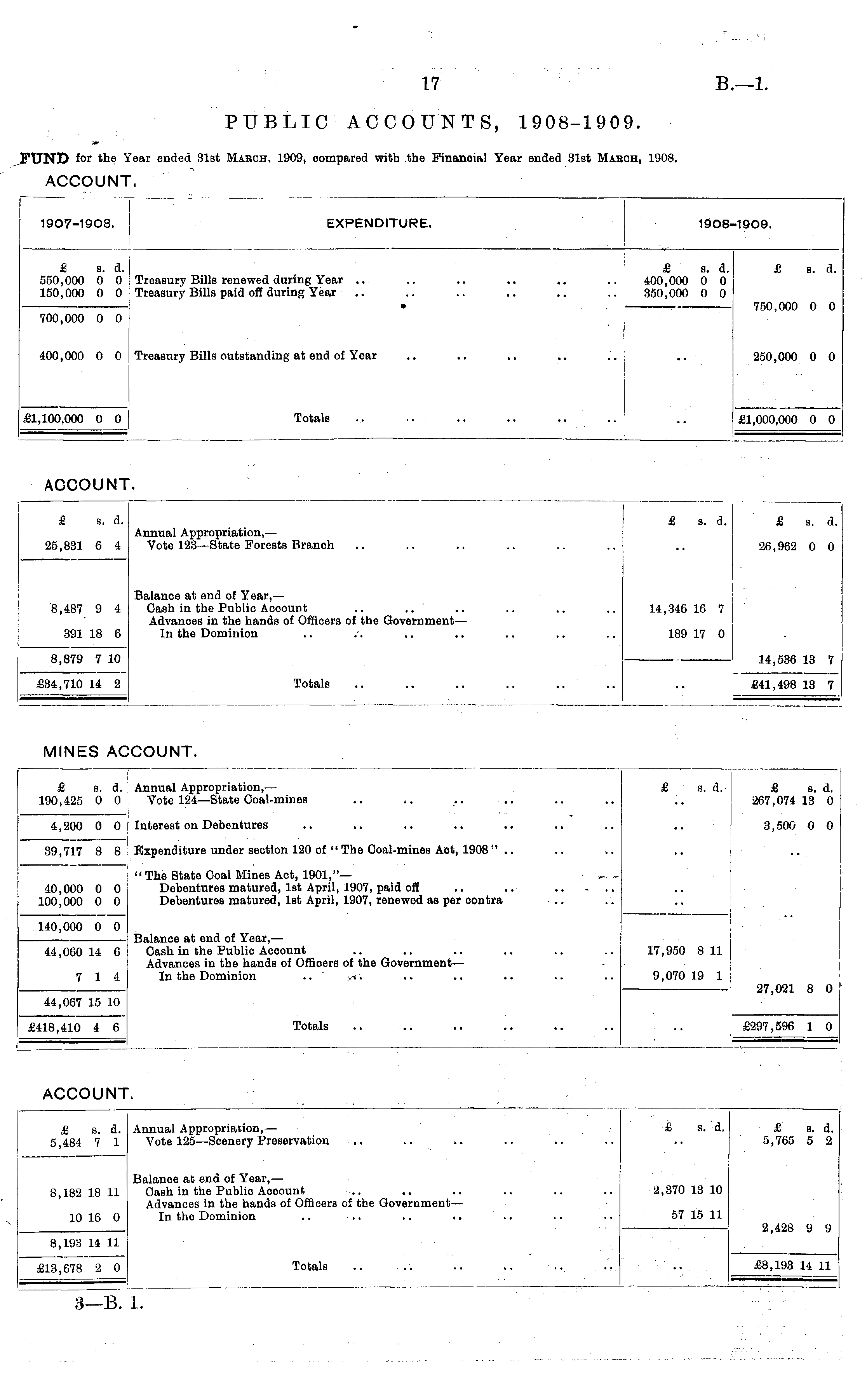 1907-1908. EXPENDITURE. 1908-1909. £ s. d. 550,000 0 0 150,000 0 0 Treasury Bills renewed during Year .. Treasury Bills paid off during Year £ s. d. 400,000 0 0 350,000 0 0 £ s. d. • 750,000 0 0 700,000 0 0 | 400,000 0 0 Treasury Bills outstanding at end of Year 250,000 0 0 £1,100,000 0 0 Totals £1,000,000 0 0 ACCOUNT. £ s. d. £ s. d. £ s. d. 25,831 6 4 Annual Appropriation,— Vote 123—State Forests Branch 26,962 0 0 8,487 9 4 Balance at end of Year, — Cash in the Public Aooount .. .. Advances in the hands of Officers of the Government — In the Dominion 14,346 16 7 391 18 6 189 17 0 8,879 7 10 14,536 13 7 £34,710 14 2 Totals £41,498 13 7 MINES A COUNT. £ s. d. 190,425 0 0 Annual Appropriation,— Vote 124—State Coal-mines £ s. d. £ s. d. 267,074 13 0 3,500 0 0 4,200 0 0 Interest on Debentures 39,717 8 8 Expenditure under section 120 of " The Coal-mines Act, 1908 " .. 40,000 0 0 100,000 0 0 " The State Coal Mines Act, 1901,"— Debentures matured, 1st April, 1907, paid off Debentures matured, 1st April, 1907, renewed as per contra 140,000 0 0 44,060 14 6 Balance at end of Year, — Cash in the Public Account Advances in the hands of Offioers of the Government— In the Dominion .. ' 17,950 8 11 j 7 14 9,070 19 1 27,021 8 0 44,067 15 10 Totals £418,410 4 6 £297,596 1 0 ACCOUNT. £ s. d. 5,484 7 1 Annual Appropriation,— Vote 125 —Scenery Preservation £ s. d. £ a. d. 5,765 5 2 8,182 18 11 Balance at end of Year, — Cash in the Publio Aooount Advances in the hands of Offioers of the Government— In the Dominion 2,370 13 10 10 16 0 57 15 11 2,428 9 9 8,193 14 11 £13,678 2 0 Totals £8,193 14 11 3—B. 1.