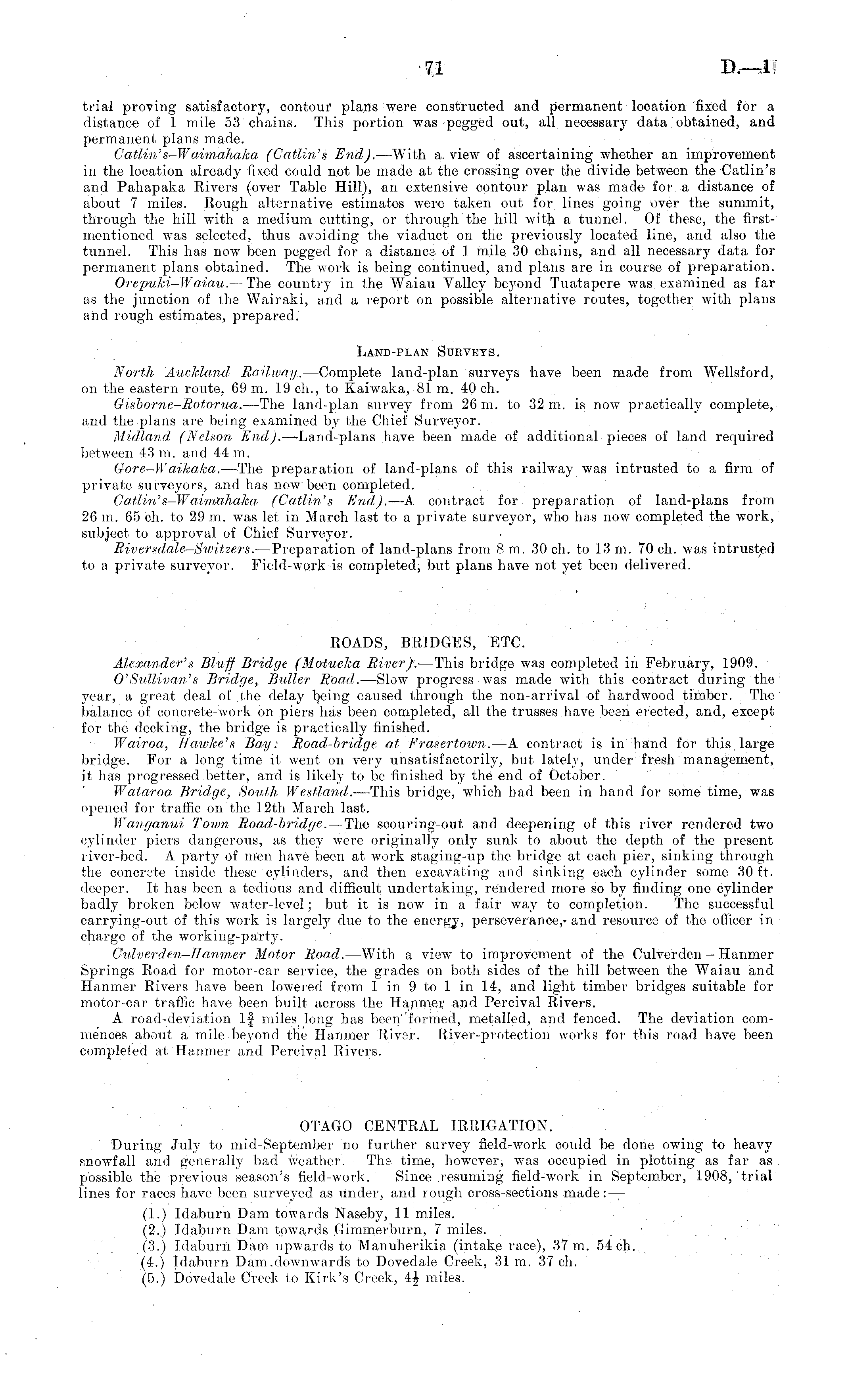 trial proving satisfactory, contour plans were constructed and permanent location fixed for a distance of 1 mile 53 chains. This portion was pegged out, all. necessary data obtained, and permanent plans made. Catlin's—Waimahaka (Catlin's End). —With a. view of ascertaining whether an improvement in the location already fixed could not be made at the crossing over the divide between the Catlin's and Pahapaka Rivers (over Table Hill), an extensive contour plan was made for a distance of about 7 miles. Rough alternative estimates were taken out for lines going over the summit, through the hill with a medium cutting, or through the hill with a tunnel. Of these, the firstmentioned was selected, thus avoiding the viaduct on the previously located line, and also the tunnel. This has now been pegged for a distance of 1 mile 30 chains, and all necessary data for permanent plans obtained. The work is being continued, and plans are in course of preparation. Orepuki—Waiau. —The country in the Waiau Valley beyond Tuatapere was examined as far as the junction of the Wairaki, and a report on possible alternative routes, together with plans and rough estimates, prepared. Land-plan Surveys. North Auckland Railway. —Complete land-plan surveys have been made from Wellsford, on the eastern route, 69 m. 19 eh., to Kaiwaka, 81 m. 40 eh. Gisborne-Rotorua. —Tbe land-plan survey from 26 m. to 32 m. is now practically complete, and the plans are being examined by the Chief Surveyor. Midland, (Nelson End). —-Land-plans have been made of additional pieces of land required between 43 m. and 44 m. Gore-Waikaka. —The preparation of land-plans of this railway was intrusted to a firm of private surveyors, and has now been completed. Catlin's—Waimahaka (Catlin's End). —A. contract for preparation of land-plans from 26 m. 65 eh. to 29 m. was let in March last to a private surveyor, who ha.s now completed the work, subject to approval of Chief Surveyor. Riversdale-Switzers. —Preparation of land-plans from 8 m. 30 eh. to 13 m. 70 eh. was intrusted to a private surveyor. Field-work is completed, but plans have not yet been delivered. ROADS, BRIDGES, ETC. Alexander's Bluff Bridge (Motueka River). —This bridge was completed in February, 1909. O'Sullivan's Bridge, Buller Road. —Slow progress was made with this contract during the year, a great deal of the delay being caused through the non-arrival of hardwood timber. The balance of concrete-work on piers has been completed, all the trusses have been erected, and, except for the decking, the bridge is practically finished. Wairoa, Hawke's Bay: Road-bridge at Frasertown. —A contract is in hand for this large bridge. For a long time it went on very unsatisfactorily, but lately, under fresh management, it has progressed better, and is likely to be finished by the end of October. Wataroa Bridge, South Westland. —This bridge, which had been in hand for some time, was opened for traffic on the 12th March last. Wanganui Town Road-bridge. —The scouring-out and deepening of this river rendered two cylinder piers dangerous, as they were originally only sunk to about the depth of the present river-bed. A party of men have been at work staging-tip the bridge at each pier, sinking through the concrete inside these cylinders, and then excavating and sinking each cylinder some 30 ft. deeper. It has been a tedious and difficult undertaking, rendered more so by finding one cylinder badly broken below water-level; but it is now in a fair way to completion. The successful carrying-out of this work is largely due to the energy, perseverance,, and resource of the officer in charge of the working-party. Gulverden—Hanmer Motor Road,. —With a view to improvement of the Culverden - Hanmer Springs Road for motor-car service, the grades on both sides of the hill between the Waiau and Hanmer Rivers have been lowered from 1 in 9 to 1 in 14, and light timber bridges suitable for motor-car traffic have been built across the Hanmer and Percival Rivers. A road-deviation If miles long has been'''formed, metalled, and fenced. The deviation commences about a mile beyond the Hanmer River. River-protection works for this road have been completed at Hanmer and Percival Rivers. OTAGO CENTRAL IRRIGATION. During July to mid-September no further survey field-work could be done owing to heavy snowfall and generally bad weather. The time, however, was occupied in plotting as far as possible the previous season's field-work. Since resuming field-work in September, 1908, trial lines for races have been surveyed as under, and rough cross-sections made: — (1.) Idaburn Dam towards Naseby, 11 miles. (2..) Idaburn Dam towards Gimmerburn, 7 miles. (3.) Idaburn Dam upwards to Manuherikia (intake race), 37 m. 54 eh. (4.) jdaburn Dam.downwards to Dovedale Creek, 31 m. 37 eh. (5.) Dovedale Creek to Kirk's Creek, 4J miles.