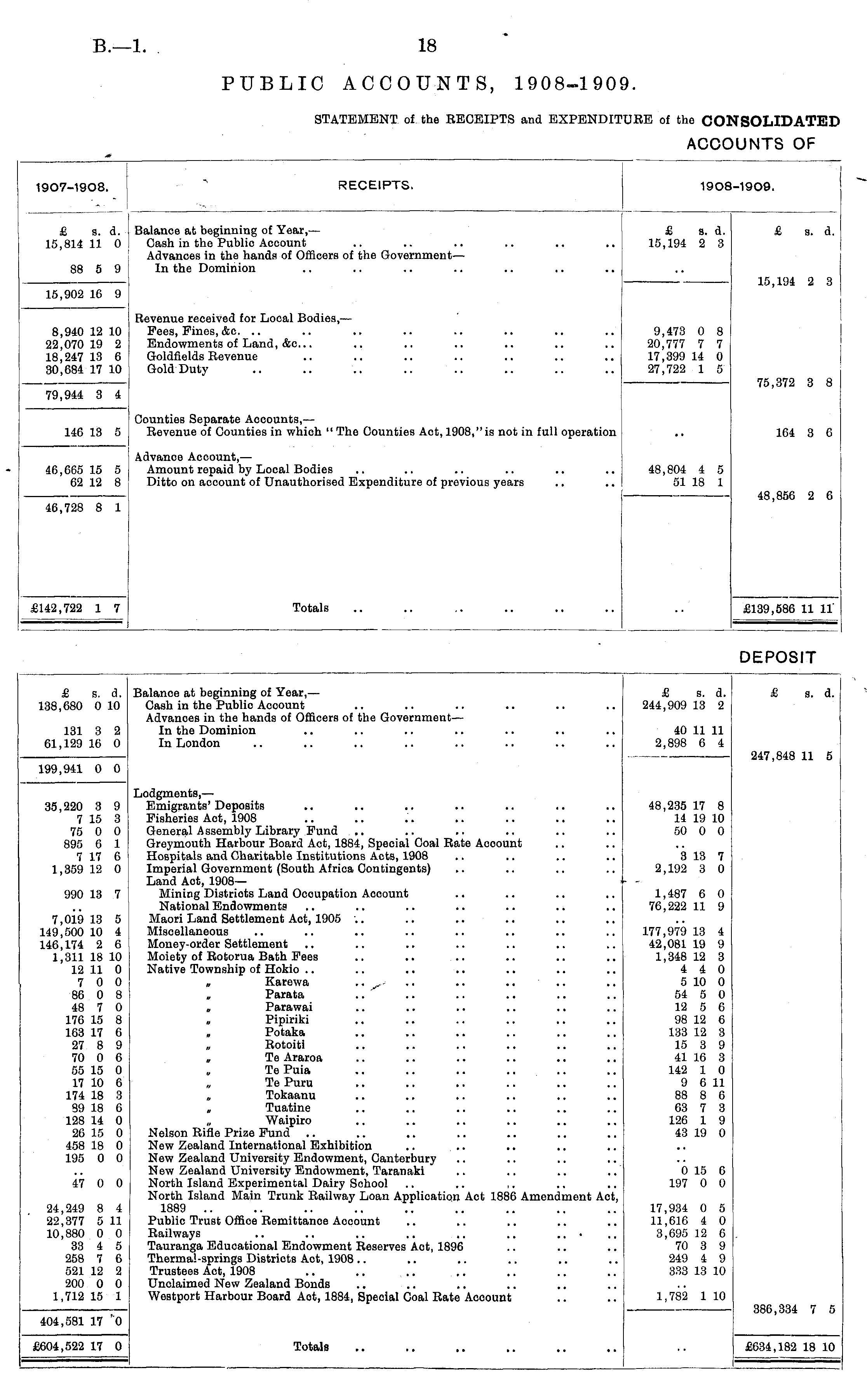 1907-1908. RECEIPTS. 1901 1-1909. £ s. d. 15,814 11 0 88 5 9 Balance at beginning of Year, — Cash in the Public Account Advances in the hands of Officers of the Government— In the Dominion £ s. d. 15,194 2 3 £ s. d. 15,194 2 3 15,902 16 9 Revenue received for Local Bodies, — Fees, Fines, &c. Endowments of Land, &c.. Goldfields Revenue Gold Duty 8,940 12 10 22,070 19 2 18,247 13 6 30,684 17 10 79,944 3 4 9,473 0 8 20,777 7 7 17,399 14 0 27,722 1 5 75,372 3 8 Counties Separate Accounts, — Revenue of Counties in which " The Counties Act, 1908," is not in full operation 164 3 6 146 13 5 46,665 15 5 62 12 8 Advance Account, — Amount repaid by Local Bodies Ditto on account of Unauthorised Expenditure of previous years 48,804 4 5 51 18 1 48,856 2 6 46,728 8 1 Totals £142,722 1 7 £139,586 11 11" DEPOSIT £ s. d. 138,680 0 10 131 3 2 61,129 16 0 Balanoe at beginning of Year, — Cash in the Publio Account Advanoes in the hands of Officers of the Government— In the Dominion In London £ s. d. 244,909 13 2 40 11 11 2,898 6 4 £ s. d. 247,848 11 5 199,941 0 0 Lodgments, — Emigrants' Deposits Fisheries Aot, 1908 General Assembly Library Fund Greymouth Harbour Board Aot, 1884, Special Coal Rate Acoount Hospitals and Charitable Institutions Acts, 1908 Imperial Government (South Africa Contingents) Land Aot, 1908— Mining Distriots Land Occupation Acoount National Endowments Maori Land Settlement Act, 1905 Miscellaneous Money-order Settlement Moiety of Rotorua Bath Fees Native Township of Hokio .. „ Karewa .. Parata „ Parawai „ Pipiriki , Potaka „ Rotoiti „ Te Araroa Te Puia Te Puru „ Tokaanu . Tuatine „ Waipiro Nelson Rifle Prize Fund New Zealand International Exhibition New Zealand University Endowment, Canterbury New Zealand University Endowment, Taranaki North Island Experimental Dairy School North Island Main Trunk Railway Loan Application Act 1886 Amendment Act, 1889 .. Public Trust Office Remittance Account Railways .. .. .. .. .. .. .. • Tauranga Educational Endowment Reserves Aot, 1896 Thermal-springs Districts Act, 1908 .. Trustees Act, 1908 Unclaimed New Zealand Bonds Westport Harbour Board Aot, 1884, Speoial Coal Rate Account 35,220 8 9 7 15 3 75 0 0 895 6 1 7 17 6 1,359 12 0 48,235 17 8 14 19 10 50 0 0 3 13 7 2,192 3 0 990 13 7 1,487 6 0 76,222 11 9 7,019 13 5 149,500 10 4 146,174 2 6 1,311 18 10 12 11 0 7 0 0 86 0 8 48 7 0 176 15 8 163 17 6 27 8 9 70 0 6 55 15 0 17 10 6 174 18 3 89 18 6 128 14 0 26 15 0 458 18 0 195 0 0 177,979 13 4 42,081 19 9 1,348 12 3 4 4 0 5 10 0 54 5 0 12 5 6 98 12 6 133 12 3 15 3 9 41 16 3 142 1 0 9 6 11 88 8 6 63 7 3 126 1 9 43 19 0 47 0 0 0 15 6 197 0 0 24,249 8 4 22,377 5 11 10,880 0 0 33 4 5 258 7 6 521 12 2 200 0 0 1,712 15 1 17,934 0 5 11,616 4 0 3,695 12 6 70 3 9 249 4 9 333 13 10 1,782 1 10 386,334 7 5 404,581 17 0 Totals £604,522 17 0 £634,182 18 10