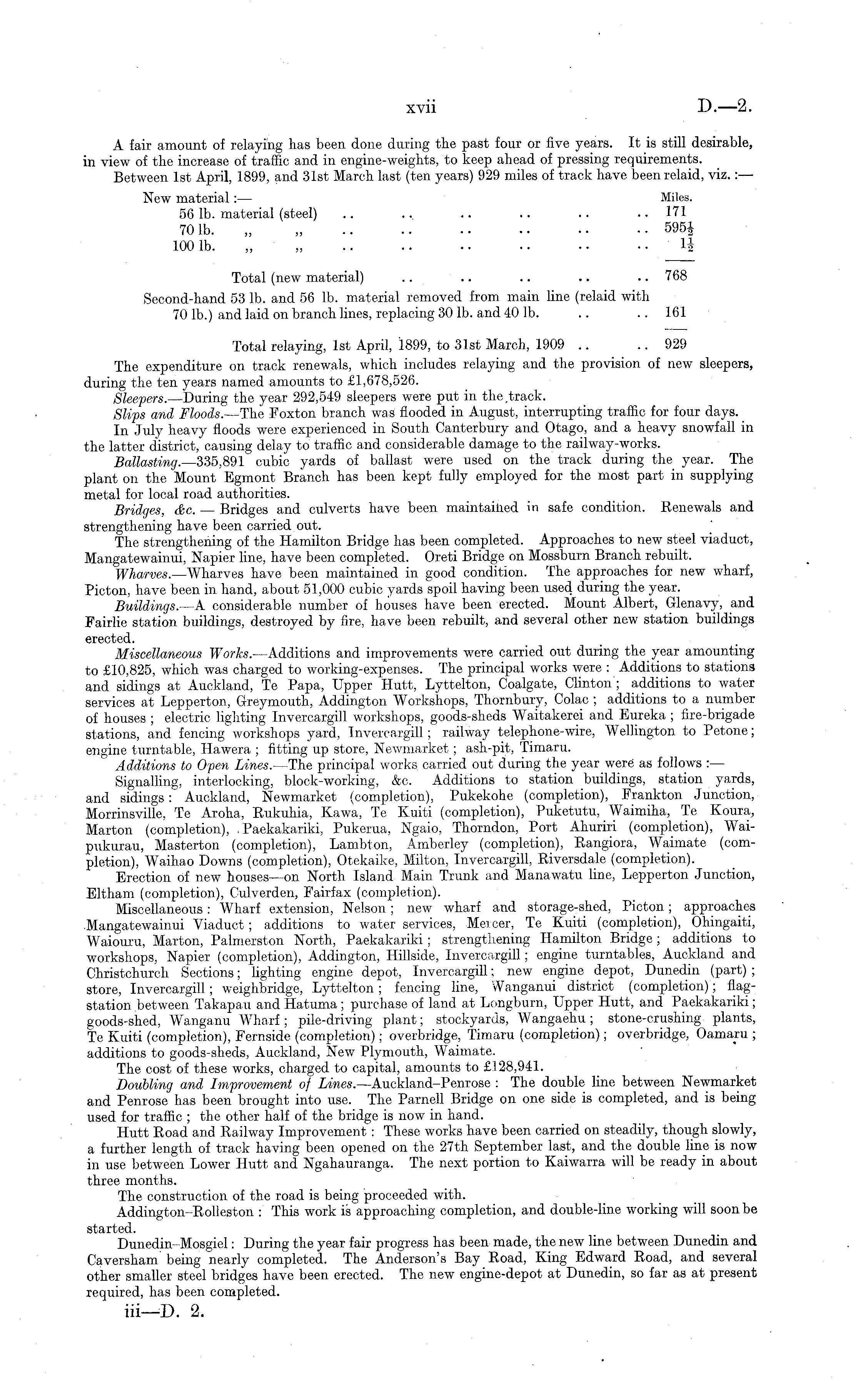 A fair amount of relaying has been done during the past four or five years. It is still desirable, in view of the increase of traffic and in engine-weights, to keep ahead of pressing requirements. Between Ist April, 1899, and 31st March last (ten years) 929 miles of track have beenrelaid, viz.: — New material : — Miles. 56 lb. material (steel) .. .. .. .. .. .. 171 701b. „ .. •■ •• •• •• •• 5954 100 Ib. „„ H Total (new material) .. .. .. .. .. 768 Second-hand 53 lb. and 56 lb. material removed from main line (relaid with 70 lb.) and laid on branch lines, replacing 30 lb. and 40 lb. .. .. 161 Total relaying, Ist April, 1899, to 31st March, 1909 .. .. 929 The expenditure on track renewals, which includes relaying and the provision of new sleepers, during the ten years named amounts to £1,678,526. Sleepers. —During the year 292,549 sleepers were put in the .track. Slips and Floods. —The Foxton branch was flooded in August, interrupting traffic for four days. In July heavy floods were experienced in South Canterbury and Otago, and a heavy snowfall in the latter district, causing delay to traffic and considerable damage to the railway-works. Ballasting. —33s,B9l cubic yards of ballast were used on the track during the year. The plant on the Mount Egmont Branch has been kept fully employed for the moat part in supplying metal for local road authorities. Bridges, &c. — Bridges and culverts have been maintained in safe condition. Renewals and strengthening have been carried out. The strengthening of the Hamilton Bridge has been completed. Approaches to new steel viaduct, Mangatewainui, Napier line, have been completed. Oreti Bridge on Mossburn Branch rebuilt. Wharves. —Wharves have been maintained in good condition. The approaches for new wharf, Picton, have been in hand, about 51,000 cubic yards spoil having been used during the year. Buildings. —A considerable number of houses have been erected. Mount Albert, Glenavy, and Fairlie station buildings, destroyed by fire, have been rebuilt, and several other new station buildings erected. Miscellaneous Works. —Additions and improvements were carried out during the year amounting to £10,825, which was charged to working-expenses. The principal works were : Additions to stations and sidings at Auckland, Te Papa, Upper Hutt, Lyttelton, Coalgate, Clinton'; additions to water services at Lepperton, Greymouth, Addington Workshops, Thornbury, Colac ; additions to a number of houses ; electric lighting Invercargill workshops, goods-sheds Waitakerei and Eureka ; fire-brigade stations, and fencing workshops yard, Invercargill; railway telephone-wire, Wellington to Petone; engine turntable, Hawera ; fitting up store, Newmarket ; ash-pit, Timaru. Additions to Open Lines. —The principal works carried out during the year were as follows : — Signalling, interlocking, block-working, &c. Additions to station buildings, station yards, and sidings: Auckland, Newmarket (completion), Pukekohe (completion), Frankton Junction, Morrinsville, Te Aroha, Rukuhia, Kawa, Te Kuiti (completion), Puketutu, Waimiha, Te Koura, Marton (completion), , Paekakariki, Pukerua, Ngaio, Thorndon, Port Ahuriri (completion), Waipukurau, Masterton (completion), Lambton, Amberley (completion), Eangiora, Waimate (completion), W T aihao Downs (completion), Otekaike, Milton, Invercargill, Riversdale (completion). Erection of new houses—on North Island Main Trunk and Manawatu line, Lepperton Junction, Eltham (completion), Culverden, Fairfax (completion). Miscellaneous: Wharf extension, Nelson; new wharf and storage-shed, Picton; approaches Mangatewainui Viaduct; additions to water services, Mα cer, Te Kuiti (completion), Ohingaiti, Waiouru, Marton, Palmerston North, Paekakariki; strengthening Hamilton Bridge; additions to workshops, Napier (completion), Addington, Hillside, Invercargill ; engine turntables, Auckland and Christchurch Sections; lighting engine depot, Invercargill; new engine depot, Dunedin (part) ; store, Invercargill; weighbridge, Lyttelton; fencing line, Wanganui district (completion); flagstation between Takapau and Hatuma ; purchase of land at Longburn, Upper Hutt, and Paekakariki; goods-shed, Wanganu Wharf; pile-driving plant; stockyards, Wangaehu; stone-crushing plants, Te Kuiti (completion), Fernside (completion); overbridge, Timaru (completion); overbridge, Oamaru ; additions to goods-sheds, Auckland, New Plymouth, Waimate. The cost of these works, charged to capital, amounts to £128,941. Doubling and Improvement of Lines. —Auckland-Penrose : The double line between Newmarket and Penrose has been brought into use. The Parnell Bridge on one side is completed, and is being used for traffic ; the other half of the bridge is now in hand. Hutt Road and Railway Improvement : These works have been carried on steadily, though slowly, a further length of track having been opened on the 27th September last, and the double line is now in use between Lower Hutt and Ngahauranga. The next portion to Kaiwarra will be ready in about three months. The construction of the road is being proceeded with. Addington-Rolleston : This work is approaching completion, and double-line working will soon be started. Dunedin-Mosgiel: During the year fair progress has been made, the new line between Dunedin and Caversham being nearly completed. The Anderson's Bay Road, King Edward Road, and several other smaller steel bridges have been erected. The new engine-depot at Dunedin, so far as at present required, has been completed.