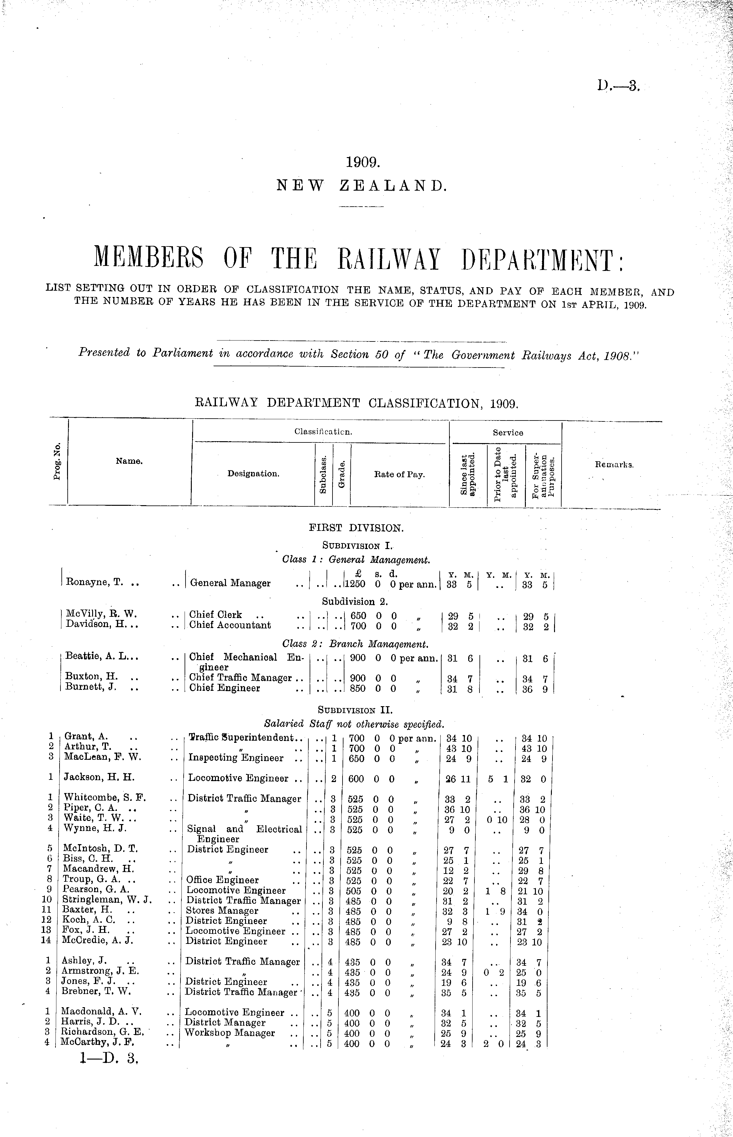 Classification. Service 0 *- M O CM Name. Designation. co oj £ "B cd ce § . Rate of Pay. II I I lis it as! 9 9* 8 a n = S S ft -° a 3 a a o3ca g ,3 c^caft Remarks. FIRST DIVISION. Subdivision I. ! Ronayne, T. .. Class 1 : General Management. I £ 8. d. I y. M. | Y. M. I Y. M. .. | General Manager .. | .. I .. |l250 0 0 per ann. | 33 5 | .. I 33 5 j Subdivision 2. | McVilly, R. W. | Davidson, H. .. .. I Chief Clerk .. .. | . .j . .1 650 0 0 „ I 29 5 .. i 29 5 j .. I Chief Accountant .. | .. | .. | 700 0 0 „ | 32 2 32 2 | Beattie, A. L... Buxton, H. Burnett, J. Class 2: Branch Management. . . Chief Mechanical En- .. .. 900 0 0 per ann. 31 6 .. 31 6 gineer .. Chief Traffic Manager 900 0 0 „ 34 7 .. 34 7 .. Chief Engineer 850 0 0 „ 31 8 .. 36 9 Subdivision II. Salaried Staff not otherwise specified. 1 2 3 Grant, A. Arthur, T. MacLean, P. W. .. Traffic Superintendent.. ..1 700 0 0 per ann. 34 10 .. 34 10 .... 1 700 0 0 „ 43 10 43 10 .. Inspecting Engineer .. .. 1 650 0 0 „ 24 9 .. 24 9 1 Jackson, H. H. .. Locomotive Engineer .. .. 2 600 0 0 „ 26 11 5 1 32 0 5 1 1 2 3 4 Whitcombe, S. P. Piper, CA. Waite, T. W. .. Wynne, H. J. Mcintosh, D. T. Biss, 0. H. .. Macandrew, H. Troup, G. A. Pearson, G. A. Stringleman, W. J. Baxter, H. Koch, A. 0. Pox, J. H. McCredie, A. J. .. Distriot Traffic Manager .. 3 525 0 0 „ 33 2 .. 33 2 .. 3 525 0 0 36 10 36 10 .. 3 525 0 0 „ 27 2 0 10 28 0 .. Signal and Electrical .. 3 525 0 0 „ 9 0 .. 9 0 Engineer .. District Engineer .... 3 525 0 0 „ 27 7 .. 27 7 .... 3 525 0 0 „ 25 1 25 1 .... 3 525 0 0 „ 12 2 29 8 .. Offioe Engineer .... 3 525 0 0 „ 22 7 .. 22 7 .. Locomotive Engineer .. 3 505 0 0 „ 20 2 1 8 21 10 .. District Traffic Manager .. 3 485 0 0 „ 31 2 .. 31 2 .. Stores Manager .... 3 485 0 0 „ 32 3 1 9 34 0 .. District Engineer .... 3 485 0 0 „ 98.. 31 2 .. Locomotive Engineer .. .. 3 485 0 0 , 27 2 .. 27 2 .. District Engineer .... 3 485 0 0 „ 23 10 .. 23 10 010 5 6 7 8 9 10 .1 .2 .3 4 1*8 1 *9 1 2 3 4 Ashley, J. Armstrong, J, E. Jones, P. J. Brebner, T. W. .. District Traffic Manager .. 4 435 0 0 „ 34 7 .. 34 7 .. 4 435 0 0 24 9 0 2 25 0 .. District Engineer .... 4 435 0 0 „ 19 6 .. 19 6 .. District Traffio Manager • .. 4 435 0 0 „ 35 5 .. 35 5 0* 2 .1 2 3 4 Macdonald, A. V. Harris, J. D. .. Riohardson, G. E. McCarthy, J. P. .. Locomotive Engineer .... 5 400 0 0 „ 34 1 .. 34 1 .. District Manager .... 5 400 0 0 „ 32 5 .. 32 5 .. Workshop Manager .. .. 5 400 0 0 „ 25 9 .. 25 9 .... 5 ] 400 0 0 „ I 24 3 I 2 0 24 3 2"o