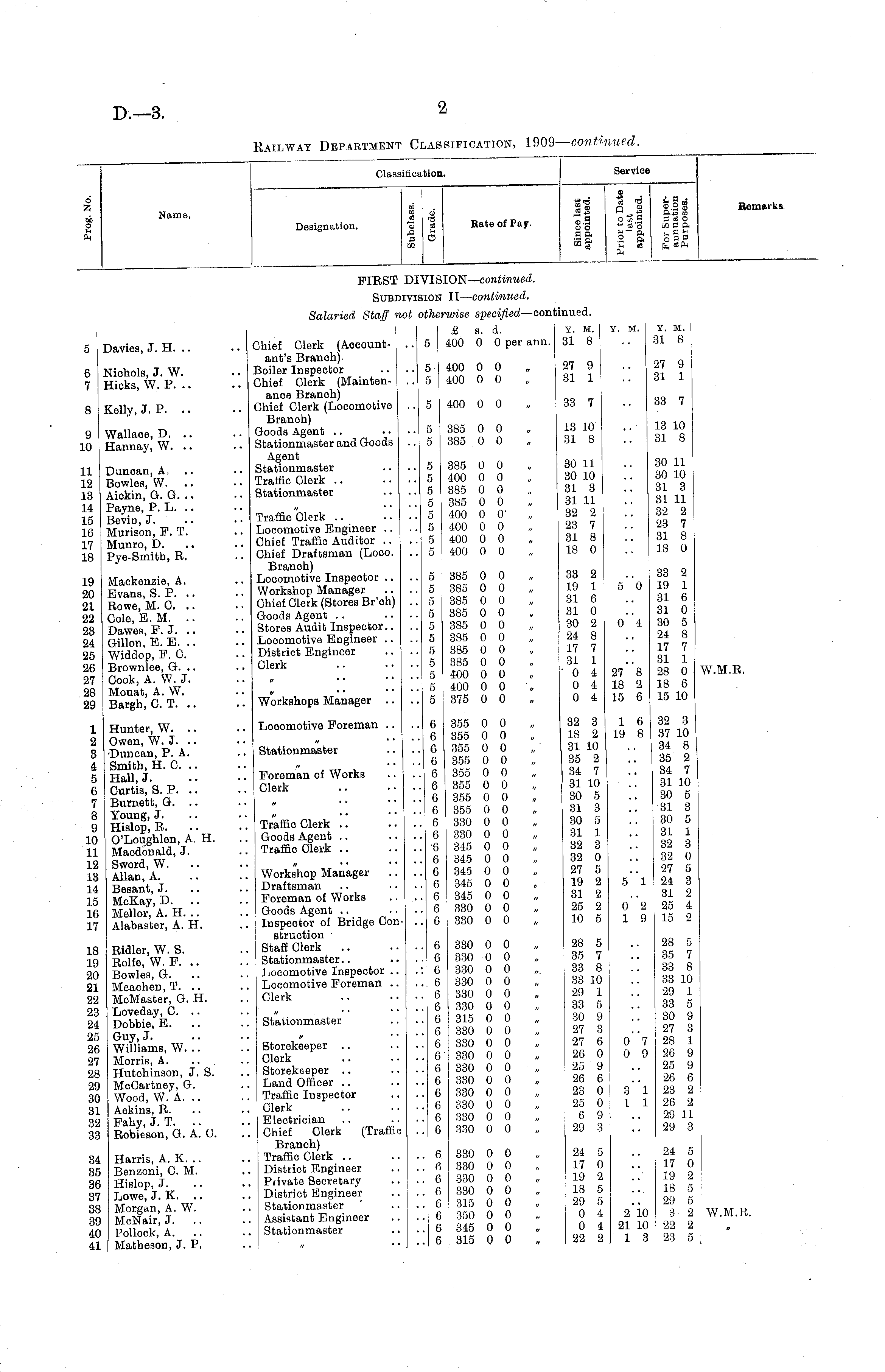 Classification. Servioe 6 Z CD O 44 ft Name. Designation. 2 __ _ _ 03 Rate of Pay. S15 £2 3.9 _ O 0 & 9 ce "B it 9 co fl 8 2 -2 ™ M 3- ft43 CO ouS 9 a ce o 43 ce'o 03 b a ■t~ a c«» ■2 a o a a c a fa ceft ft Remarks FIRST : DlVIi !SION — continued. Subdi IIVISIOI ns II— continued. Salaried Staff nc lot othi lerwise specified —ooni £ 8. d. 400 0 0 per ann. iinued. y. m. 31 8 Y. M. Y. M. 31 8 5 6 7 8 Davies, J. H. Nichols, J. W. Hicks, W. P. Kelly, J. P. ••! Chief Clerk (Accountant's Branch) Boiler Inspector Chief Clerk (Maintenance Branch) Chief Clerk (Locomotive Branch) Goods Agent Stationmaster and Goods Agent Stationmaster Traffic Clerk Stationmaster 5 5 5 5 400 0 0 400 0 0 400 0 0 27 9 31 1 33 7 13 10 31 8 27 9 31 1 33 7 13 10 31 8 9 10 Wallaoe, D. .. Hannay, W. .. 5 5 385 0 0 385 0 0 11 12 13 14 15 16 17 18 Dunoan, A, Bowles, W. Aickin, G. G. .. Payne, P. L. Bevin, J. Murison, F. T. Munro, D. Pye-Smith, R. Traffic Clerk .. Locomotive Engineer .. Chief Traffic Auditor .. Chief Draftsman (Looo. Branch) Locomotive Inspector .. Workshop Manager Chief Clerk (Stores Br'oh) Goods Agent Stores Audit Inspector.. Locomotive Engineer .. Distriot Engineer Clerk 5 5 5 5 5 5 5 5 385 0 0 400 0 0 385 0 0 385 0 0 400 0 0' 400 0 0 , 400 0 0 ; 400 o o 30 11 30 10 31 3 31 11 32 2 23 7 31 8 18 0 30 11 30 10 31 3 31 11 32 2 23 7 31 8 18 0 19 20 21 22 23 24 25 26 27 28 29 Mackenzie, A. Evans, S. P. Rowe, M. 0. Cole, E. M. .. Dawes, P. J. Gillon, E. E. .. Widdop, P. C. Brownlee, G. .. Cook, A. W. J. Mouat, A. W. Bargh, C.T. 5 5 5 5 5 5 5 5 5 5 5 1 385 0 0 1 385 0 0 1 385 0 0 1 385 0 0 i 385 0 0 i 385 0 0 i 385 0 0 i 385 0 0 i 400 0 0 i 400 0 0 i 375 0 0 33 2 19 1 31 6 31 0 30 2 24 8 17 7 31 1 " 0 4 0 4 0 4 5 "o 0 '.4 27 **8 18 2 15 6 33 2 19 1 31 6 31 0 30 5 24 8 17 7 31 1 28 0 18 6 15 10 W.M.R. Workshops Manager .. 1 2 3 4 5 6 7 8 9 10 11 12 13 14 15 16 17 Hunter, W. .. Owen, W. J. .. Duncan, P. A. Smith, H. O. Hall, J. Curtis, S. P. Burnett, G. .. Young, J. Hislop, R. O'Loughlen, A. H. Macdonald, J. Sword, W. Allan, A. Besant, J. McKay, D. Mellor, A. H. .. Alabaster, A. H. Looomotive Foreman .. Stationmaster Foreman of Works Clerk Traffic Clerk .. Goods Agent Traffic Clerk 6 6 6 6 6 6 6 6 6 6 '6 6 6 6 6 6 6 i 355 0 0 5 355 0 0 3 355 0 0 3 355 0 0 3 355 0 0 3 355 0 0 6 355 0 0 6 355 0 0 6 330 0 0 6 330 0 0 8 345 0 0 6 345 0 0 6 345 0 0 6 345 0 0 6 345 0 0 6 330 0 0 6 330 0 0 32 3 18 2 31 10 35 2 34 7 31 10 30 5 31 3 30 5 31 1 32 3 32 0 27 5 19 2 31 2 25 2 10 5 1 6 19 8 5 "l 0 2 1 9 32 3 37 10 34 8 35' 2 34 7 31 10 30 5 31 3 30 5 31 1 32 3 32 0 27 5 24 3 31 2 25 4 15 2 Workshop Manager Draftsman Foreman of Works Goods Agent Inspector of Bridge Construction - Staff Clerk Stationmaster.. Locomotive Inspector .. Locomotive Foreman .. Clerk 28 5 35 7 33 8 33 10 29 1 33 5 30 9 27 3 27 6 26 0 25 9 26 6 23 0 25 0 6 9 29 3 0*7 0 9 3 "l 1 1 28 5 35 7 33 8 33 10 29 1 33 5 30 9 27 3 28 1 26 9 25 9 26 6 23 2 26 2 29 11 ! 29 3 18 19 20 21 22 23 24 25 26 27 28 29 30 31 32 33 Ridler, W. S. Rolfe, W. P. Bowles, G. Meachen, T. .. McMaster, G. H. Loveday, 0. .. Dobbie, E. Guy, J. Williams, W. .. Morris, A. Hutchinson, J. S. MoCartney, G. Wood, W. A. .. Aekins, R. Pahy, J. T. Robieson, G. A. O. Stationmaster Storekeeper Clerk Storekeeper Land Officer Traffic Inspector Clerk Electrician Chief Clerk (Traffic Branch) Traffic Clerk Distriot Engineer Private Secretary District Engineer Stationmaster Assistant Engineer , Stationmaster . 6 . 6 : 6 . 6 . 6 . 6 . 6 . 6 . 6 . 6 . 6 . 6 . 6 . 6 . 6 . 6 6 330 0 0 6 330 0 0 6 330 0 0 6 330 0 0 6 330 0 0 6 330 0 0 6 315 0 0 6 330 0 0 6 330 0 0 6 330 0 0 6 330 0 0 6 330 0 0 6 330 0 0 6 330 0 0 6 330 0 0 6 330 0 0 34 35 36 37 38 39 40 41 Harris, A. K. .. Benzoni, 0. M. Hislop, J. Lowe, J. K. Morgan, A. W. McNair, J. Pollock, A. Matheson, J. P. . 6 . 6 . 6 . 6 . 6 . 6 . 6 . 6 6 330 0 0 6 330 0 0 6 330 0 0 6 330 0 0 6 315 0 0 6 350 0 0 6 345 0 0 6 315 0 0 24 5 17 O 19 2 18 5 29 5 0 4 0 4 22 2 2 10 21 10 1 3 24 5 17 0 19 2 18 5 29 5 3 2 22 2 23 5 W.M.R.