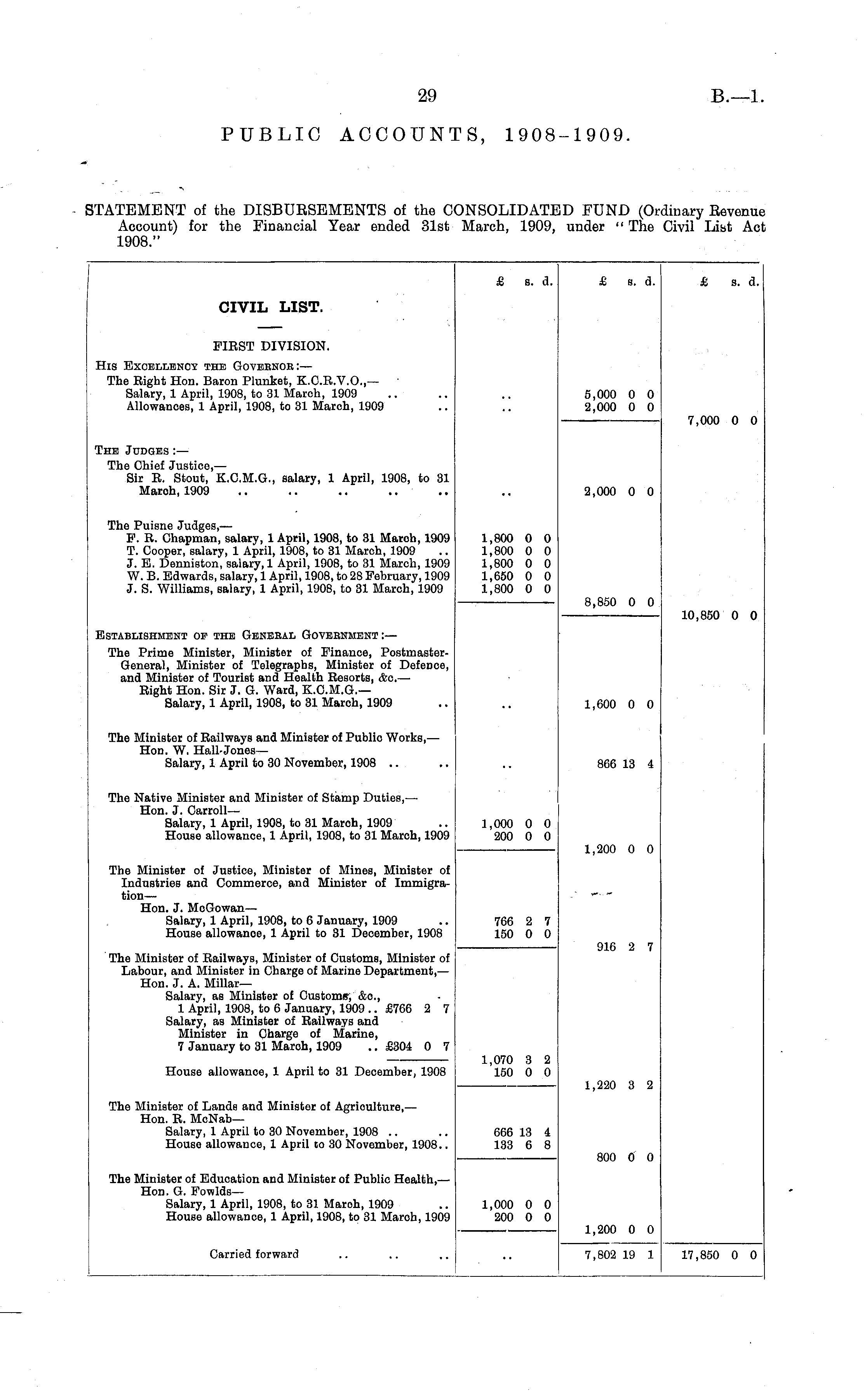 s. c d. s. s. CIVIL LIST. FIBST DIVISION. lis Excellency the Governor:— The Eight Hon. Baron Plunket, K.C.B.V.O.,— • Salary, 1 April, 1908, to 31 March, 1909 Allowances, 1 April, 1908, to 31 March, 1909 5,000 0 0 2,000 0 0 7,000 0 0 'he Judges :— The Chief Justice, — Sir B. Stout, K.C.M.G., salary, 1 April, 1908, to 31 Maroh, 1909 2,000 0 0 The Puisne Judges,— F. B. Chapman, salary, 1 April, 1908, to 31 March, 1909 T. Cooper, salary, 1 April, 1908, to 31 March, 1909 J. B. Denniston, salary, 1 April, 1908, to 31 March, 1909 W. B. Edwards, salary, 1 April, 1908, to 28 February, 1909 J. S. Williams, salary, 1 April, 1908, to 31 March, 1909 1,800 0 0 1,800 0 0 1,800 0 0 1,650 0 0 1,800 0 0 8,850 0 0 5STABLISHMENT OF THE GENEBAL GOVEBNMENT :— 10,850 0 0 The Prime Minister, Minister of Finance, PostmasterGeneral, Minister of Telegraphs, Minister of Defence, and Minister of Tourist and Health Besorts, <fec. — Right Hon. Sir J. G. Ward, K.C.M.G.— Salary, 1 April, 1908, to 31 March, 1909 1,600 0 0 The Minister of Railways and Minister of Public Works, — Hon. W. Hall-Jones — Salary, 1 April to 30 November, 1908 866 13 4 The Native Minister and Minister of Stamp Duties, — Hon. J. Carroll — Salary, 1 April, 1908, to 31 Maroh, 1909 House allowance, 1 April, 1908, to 31 March, 1909 1,000 0 0 200 0 0 1,200 0 0 The Minister of Justice, Minister of Mines, Minister of Industries and Commerce, and Minister of Immigration— Hon. J. McGowan — Salary, 1 April, 1908, to 6 January, 1909 House allowanoe, 1 April to 31 December, 1908 766 2 7 150 0 0 916 2 7 The Minister of Railways, Minister of Customs, Minister of Labour, and Minister in Charge of Marine Department,— Hon. J. A. MillarSalary, as Minister of Customs-, &c, 1 April, 1908, to 6 January, 1909 .. £766 2 7 Salary, as Minister of Railways and Minister in Charge of Marine, 7 January to 31 Maroh, 1909 .. £304 0 7 House allowanoe, 1 April to 31 December, 1908 1,070 3 2 150 0 0 The Minister of Lands and Minister of Agriculture,— Hon. R. McNab— Salary, 1 April to 30 November, 1908 House allowance, 1 April to 30 November, 1908.. 1,220 3 2 666 13 i 133 6 8 800 0 0 The Minister of Education and Minister of Public Health, — Hon. G. Fowlds— Salary, 1 April, 1908, to 31 Maroh, 1909 House allowanoe, 1 April, 1908, to 31 March, 1909 1,200 0 0 1,000 0 0 200 0 0 Carried forward 7,802 19 1 17,850 0 0
