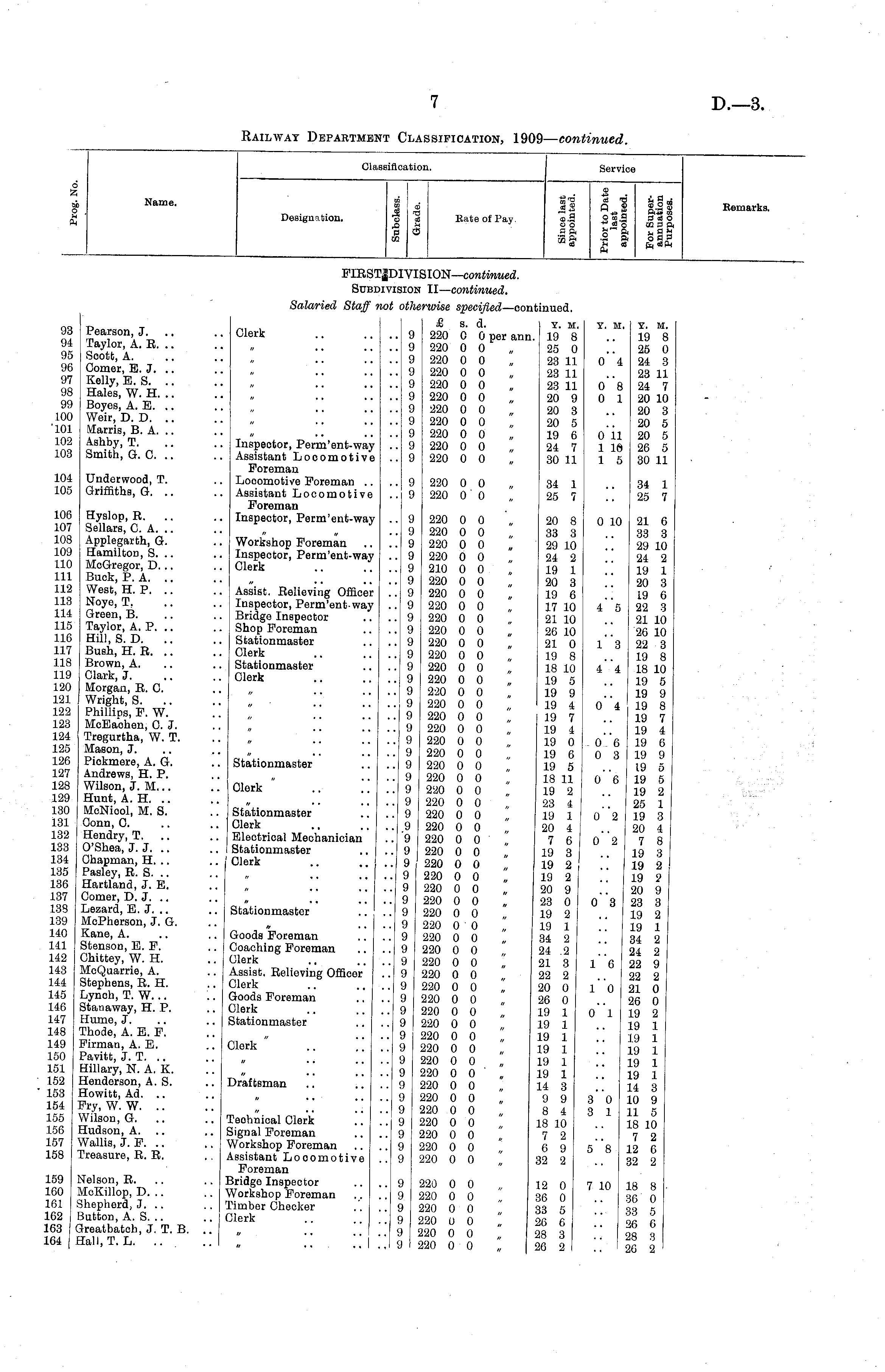 Railway Department Classification, 1909 — continued.