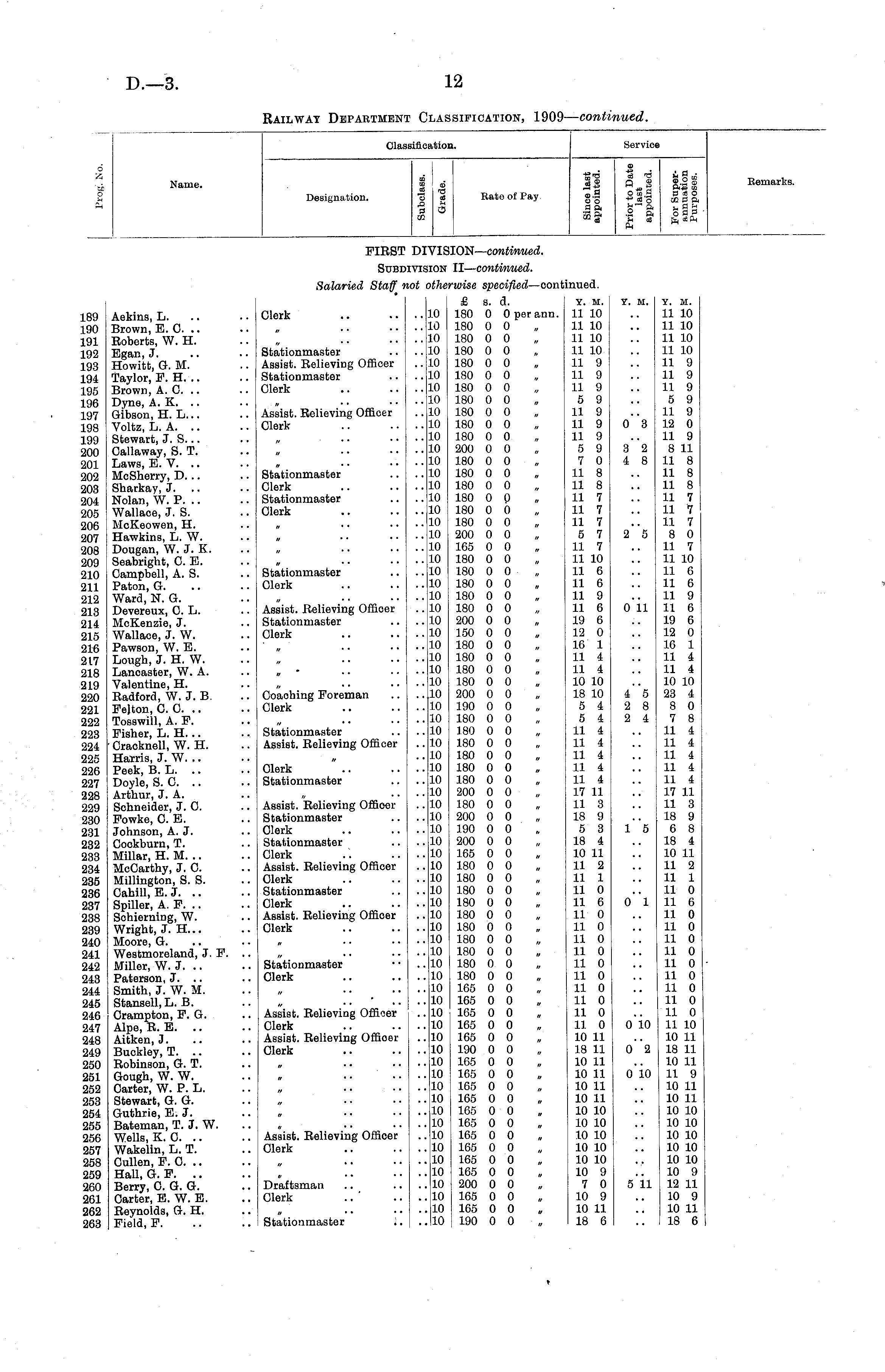 Classification. Service 6 Z p Name. Designation. CD O Cg b a 03 Rate of Pay 3 -£-3 "cl 03 it a . is as s°b _ -2 43 S al3 CO a o a a bio 33 ce o o3aa a a g- a * a y ft m Remarks. FIRST 1 DIVIS 3ION — continued. SUBI 1IVISION ; II— continued. Salaried Staff , tot othe '.rwise specified —cont £ s. d. 180 0 0 per ann. 180 0 0 180 0 0 180 0 0 180 0 0 180 0 0 180 0 0 180 0 0 180 0 0 180 0 0 180 0 0 200 0 0 180 0 0 180 0 0 180 0 0 180 0 0 180 0 6 180 0 0 200 0 0 165 0 0 180 0 0 180 0 0 „ 180 0 0 180 0 0 180 0 0 200 0 0 150 0 0 180 0 0 180 0 0 180 0 0 180 0 0 200 0 0 190 0 0 180 0 0 180 0 0 180 0 0 180 0 0 180 0 0 180 0 0 200 0 0 180 0 0 200 0 0 190 0 0 200 0 0 165 0 0 180 0 0 180 0 0 180 0 0 180 0 0 180 0 0 180 0 0 180 0 0 180 0 0 180 0 0 180 0 0 165 0 0 165 0 0 165 0 0 165 0 0 165 0 0 190 0 0 165 0 0 165 0 0 165 0 0 165 0 0 165 0 0 165 0 0 165 0 0 165 0 0 165 0 0 165 0 0 200 0 0 165 0 0 165 0 0 190 0 0 tinued. y. M. 11 10 11 10 11 10 11 10 11 9 11 9 11 9 5 9 11 9 11 9 11 9 5 9 7 0 11 8 11 8 11 7 11 7 11 7 5 7 11 7 11 10 11 6 11 6 11 9 11 6 19 6 12 0 16 1 11 4 11 4 10 10 18 10 5 4 5 4 11 4 11 4 11 4 11 4 11 4 17 11 11 3 18 9 5 3 18 4 10 11 11 2 11 1 11 0 11 6 11 0 11 0 11 0 11 0 11 0 11 0 11 0 11 0 11 0 11 0 10 11 18 11 10 11 10 11 10 11 10 11 10 10 10 10 10 10 10 10 10 10 10 9 7 0 10 9 10 11 18 6 Y. M. 0**3 3**2 4 8 2**5 oil 4**5 2 8 2 4 1*5 0 "l o'io 0**2 o'io 5*ii Y. M. 11 10 11 10 11 10 11 10 11 9 11 9 11 9 5 9 11 9 12 0 11 9 8 11 11 8 11 8 11 8 11 7 11 Y 11 7 8 0 11 7 11 10 11 6 11 6 11 9 11 6 19 6 12 0 16 1 11 4 11 4 10 10 23 4 8 0 7 8 11 4 11 4 11 4 11 4 11 4 17 11 11 3 18 9 6 8 18 4 10 11 11 2 11 1 11 0 11 6 11 0 11 0 11 0 11 0 11 0 11 0 11 0 11 0 11 0 11 10 10 11 18 11 10 11 11 9 10 11 10 11 10 10 10 10 10 10 10 10 10 10 10 9 12 11 10 9 10 11 18 6 189 190 191 192 193 194 195 196 197 198 199 200 201 202 203 204 205 206 207 208 209 210 211 212 213 214 215 216 217 218 219 220 221 222 223 224 225 226 227 228 229 230 231 232 233 234 235 236 237 238 239 240 241 242 243 244 245 246 247 248 249 250 251 252 253 254 255 256 257 258 259 260 261 262 263 Aekins, L. Brown, E. 0. .. Roberts, W. H. Egan, J. Howitt, G. M. Taylor, P. H. .. Brown, A. 0. Dyne, A. K. Gibson, H. L... Voltz, L. A. Stewart, J. S... Callaway, S. T. Laws, E. V. McSherry, D. .. Sharkay, J. Nolan, W. P. Wallace, J. S. McKeowen, H. Hawkins, L. W. Dougan, W. J. K. Seabright, 0. E. Campbell, A. S. Paton, G. Ward, N. G. Devereux, 0. L. McKenzie, J. Wallace, J. W. Pawson, W. E. Lough, J. H. W. Lancaster, W. A. Valentine, H. Radford, W. J. B. PeRon, CO. Tosswill, A. P. Fisher, L. H... ' Cracknell, W. H. Harris, J. W. .. Peek, B. L. Doyle, S. C Arthur, J. A. Schneider, J. 0. Fowke, 0. E. Johnson, A. J. Cockburn, T. Millar, H. M. .. McCarthy, J. 0. Millington, S. S. Cahill, E. J. Spiller, A. F. .. Sohierning, W. Wright, J. H... Moore, G. Westmoreland, J. F. Miller, W. J. Paterson, J. .. Smith, J. W. M. Stansell, L. B. Orampton, P. G. Alpe, R. E. Aitken, J. Buckley, T. .. Robinson, G. T. Gough, W. W. Carter, W. P. L. Stewart, G. G. Guthrie, E. J. Bateman, T. J. W. Wells, K. 0. Wakelin, L. T. Cullen, F. 0. Hall, G. P. Berry, 0. G. G. Garter, E. W. E. Reynolds, G. H. Field, F. Clerk Stationmaster Assist. Relieving Officer Stationmaster Clerk Assist. Relieving Offioer Clerk Stationmaster Clerk Stationmaster Clerk Stationmaster Clerk Assist. Relieving Officer Stationmaster Clerk Coaohing Foreman Clerk Stationmaster Assist. Relieving Officer Clerk Stationmaster Assist. Relieving Officer Stationmaster Olerk Stationmaster Clerk Assist. Relieving Officer Clerk Stationmaster Clerk Assist. Relieving Offioer Olerk Stationmaster Olerk Assist. Relieving Offioer Clerk Assist. Relieving Offioer Clerk Assist. Relieving Officer Clerk Draftsman Clerk Stationmaster I, .. 10 .. 10 .. 10 .. 10 .. 10 .. 10 .. 10 .. 10 .. 10 .. 10 .. 10 .. 10 .. 10 .. 10 .. 10 .. 10 .. 10 .. 10 .. 10 .. 10 .. 10 .. 10 ..10 .. 10 .. 10 .. 10 .. 10 .. 10 .. 10 .. 10 .. 10 ..10 .. 10 .. 10 .. 10 .. 10 .. 10 .. 10 .. 10 .. 10 ..10 .. 10 .. 10 .. 10 .. 10 .. 10 .. 10 .. 10 .. 10 .. 10 .. 10 .. 10 .. 10 .. 10 .. 10 .. 10 .. 10 .. 10 .. 10 .. 10 .. 10 .. 10 .. 10 .. 10 .. 10 .. 10 .. 10 .. 10 .. 10 .. 10 .. 10 .. 10 .. 10 .. 10 ..10 »