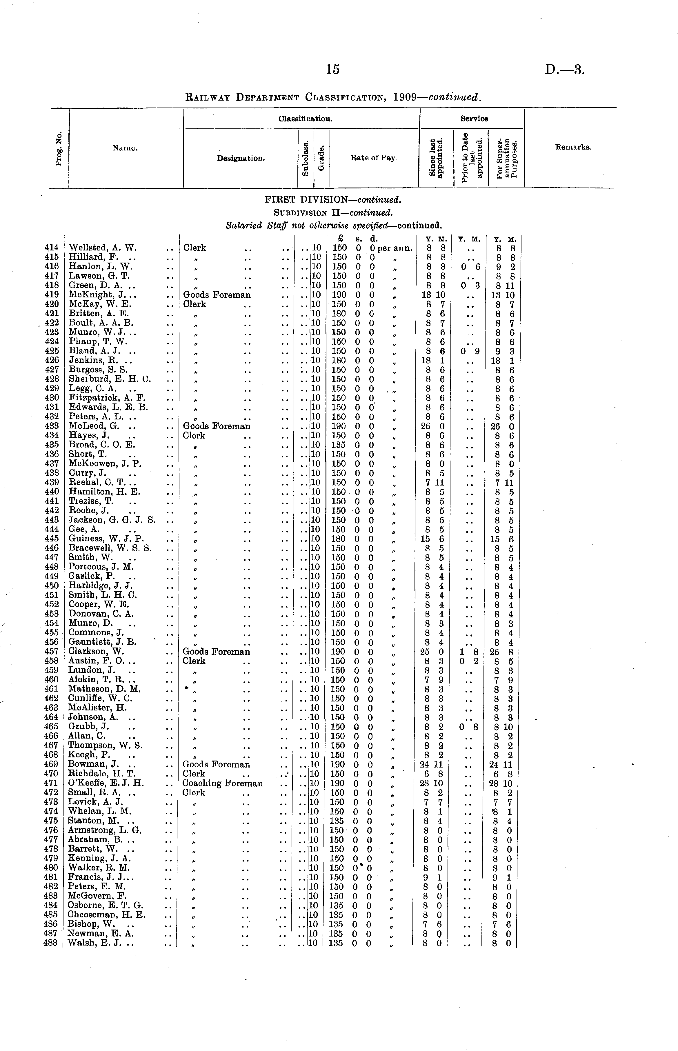 Classification. Service 6 A oi 3 44 ft Name. Designation. co S o £ ■s CO Rate of Pay _i3 * •_" u 9 _ £_ Q g g-2" —' "3 43 3 ft43 CO cd .9 ° a ce o 00 *ao ccaa a a g" a 4. g % 35 a -2 a b a a 31 ca „n ce ft ce ft ft Remarks. FIRS'] Dl VIE ilON— continued. Sub: IIVTI HON II— continued. 414 415 416 417 418 419 420 421 422 423 424 425 426 427 428 429 430 431 432 433 434 435 436 437 438 439 440 441 442 443 444 445 446 447 448 449 450 451 452 453 454 455 456 457 458 459 460 461 462 463 464 465 466 467 468 469 470 471 472 473 474 475 476 477 478 479 480 481 482 483 484 485 486 487 488 Wellsted, A. W. Hilliard, F. .. Hanlon, L. W. Lawson, G. T. Green, D. A. McKnight, J. .. McKay, W. E. Britten, A. E. Boult, A. A. B. Munro, W.J. Pbaup, T. W. Bland, A. J. .. Jenkins, R. .. Burgess, S. S. Sherburd, E. H. C. Legg, CA. Fitzpatriok, A. P. Edwards, L. E. B. Peters, A. L. McLeod, G. .. Hayes, J. Broad, 0. 0. E. Short, T. McKeowen, J. P. Curry, J. Reehal, C.T... Hamilton, H. E. Trezise, T. Roche, J. Jackson, G. G. J. S. Gee, A. Guiness, W. J. P. Bracewell, W. S. S. Smith, W. Porteous, J. M. Garlick, P. .. Harbidge, J. J. Smith, L. H. 0. Cooper, W. E. Donovan, 0. A. Munro, D. Commons, J. Gauntlett, J. B. Clarkson, W. Austin, F. 0. .. Lundon, J. Aickin, T. R. .. Matheson, D. M. Cunliffe, W. 0. MoAlister, H. Johnson, A. .. Grubb, J. Allan, 0. Thompson, W. S. Keogh, P. Bowman, J. .. Richdale, H. T. O'Keefie, E. J. H. Small, R. A. Levick, A. J. Whelan, L. M. Stanton, M. .. Armstrong, L. G. Abraham, B. .. Barrett, W. .. Kenning, J. A. Walker, R. M. Francis, J. J... Peters, E. M. McGovern, P. Osborne, E. T. G. Cheeseman, H. E. Bishop, W. Newman, E. A. Walsh, E. J. .. Salaried Staff Clerk Goods Foreman Clerk Goods Foreman Clerk ,ot . 10 . 10 . 10 . 10 . 10 10 , 10 . 10 10 , 10 . 10 , 10 10 , 10 10 , 10 , 10 , 10 . 10 . 10 , 10 10 10 10 10 . 10 10 . 10 10 10 10 10 10 10 10 10 10 10 10 10 10 10 10 10 10 10 10 10 10 10 10 10 10 10 10 10 10 10 10 10 10 10 10 10 10 10 10 10 10 10 10 10 10 10 10 ithc, rwise specified —conti £ s. d. 150 0 0 per ann. 150 0 0 150 0 0 150 0 0 150 0 0 190 0 0 150 0 0 180 0 0 150 0 0 150 0 0 150 0 0 150 0 0 180 0 0 150 0 0 150 0 0 150 0 0 . „ 150 0 0 150 0 0 150 0 0 190 0 0 150 0 0 135 0 0 150 0 0 150 0 0 150 0 0 150 0 0 150 0 0 150 0 0 150 0 0 150 0 0 150 0 0 180 0 0 150 0 0 150 0 0 150 0 0 150 0 0 150 0 0 150 0 0 150 0 0 150 0 0 150 0 0 150 0 0 150 0 0 190 0 0 150 0 0 150 0 0 150 0 0 150 0 0 150 0 0 150 0 0 150 0 0 150 0 0 150 0 0 150 0 0 150 0 0 190 0 0 150 0 0 190 0 0 150 0 0 150 0 0 150 0 0 135 0 0 150 0 0 150 0 0 150 0 0 150 0 0 150 0*0 150 0 0 150 0 0 150 0 0 135 0 0 135 0 0 135 0 0 135 0 0 135 0 0 inued. Y. M. 8 8 8 8 8 8 8 8 8 8 13 10 8 7 8 6 8 7 8 6 8 6 8 6 18 1 8 6 8 6 8 6 8 6 8 6 8 6 26 0 8 6 8 6 8 6 8 0 8 5 7 11 8 5 8 5 8 5 8 5 8 5 15 6 8 5 8 5 8 4 8 4 8 4 8 4 8 4 8 4 8 3 8 4 8 4 25 0 8 3 8 3 7 9 8 3 8 3 8 3 8 3 8 2 8 2 8 2 8 2 24 11 6 8 28 10 8 2 7 7 8 1 8 4 8 0 8 0 8 0 8 0 8 0 9 1 8 0 8 0 8 0 8 0 7 6 8 0 8 6 Y. M. 0*6 o"3 0*9 y. m. 8 8 8 8 9 2 8 8 8 11 13 10 8 7 8 6 8 7 8 6 8 6 9 3 18 1 8 6 8 6 8 6 8 6 8 6 8 6 26 0 8 6 8 6 8 6 8 0 8 5 7 11 8 5 8 5 8 5 8 5 8 5 15 6 8 5 8 5 8 4 8 4 8 4 8 4 8 4 8 4 8 3 8 4 8 4 26 8 8 5 8 3 7 9 8 3 8 3 8 3 8 3 8 10 8 2 8 2 8 2 24 11 6 8 28 10 8 2 7 7 ■8 1 8 4 8 0 8 0 8 0 8 0 8 0 9 1 8 0 .8 0 8 0 8 0 7 6 8 0 8 0 Goods Foreman Clerk 1**8 0 2 „ .. • • o"8 Goods Foreman Clerk .. ...» Coaohing Foreman Clerk