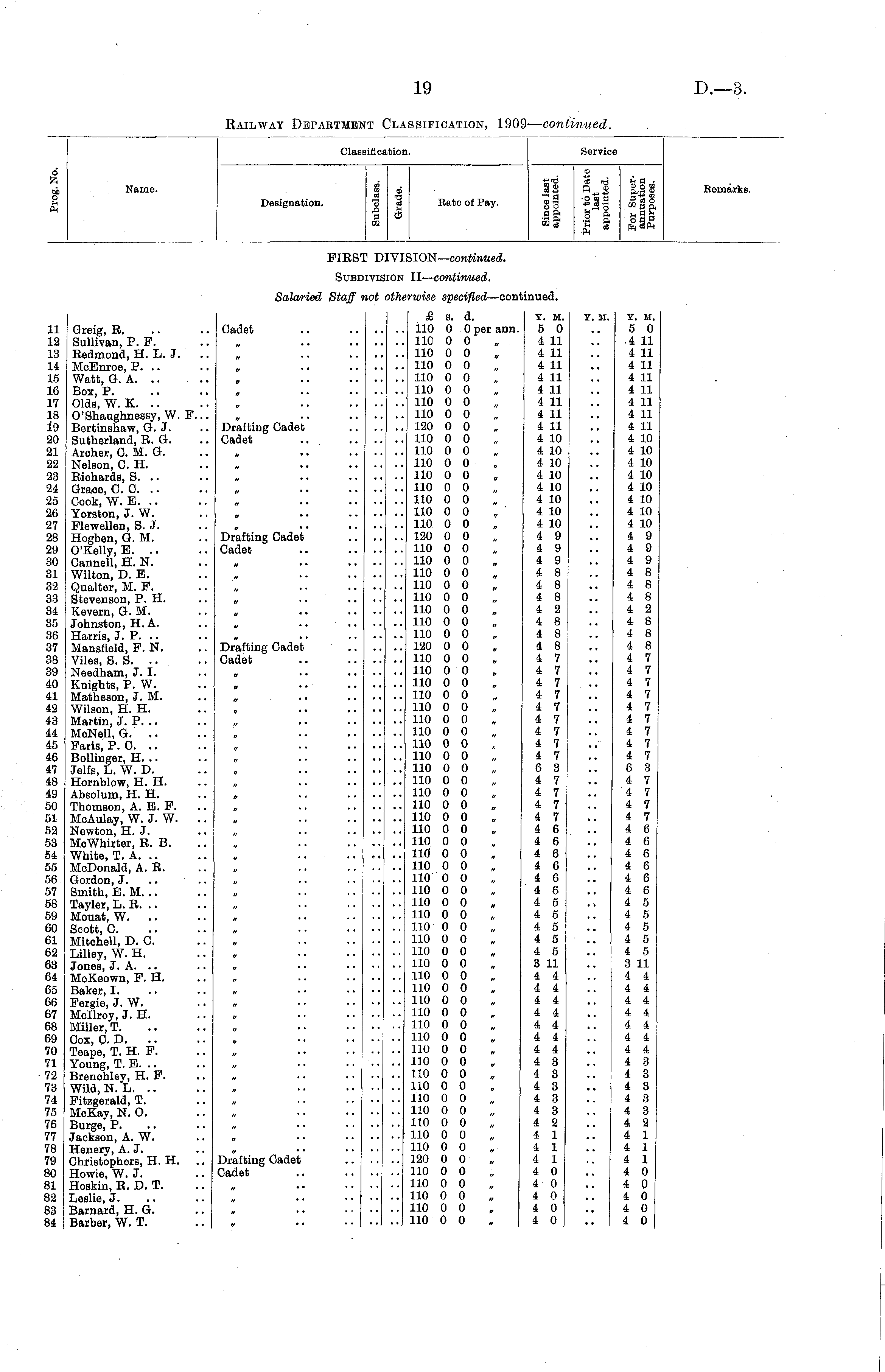 Clasi ;itici ition. Service 3 A ft Name. Designation. 06 cri •q a 3 03 CD cB ce I Rate of Pay. *j; r d cS rrt Jh 0 • 32 §,SS 3-S .gig fss a& £ 9 Scift" Remarks. PIRS1 1 Dl VIS 3I0N — continued. Subd: ivis: (ON II— continued. Salaried Staff % ;ot ( ithe 1 . rwise specified —conti inued. 11 12 13 14 15 10 17 18 19 20 21 22 23 24 25 26 27 28 29 30 81 32 33 34 35 36 37 38 39 40 41 42 43 44 45 46 47 48 49 50 51 52 53 54 55 56 57 58 59 60 61 02 63 64 65 66 67 68 69 70 71 72 73 74 75 76 77 78 79 80 81 82 83 84 Greig, R. Sullivan, P. P. Redmond, H. L. J. McEnroe, P. .. Watt, G. A. .. Box, P. Olds, W. K. .. O'Shaughnessy, W. F... Bertinshaw, G. J. Sutherland, R. G. Aroher, 0. M. G. Nelson, 0. H. Richards, S. .. Grace, CO... Cook, W. E. .. Yorston, J. W. Flewellen, S. J. Hogben, G. M. O'Kelly, E. .. Cannell, H. N. Wilton, D. E. Qualter, M. P. Stevenson, P. H. Kevern, G. M. Johnston, H. A. Harris, J. P. .. Mansfield, P. N. Viles, S. S. .. Needham, J. I. Knights, P. W. Matheson, J. M. Wilson, H. H. Martin, J. P. .. MoNeil, G. .. Paris, P. 0 Bollinger, H. .. Jelfs, L. W. D. Hornblow, H. H. Absolum, H. H. Thomson, A. E. P. McAulay, W. J. W. Newton, H.J. MoWhirter, R. B. White, T. A. .. McDonald, A. R. Gordon, J. Smith, E. M. .. Tayler, L. R. .. Mouat, W. Scott, 0. Mitchell, D. 0. Lilley, W. H. Jones, J. A. .. McKeown, F. H. Baker, I. Fergie, J. W. Mcllroy, J. H. Miller, T. Cox, CD. Teape, T. H. P. Young, T. E. .. Brenohley, H. F. Wild, N. L. .. Fitzgerald, T. McKay, N. O. Burge, P. Jackson, A. W. Henery, A. J. Christophers, H. H. Howie, W. J. Hoskin, R. D. T. Leslie, J. Barnard, H. G. Barber, W. T. Cadet Drafting Cadet Cadet Drafting Cadet Cadet Drafting Cadet Cadet £ a. d. 110 0 0 per ann. 110 0 0 110 0 0 110 0 0 110 0 0 110 0 0 110 0 0 110 0 0 120 0 0 110 0 0 110 0 0 110 0 0 110 0 0 110 0 0 110 0 0 110 0 0 110 0 0 120 0 0 110 0 0 110 0 0 110 0 0 110 0 0 110 0 0 110 0 0 110 0 0 110 0 0 120 0 0 110 0 0 110 0 0 110 0 0 110 0 0 110 0 0 110 0 0 110 0 0 110 0 0 110 0 0 110 0 0 110 0 0 110 0 0 110 0 0 110 0 0 110 0 0 110 0 0 110 0 0 110 0 0 110 0 0 110 0 0 110 0 0 110 0 0 110 0 0 110 0 0 110 0 0 110 0 0 110 0 0 110 0 0 110 0 0 110 0 0 110 0 0 110 0 0 110 0 0 110 0 0 110 0 0 110 0 0 110 0 0 110 0 0 110 0 0 110 0 0 110 0 0 120 0 0 110 0 0 110 0 0 110 0 0 110 0 0 110 0 0 Y. M. 5 0 4 11 4 11 4 11 4 11 4 11 4 11 4 11 4 11 4 10 4 10 4 10 4 10 4 10 4 10 4 10 4 10 4 9 4 9 4 9 4 8 4 8 4 8 4 2 4 8 4 8 4 8 4 7 4 7 4 7 4 7 4 7 4 7 4 7 4 7 4 7 6 3 4 7 4 7 4 7 4 7 4 6 4 6 4 6 4 6 4 6 4 6 4 5 4 5 4 5 4 5 4 5 3 11 4 4 4 4 4 4 4 4 4 4 4 4 4 4 4 3 4 3 4 3 4 3 4 3 4 2 4 1 4 1 4 1 4 0 4 0 4 0 4 0 4 0 y. m. y. m. 5 0 -4 11 4 11 4 11 4 11 4 11 4 11 4 11 4 11 4 10 4 10 4 10 4 10 4 10 4 10 4 10 4 10 4 9 4 9 4 9 4 8 4 8 4 8 4 2 4 8 4 8 4 8 4 7 4 7 4 7 4 7 4 7 4 7 4 7 4 7 4 7 6 3 4 7 4 7 4 7 4 7 4 6 4 6 4 6 4 6 4 6 4 6 4 5 4 5 4 5 4 5 4 5 3 11 4 4 4 4 4 4 4 4 4 4 4 4 4 4 4 3 4 3 4 3 4 3 4 3 4 2 4 1 4 1 4 1 4 0 4 0 4 0 4 0 4 0 Drafting Cadet Cadet a * •