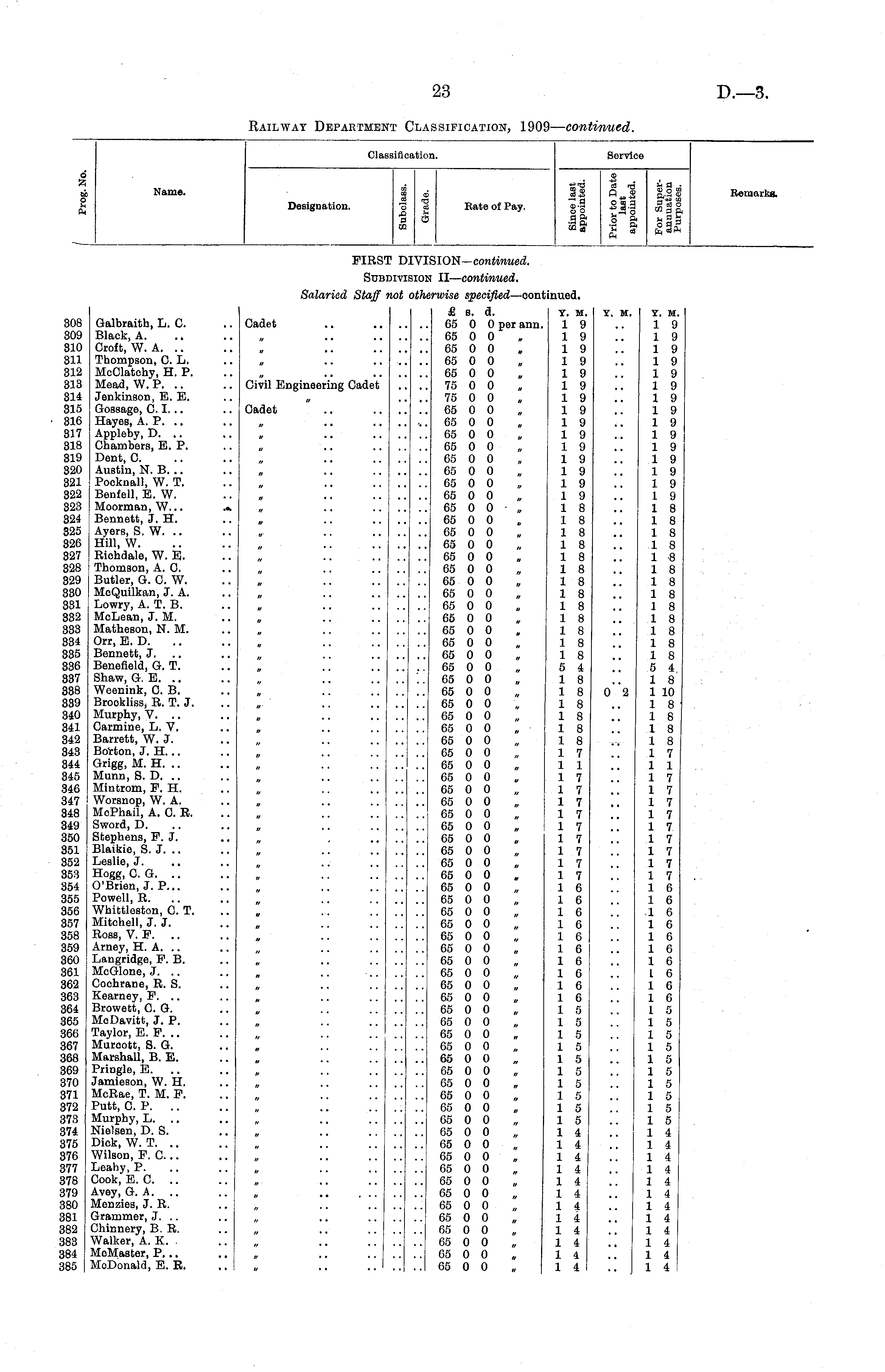 Classification. Service d Z ti 3 4. ft Name. Designation. GO m efl 0 Rate of Pay. ii 1 1 lis »-3 Sl-3 1^3 So Z£3 <*> a0l .g§ 3» uss a- g 9 £§£ Remarks. FIRS. 1 d: [VIE HON— continued. Sub: HVIi ilON II— continued. 308 309 310 311 312 313 314 315 316 317 318 319 320 321 322 323 324 325 326 327 328 329 330 331 332 333 334 335 336 337 338 339 340 341 342 343 344 345 346 347 348 349 350 351 352 353 354 355 356 357 358 359 360 361 362 363 364 365 366 367 368 369 370 371 372 373 374 375 376 377 378 379 380 381 382 383 384 385 Galbraith, L. 0. Black, A. Croft, W. A. Thompson, 0. L. MoClatchy, H. P. Mead, W. P. Jenkinson, E. E. Gossage, CI... Hayes, A. P. Appleby, D. .. Chambers, E. P. Dent, 0. Austin. N. B. .. Pocknall, W. T. Benfell, E. W. Moorman, W... Bennett, J. H. Ayers, S. W. .. Hill, W. Riohdale, W. E. Thomson, A. 0. Butler, G. 0. W. MoQuilkan, J. A. Lowry, A. T. B. McLean, J. M. Matheson, N. M. Orr, E. D. Bennett, J. Benefield, G. T. Shaw, G. E. Weenink, 0. B. Brookliss, R. T. J. Murphy, V. .. Carmine, L, V. Barrett, W. J. Borton, J. H. .. Grigg, M. H. Munn, 8. D. .. Mintrom, P. H. Worsnop, W. A. McPhail, A. 0. R. Sword, D. Stephens, P. J. Blaikie, S. J. .. Leslie, J. Hogg.CG. .. O'Brien, J. P... Powell, R. Whittleston, 0. T. Mitchell, J. J. Ross, V. P. Arney, H. A. .. Langriage, P. B. McGlone, J. .. Cochrane, R. S. Kearney, F. .. Browett, 0. G. MoDavitt, J. P. Taylor, E. P. .. Muroott, 8. G. Marshall, B. E. Pringle, E. Jamieson, W. H. McRae, T. M. F. Putt, 0. P. Murphy, L. Nielsen, D. S. Dick, W. T. Wilson, P. C .. Leahy, P. Cook, E. 0. Avey, G. A. Menzies, J. R. Grammer, J. .. Chinnery, B. R. Walker, A. K. ■ MoMaster, P... MoDonald, E. R. A Salaried Staff ■ Caaet Civil Engineering Cadet Cadet It • • lot ■>thei ■wise specified —cont: £ s. a. 65 0 0 per ann. 65 0 0 65 0 0 65 0 0 65 0 0 75 0 0 75 0 0 65 0 0 65 0 0 65 0 0 65 0 0 65 0 0 65 0 0 65 0 0 65 0 0 65 0 0 • „ 65 0 0 65 0 0 65 0 0 65 0 0 65 0 0 65 0 0 65 0 0 65 0 0 65 0 0 65 0 0 65 0 0 65 0 0 65 0 0 65 0 0 65 0 0 65 0 0 65 0 0 65 0 0 65 0 0 65 0 0 65 0 0 65 0 0 65 0 0 65 0 0 65 0 0 65 0 0 65 0 0 65 0 0 65 0 0 65 0 0 65 0 0 65 0 0 65 0 0 65 0 0 65 0 0 65 0 0 65 0 0 65 0 0 65 0 0 65 0 0 65 0 0 65 0 0 65 0 0 65 0 0 65 0 0 65 0 0 65 0 0 65 0 0 65 0 0 65 0 0 65 0 0 65 0 0 65 0 0 65 0 0 65 0 0 65 0 0 65 0 0 65 0 0 65 0 0 65 0 0 65 0 0 65 0 0 inued. y. m. 1 9 1 9 1 9 1 9 1 9 1 9 1 9 1 9 1 9 1 9 1 9 1 9 1 9 1 9 1 9 1 8 1 8 1 8 1 8 1 8 1 8 1 8 1 8 1 8 1 8 1 8 1 8 1 8 5 4 1 8 1 8 1 8 1 8 1 8 1 8 1 7 1 1 1 7 1 7 1 7 1 7 1 7 1 7 1 7 1 7 1 7 1 6 1 6 1 6 1 6 1 6 1 6 1 6 1 6 1 6 1 6 1 5 1 5 1 5 1 5 1 5 1 5 1 5 1 5 1 5 1 5 1 4 1 4 1 4 1 4 1 4 1 4 1 4 1 4 1 4 1 4 1 4 1 4 Y. M. 0**2 Y. M. 1 9 1 9 1 9 1 9 1 9 1 9 1 9 1 9 1 9 1 9 1 9 1 9 1 9 1 9 1 9 1 8 1 8 1 8 1 8 1 8 1 8 1 8 1 8 1 8 1 8 1 8 1 8 1 8 5 4 1 8 1 10 1 8 1 8 1 8 1 8 1 7 1 1 1 7 1 7 1 7 1 7 1 7 1 7 1 7 1 7 1 7 1 6 1 6 1 6 1 6 1 6 1 6 1 6 I 6 1 6 1 6 1 5 1 5 1 5 1 5 1 5 1 5 1 5 1 5 1 5 1 5 1 4 1 4 1 4 1 4 1 4 1 4 1 4 1 4 1 4 1 4 1 4 1 4