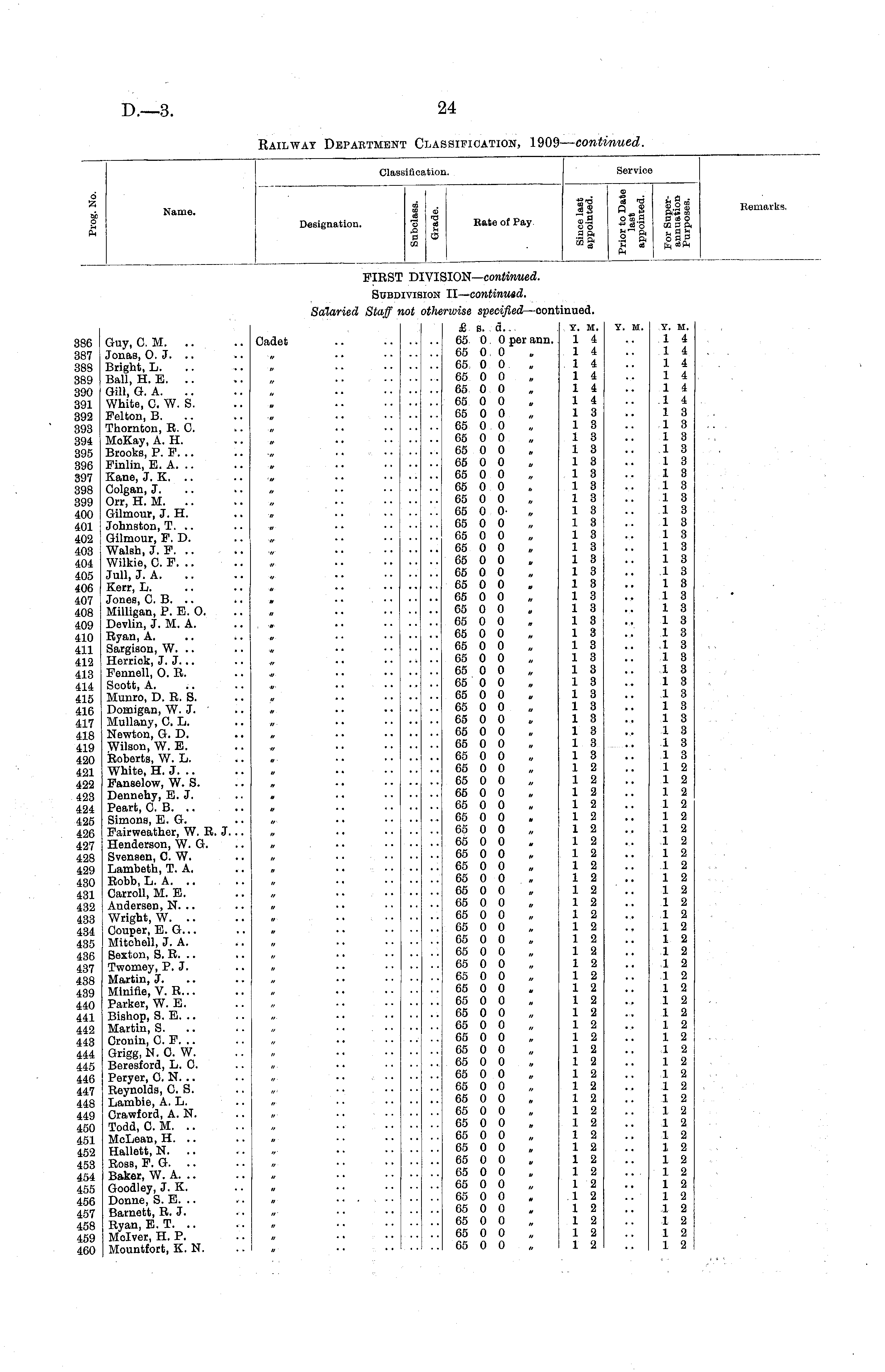 Classificatii Service in. 3 z ti) p ft Name. Designation. 00 CO £ 3 a a 03 Rate of Pay fS 1 t S.2S £s H 4=§ as! 3 9 ° ".9 a ca o So *» ca 3 033 a s a g" a * g g 339 | 9 £§ft Remarks. FIRST d: Subdivie EVIS SION — continued. HON IX—continued. 386 387 388 389 390 391 392 393 394 395 396 397 398 399 400 401 402 403 404 405 406 407 408 409 410 411 412 413 414 415 416 417 418 419 420 421 422 423 424 425 426 427 428 429 430 431 432 433 434 435 436 437 438 439 440 441 442 443 444 445 446 447 448 449 450 451 452 453 454 455 456 457 458 459 460 Guy, CM JonaB, 0. J. .. Bright, L. Ball, H. E. Gill, G. A. White, 0. W. S. Felton, B. Thornton, R. 0. MoKay, A. H. Brooks, P. F. .. Finlin, E. A. .. Kane, J. K. .. Colgan, J. Orr, H. M. Gilmour, J. H. Johnston, T. .. Gilmour, P. D. Walsh, J. P. .. Wilkie, 0. F. .. Jull, J. A. Kerr, L. Jones, 0. B. .. Milligan, P. E. 0. Devlin, J. M. A. Ryan, A. Sargison, W. .. Herriok, J. J. .. Fennell, 0. R. Scott, A. Munro, D. R. S. Domigan, W. J. Mullany, 0. L. Newton, G. D. Wilson, W. E. Roberts, W. L. White, H. J. .. Fanselow, W. S. Dennehy, E.J. Peart, OB. .. .. Simons, E.G. Pairweather, W. R. J. .. Henderson, W. G. SvenBen, C. W. Lambeth, T. A, Robb, L. A. Carroll, M. E. Andersen, N. .. Wright, W. .. Couper, E. G... Mitchell, J. A. Sexton, S. R. .. Twomey, P. J. Martin, J. Minifie, V. R... Parker, W. E. Bishop, S. E. .. Martin, S. Cronin, 0. F. .. Grigg, N.O.W. Beresford, L. 0. Peryer, 0. N. .. Reynolds, 0. S. Lambie, A. L. Crawford, A. N. Todd, CM... McLean, H. .. Hallett, N. .. Ross, P. G. .. Baker, W. A. .. Goodley, J. K. Donne, S. E. .. Barnett, R. J. Ryan, E.T. .. Mclver, H. P. Mountfort, K. N. Cadet Salaried Staff not othe rwise specified —oont £ s. a.. 65 0 0 per ann. 65 0 0 65 0 0 65 0 0 65 0 0 65 0 0 65 0 0 65 0 0 65 0 0 65 0 0 65 0 0 65 0 0 65 0 0 65 0 0 65 0 0- „ 65 0 0 65 0 0 65 0 0 65 0 0 65 0 0 65 0 0 65 0 0 65 0 0 65 0 0 65 0 0 65 0 0 65 0 0 65 0 0 65 0 0 65 0 0 65 0 0 65 0 0 65 0 0 65 0 0 65 0 0 65 0 0 65 0 0 65 0 0 65 0 0 65 0 0 65 0 0 65 0 0 65 0 0 65 0 0 65 0 0 65 0 0 65 0 0 65 0 0 65 0 0 65 0 0 65 0 0 65 0 0 65 0 0 65 0 0 65 0 0 65 0 0 65 0 0 65 0 0 65 0 0 65 0 0 65 0 0 65 0 0 65 0 0 65 0 0 65 0 0 65 0 0 65 0 0 65 0 0 65 0 0 65 0 0 65 0 0 65 0 0 65 0 0 65 0 0 65 0 0 ;inued. Y. M. 1 4 1 4 1 4 1 4 1 4 1 4 1 3 1 3 1 3 1 3 1 3 1 3 1 3 1 3 1 3 1 3 1 3 1 3 1 3 1 3 1 3 1 3 1 3 1 3 1 3 1 3 1 3 1 3 1 3 1 3 1 3 1 3 1 3 1 3 1 3 1 2 1 2 1 2 1 2 1 2 1 2 1 2 1 2 1 2 1 2 1 2 1 2 1 2 1 2 1 2 1 2 1 2 1 2 1 2 1 2 1 2 1 2 1 2 1 2 1 2 1 2 1 2 1 2 1 2 1 2 1 2 1 2 1 2 1 2 1 2 1 2 1 2 1 2 1 2 1 2 y. m. Y. M. 1 4 1 4 1 4 1 4 1 4 1 4 1 3 1 3 1 3 1 3 1 3 1 3 1 3 1 3 1 3 1 3 1 3 1 3 1 3 1 3 1 3 1 3 1 3 1 3 1 3 1 3 1 3 1 3 1 3 1 3 1 3 1 3 1 3 1 3 1 3 1 2 1 2 1 2 1 2 1 2 1 2 1 2 1 2 1 2 1 2 1 2 1 2 1 2 1 2 1 2 1 2 1 2 1 2 1 2 1 2 1 2 1 2 1 2 1 2 1 2 1 2 1 2 1 2 1 2 1 2 1 2 1 2 1 2 1 2 1 2 1 2 1 2 1 2 1 2 1 2