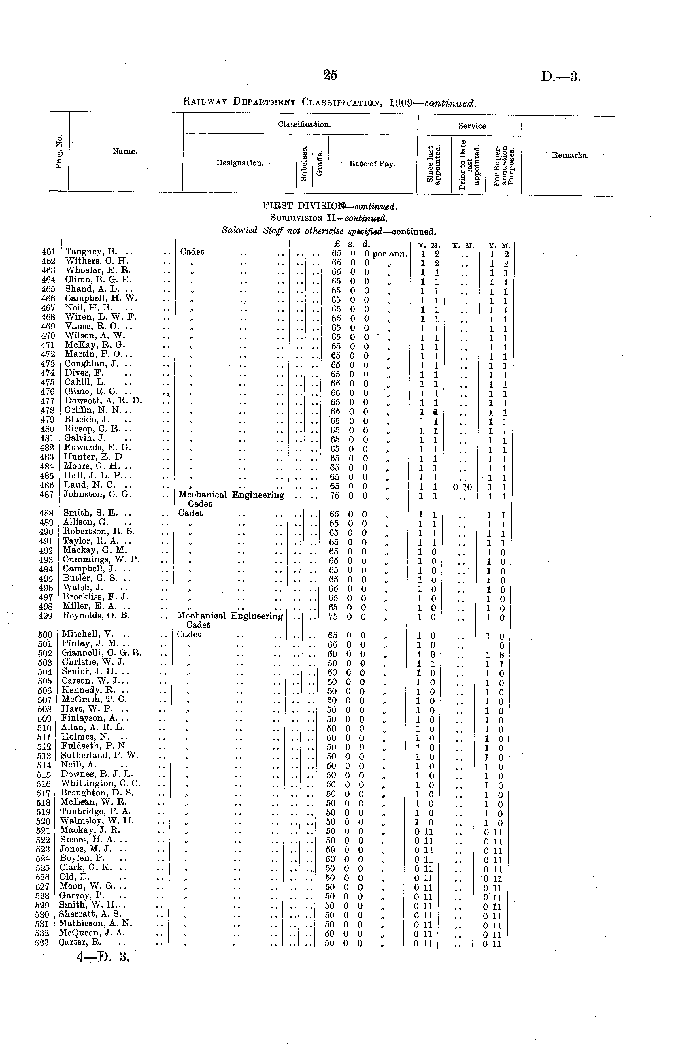 Classificatio: Service a Z ti O h ft Name. Designation. CO £ *B 3 ca 43 44 a cS 03 o m'B "% « JJi i2 OS g.2 8 "* ft 43 4, a43 CO 3.9 ° co.9 a ce o 3 o <& o m a a a a a a „ a b ffia .2 a oaa UJ a i. ce fa ce ft Remarks. Rate of Pay. first d: Subdivii [VIS SION ISION— continued. in II—continued. 461 462 463 464 465 466 467 468 469 470 471 472 473 474 475 476 477 478 479 480 481 482 483 484 485 486 487 Tangney, B. .. Withers, 0. H. Wheeler, E. R. Climo, B. G. E. Shand, A. L. Campbell, H. W. Neil, H. B. Wiren, L. W. F. Vause, R. O. Wilson, A. W. McKay, R. G. Martin, P. 0... Coughlan, J. .. Diver, P. Oahill, L. Climo, R. 0. Dowsett, A. R. D. Griffin, N. N. .. Blackie, J. Riesop, C. R. .. Galvin, J. Edwards, E. G. Hunter, E. D. Moore, G. H. .. Hall, J. L. P... Laud, N. 0. Johnston, 0. G. Salaried Staff not i Cadet tthei lerwise specified —oonti £ s. d. 65 0 0 per ann. . 65 0 0 . 65 0 0 . 65 0 0 . 65 0 0 . 65 0 0 . 65 0 0 . 65 0 0 . 65 0 0 . 65 0 0 „ . 65 0 0 . 65 0 0 . 65 0 0 . 65 0 0 . 65 0 0 . 65 0 0 . 65 0 0 . 65 0 0 . 65 0 0 . 65 0 0 . 65 0 0 . 65 0 0 . 65 0 0 . 65 0 0 . 65 0 0 . 65 0 0 . 75 0 0 inued. Y. M. 1 2 1 2 1 1 1 1 1 1 1 1 1 1 1 1 1 1 1 1 1 1 1 1 1 1 1 1 1 1 1 1 1 1 1 4 1 1 1 1 1 1 1 1 1 1 1 1 1 1 1 1 1 1 Y. M. o'io Y. M. 1 2 1 2 1 1 1 1 1 1 1 1 1 1 1 1 1 1 1 1 1 1 1 1 1 1 1 1 1 1 1 1 1 1 1 1 1 1 1 1 1 1 1 1 1 1 1 1 1 1 1 1 1 1 Mechanical Engineering .. Cadet Cadet 488 489 490 491 492 493 494 495 496 497 498 499 Smith, S. E. Allison, G. Robertson, R. S. Taylor, R. A. Mackay, G. M. Cummings, W. P. Campbell, J. Butler, G. S. Walsh, J. Brookliss, F. J. Miller, E. A. .. Reynolds, 0. B. , 65 0 0 , 65 0 0 65 0 0 65 0 0 65 0 0 65 0 0 65 0 0 65 0 0 65 0 0 65 0 0 65 0 0 75 0 0 1 1 1 1 1 1 1 1 1 0 1 0 1 0 1 0 1 0 1 0 1 0 1 0 1 1 1 1 1 1 1 1 1 0 1 0 1 0 1 0 1 0 1 0 1 0 1 0 Mechanical Engineering .. Cadet Cadet 500 501 502 503 504 505 506 507 I 508 509 510 511 512 513 514 515 516 517 518 519 520 521 522 523 524 525 526 527 528 529 530 531 532 533 Mitohell, V. .. Finlay, J. M. .. Giannelli, 0. G. R. Christie, W. J. Senior, J. H. .. Carson, W. J... Kennedy, R. .. McGrath, T. 0. Hart, W. P. Finlayson, A. .. Allan, A. R. L. Holmes, N. Puldseth, P. N. Sutherland, P. W. Neill, A. Downes, R. J. L. Whittington, 0. 0. Broughton, D. S. MeLtsin, W. R. Tunbridge, P. A. Walmsley, W. H. Maokay, J. R. Steers, H. A. Jones, M. J. Boylen, P. Clark, G. K. Old, E. Moon, W. G. .. Garvey, P. Smith, W. H... Sherratt, A. S. Mathieson, A. N. McQueen, J. A. Carter, R. 65 0 0 65 0 0 50 0 0 50 0 0 50 0 0 50 0 0 50 0 0 50 0 0 50 0 0 50 0 0 50 0 0 50 0 0 50 0 0 50 0 0 50 0 0 50 0 0 50 0 0 50 0 0 50 0 0 50 0 0 50 0 0 50 0 0 50 0 0 50 0 0 50 0 0 50 0 0 50 0 0 50 0 0 50 0 0 50 0 0 50 0 0 50 0 0 50 0 0 50 0 0 „ I 1 0 1 0 1 8 1 1 1 0 1 0 1 0 1 0 1 0 1 0 1 0 1 0 1 0 1 0 1 0 1 0 1 0 1 0 1 0 1 0 1 0 0 11 0 11 0 11 0 11 0 11 0 11 0 11 0 11 0 11 0 11 0 11 0 11 0 11 .' 1 0 1 0 1 8 1 1 1 0 1 0 1 0 1 0 1 0 1 0 1 0 1 0 1 0 1 0 1 0 1 0 1 0 1 0 1 0 1 0 1 0 0 11 0 11 0 11 0 11 0 11 0 11 0 11 0 11 0 11 0 11 0 11 0 11 0 11 ..[.„, ..