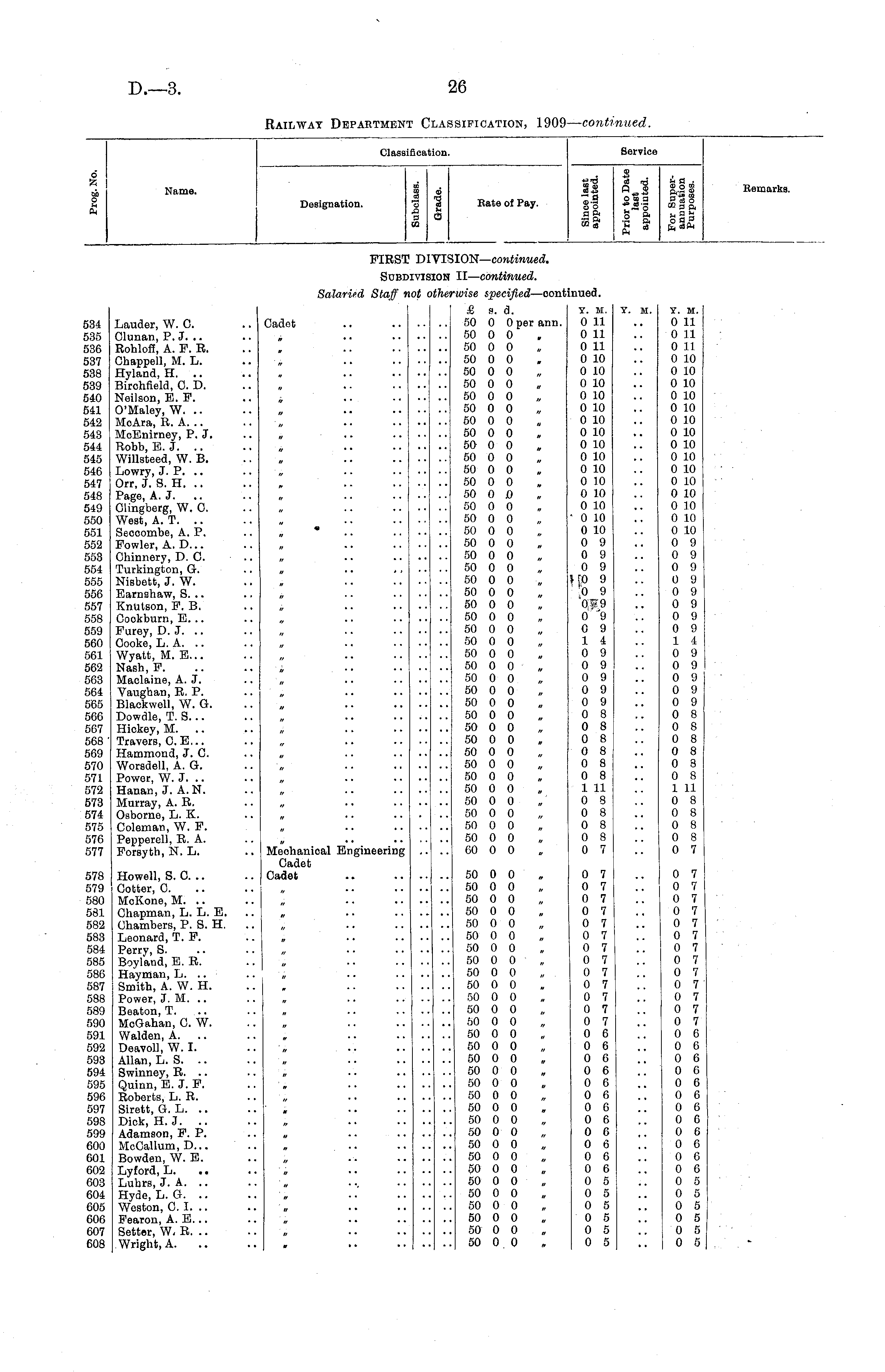 Clasi jification, Service d Z eft o 44 ft Name. Designation. CO CO 3 a 3 03 3 IB c3 44 o Rate of Pay. 0 4503 ta oi ss a • iS a-2 3 go *5S "aa a a ii a a *- aS 1 g 9 |aS i w Remarks. FIRST D -SION— continued. Subdivi: !ION s II— continued. 534 535 536 537 538 539 540 541 542 543 544 545 546 547 548 549 550 551 552 553 554 555 556 557 558 559 560 561 562 563 564 565 566 567 568' 569 570 571 572 573 574 575 576 577 Lauder, W. 0. Clunan, P. J. .. Rohloff, A. P. R. Ohappell, M. L. Hyland, H. .. Birchfield, 0. D. Neilson, E. P. O'Maley, W. .. McAra, R. A. .. MoEnirney, P. J. Robb, E. J. Willsteed, W. B. Lowry, J. P. Orr, J. S. H. Page, A.J. Clingberg, W. 0. West, A. T. Seccombe, A. P. Powler, A. D... Chinnery, D. C. Turkington, G. Nisbett, J. W. Earnshaw, S. .. Knutson, F. B. Cookburn, E. .. Furey, D. J. .. Cooke, L. A. Wyatt, M. E... Nash, P. Maclaine, A. J. Vaugban, R. P. Blackwell, W. G. Dowdle, T. S... Hickey, M. Travers, CE... Hammond, J. 0. Worsdell, A. G. Power, W. J. Hanan, J. A. N. Murray, A. R. Osborne, L. K. Coleman, W. P. Pepperell, R. A. Forsyth, N. L. Salaried Staff not Cadet « ->the; erwise specified —oonti £ a. d. 50 0 0 per ann. . 50 0 0 . 50 0 0 . 50 0 0 . 50 0 0 . 50 0 0 . 50 0 0 . 50 0 0 . 50 0 0 . 50 0 0 . 50 0 0 . 50 0 0 . 50 0 0 . 50 0 0 . 50 0 0 . 50 0 0 . 50 0 0 . 50 0 0 . 50 0 0 . 50 0 0 . 50 0 0 . 50 0 0 . 50 0 0 . 50 0 0 . 50 0 0 . 50 0 0 . 50 0 0 . 50 0 0 . 50 0 0 . 50 0 0 . 50 0 0 . 50 0 0 . 50 0 0 . 50 0 0 . 50 0 0 . 50 0 0 . 50 0 0 . 50 0 0 . 50 0 0 . 50 0 0 . 50 0 0 . 50 0 0 . 50 0 0 . 60 0 0 inued. Y. M. 0 11 0 11 0 11 0 10 0 10 0 10 0 10 0 10 0 10 0 10 0 10 0 10 0 10 0 10 0 10 0 10 ■ 0 10 0 10 0 9 0 9 0 9 I to 9 fi 9 'OP 9 0 "9 0 9 1 4 0 9 0 9 0 9 0 9 0 9 0 8 0 8 0 8 0 8 0 8 0 8 1 11 0 8 0 8 0 8 0 8 0 7 Y. M. Y. M. 0 11 0 11 0 11 0 10 0 10 0 10 0 10 0 10 0 10 0 10 0 10 0 10 0 10 0 10 0 10 0 10 0 10 0 10 0 9 0 9 0 9 0 9 0 9 0 9 0 9 0 9 1 4 0 9 0 9 0 9 0 9 0 9 0 8 0 8 0 8 0 8 0 8 0 8 1 11 0 8 0 8 0 8 0 8 0 7 Mechanical Engineering .. Cadet Cadet 578 579 580 581 582 583 584 585 586 587 588 589 590 591 592 593 594 595 596 597 598 599 600 601 602 603 604 605 606 607 608 Howell, S. 0. .. Cotter, 0. McKone, M. .. Chapman, L. L. E. Chambers, P. S. H. Leonard, T. F. Perry, S. Boyland, E. R. Hayman, L. .. Smith, A. W. H. Power, J. M. .. Beaton, T. McGahan, 0. W. Walden, A. Deavoll, W. I. Allan, L. S. Swinney, R. .. Quinn, E. J. F. Roberts, L. R. Sirett, G. L. Dick, H.J. .. Adamson, P. P. McCallum, D... Bowden, W. E. Lyford, L. Luhrs, J. A. Hyde, L. G. Weston, 0.1. Fearon, A. E... Setter, W. R. .. Wright, A. .. "I . 50 0 0 . 50 0 0 . 50 0 0 . 50 0 0 . 50 0 0 . 50 0 0 . 50 0 0 . 50 0 0 . 50 0 0 . 50 0 0 . 50 0 0 . 50 0 0 . 50 0 0 . 50 0 0 . 50 0 0 . 50 0 0 . 50 0 0 . 50 0 0 . 50 0 0 , 50 0 0 . 50 0 0 . 50 0 0 .. 50 0 0 . 50 0 0 . 50 0 0 .. 50 0 0 „ 50 0 0 , 50 0 0 . 50 0 0 . 50 0 0 . 50 0 0 0 7 0 7 0 7 0 7 0 7 0 7 0 7 0 7 0 7 0 7 0 7 0 7 0 7 0 6 0 6 0 6 0 6 0 6 0 6 0 6 0 6 0 6 0 6 0 6 0 6 0 5 0 5 0 5 0 5 0 5 0 5 0 7 0 7 0 7 0 7 0 7 0 7 0 7 0 7 0 7 0 7 0 7 0 7 0 7 0 6 0 6 0 6 0 6 0 6 0 6 0 6 0 6 0 6 0 6 0 6 0 6 0 5 0 5 0 5 0 5 0 5 0 5
