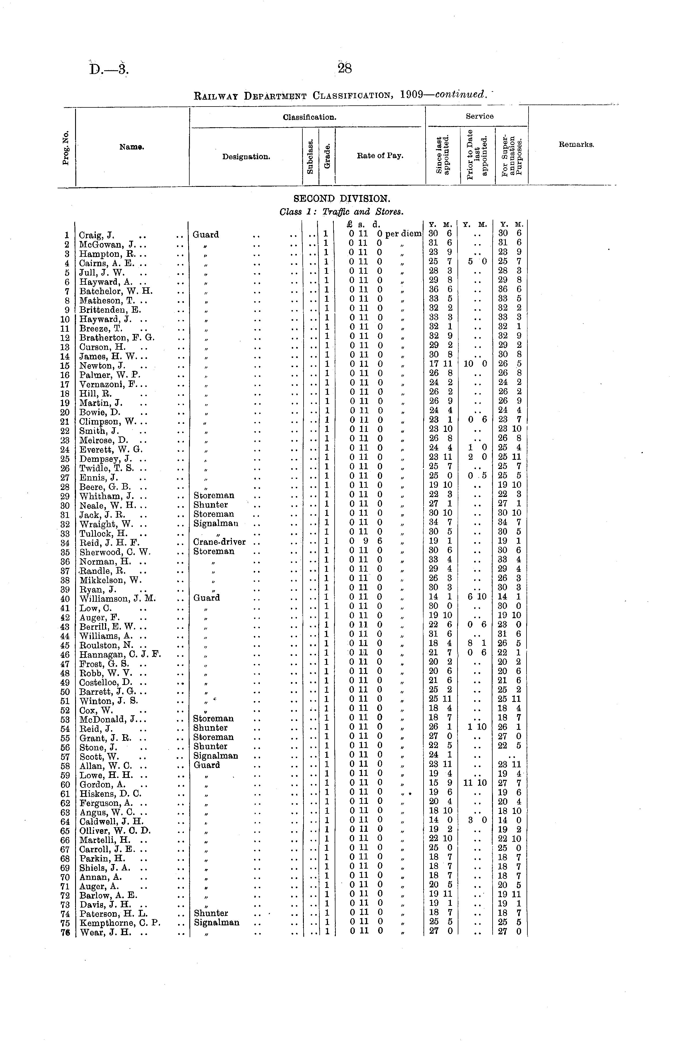 Clasi iifici ition. Service 6 z 5 H 2* Name. Designation. w w <s o 02 9 en u I Kate of Pay. £S 0 43S 3-S °g.3 aft g a 3 9 -a 9 ft A 0 ■ <a o a? rn d ° Sh ° S o dp Remarks. SI 1CC IND DIVISION. Class 1 : Tra ffic and Stores. 1 2 3 4 5 6 7 8 9 10 11 12 18 14 15 16 17 18 19 20 21 22 28 24 25 26 27 28 29 30 31 32 83 84 85 36 37 38 39 40 41 42 43 44 45 46 47 48 49 50 51 52 58 54 55 56 57 58 59 60 61 02 63 64 05 6G 67 68 69 70 71 72 73 74 75 76 Craig, J. McGowan, J. .. Hampton, R. .. Cairns, A. E. Jull, J. W. Hayward, A. .. Batchelor, W. H. Matheson, T. .. Brittenden, E, Hayward, J. .. Breeze,T. Bratherton, F. G. Curson, H. James, H. W. .. Newton, J. Palmer, W. P. Vernazoni, P. .. Hill, R. Martin, J. Bowie, D. Climpson, W. .. Smith, J. Melrose, D. .. Everett, W. G. Dempsey, J. .. Twidle, T. S. Ennis, J. Beere, G. B. Whitham, J. .. Neale, W. H. .. Jack, J. R. Wraight, W. .. Tullock, H. .. Reid, J. H. P. Sherwood, 0. W. Norman, H. .. •Randle, R. Mikkelson, W. Ryan, J. Williamson, J. M. Low, 0. Auger, P. Berrill, E. W. .. Williams, A. .. Roulston, N. .. Hannagan, 0. J. P. Frost, G. S. Robb, W. V. Costelloe, D. .. Barrett, J. G. .. Winton, J. S. Cox, W. McDonald, J... Reid, J. Grant, J. R. Stone, J. Scott, W. Allan, W. 0. Lowe, H. H. Gordon, A. Hiskens, D. 0. Ferguson, A. .. Angus, W. 0. Caldwell, J. H. Olliver, W. 0. D. Martelli, H. .. Carroll, J. E. .. Parkin, H. Shiels, J. A. Annan, A. Auger, A. Barlow, A. E. Davis, J. H. Paterson, H. L. Kempthorne, 0. P. Wear, J. H. Guard Storeman Shunter Storeman Signalman Crane-driver .. Storeman 1 1 1 1 1 1 1 1 1 1 1 1 1 1 1 1 1 1 1 1 1 1 1 1 1 1 1 1 1 1 1 1 1 1 1 1 1 1 1 1 1 1 1 1 1 1 1 1 1 1 1 1 1 1 1 1 1 1 1 1 1 1 1 1 1 1 1 1 1 1 1 1 1 1 1 1 £ 8. d. 0 11 0 per diem 0 11 0 0 11 0 0 11 0 0 11 0 0 11 0 0 11 0 0 11 0 0 11 0 0 11 0 0 11 0 0 11 0 0 11 0 0 11 0 0 11 0 0 11 0 0 11 0 0 11 0 0 11 0 0 11 0 0 11 0 0 11 0 0 11 0 0 11 0 0 11 0 0 11 0 0 11 0 0 11 0 0 11 0 0 11 0 0 11 0 0 11 0 0 11 0 0 9 6 0 11 0 0 11 0 0 11 0 0 11 0 0 11 0 0 11 0 0 11 0 0 11 0 0 11 0 0 11 0 0 11 0 0 11 0 0 11 0 0 11 0 0 11 0 0 11 0 0 11 0 0 11 0 0 11 0 0 11 0 0 11 0 0 11 0 0 11 0 0 11 0 0 11 0 0 11 0 0 11 0 0 11 0 0 11 0 0 11 0 0 11 0 0 11 0 0 11 0 0 11 0 0 11 0 0 11 0 0 11 0 0 11 0 0 11 0 0 11 0 0 11 0 0 11 0 Y. M. 30 6 31 6 23 9 25 7 28 3 29 8 36 6 33 5 32 2 33 3 32 1 32 9 29 2 30 8 17 11 26 8 24 2 26 2 26 9 24 4 23 1 23 10 26 8 24 4 23 11 25 7 25 0 19 10 22 3 27 1 30 10 34 7 30 5 19 1 30 6 33 4 29 4 26 3 30 3 14 1 30 0 19 10 22 6 31 6 18 4 21 7 20 2 20 6 21 6 25 2 25 11 18 4 18 7 26 1 27 0 22 5 24 1 23 11 19 4 15 9 19 6 20 4 18 10 14 0 19 2 22 10 25 0 18 7 18 7 18 7 20 5 19 11 19 1 18 7 25 5 27 0 Y. M. 5*0 10**0 0**6 1**0 2 0 0*5 Y. M. 30 6 31 6 23 9 25 7 28 3 29 8 36 6 33 5 32 2 33 3 32 1 32 9 29 2 30 8 26 5 26 8 24 2 26 2 26 9 24 4 23 7 23 10 26 8 25 4 25 11 25 7 25 5 19 10 22 3 27 1 30 10 34 7 30 5 19 1 30 6 33 4 29 4 26 3 30 3 14 1 30 0 19 10 23 0 31 6 26 5 22 1 20 2 20 6 21 6 25 2 25 11 18 4 18 7 26 1 27 0 22 5 Guar3 610 0**6 8**1 0 6 Storeman Shunter Storeman Shunter Signalman Guard 1*10 11 10 3 "o 23 11 19 427 7 19 6 20 4 18 10 14 0 19 2 22 10 25 0 18 7 18 7 18 7 20 5 19 11 19 1 18 7 25 5 27 0 Shunter .. • Signalman