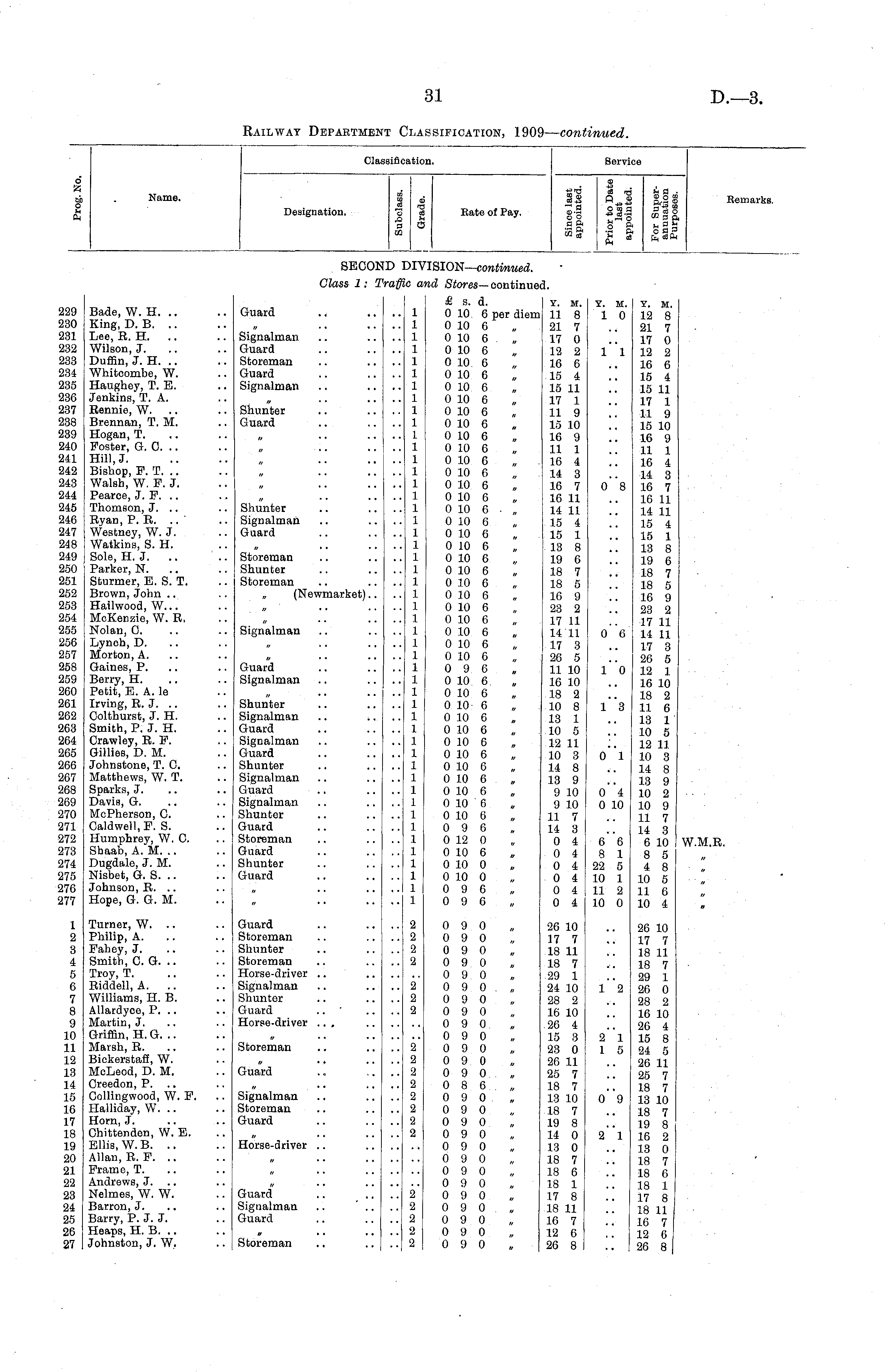 Class sification. Service d Z DO 5 SiPh Name. Designation. CO 2 3 £ "B o ca a >4 •3 o CG Bate of Pay. © S& o ft 019 g 9 i, a ■ &2S i^° m a a 44 a a 3 a a fa ceft Remarks. SECOI 'IV 'ISION— continued. Class 1: 5 1 m nd Stores— continuec I. 229 !30 231 m 133 !34 235 236 237 238 239 240 211 242 !43 244 245 246 247 248 249 250 251 !52 253 254 255 256 257 258 259 260 261 2G2 263 !64 !65 !66 207 168 209 170 271 172 273 !74 !75 176 177 Bade, W. H. King, D. B. .. Lee, R. H. Wilson, J. Duffin, J. H. .. Whitcombe, W. Haughoy, T. E. Jenkins, T. A. Rennie, W. Brennan, T. M. Hogan, T. Foster, G. 0. Hill, J. Bishop, P. T. .. Walsh, W. P. J. Pearce, J. P. Thomson, J. .. Ryan, P. R. Westney, W. J. Watkins, S. H. Sole, H. J. Parker, N. Sturmer, E. S. T. Brown, John .. Hailwood, W... McKenzie, W. R, Nolan, 0. Lynch, D. Morton, A. Gaines, P. Berry, H. Petit, E. A. le Irving, R. J. Colthurst, J. H. Smith, P. J. H. Crawley, R. F. Gillies, D. M. Johnstone, T. 0. Matthews, W. T. Sparks, J. Davis, G. MoPherson, C. Caldwell, P. S. Humphrey, W. C Shaab, A. M. .. Dugdale, J. M. Nisbet, G. S. Johnson, R. .. Hope, G. G. M. Guard .. Signalman Guard Storeman Guard Signalman Shunter Guard Shunter Signalman Guard Storeman Shunter Storeman (Newmarket).. 1 1 1 1 1 1 1 1 1 1 1 1 1 1 1 1 1 1 1 1 1 1 1 1 1 1 1 1 1 1 1 1 1 1 1 1 1 1 1 1 1 1 1 1 1 1 1 1 1 £ s. d. 0 10 6 per diem 0 10 6 0 10 6 . „ 0 10 6 0 10 6 0 10 6 0 10 6 0 10 6 0 10 6 0 10 6 0 10 6 0 10 6 0 10 6 0 10 6 0 10 6 0 10 6 0 10 6 ■ „ 0 10 6 0 10 6 0 10 6 0 10 6 0 10 6 0 10 6 0 10 6 0 10 6 0 10 6 0 10 6 0 10 6 0 10 6 0 9 6 0 10 6 0 10 6 0 10 6 0 10 6 0 10 6 0 10 6 0 10 6 0 10 6 0 10 6 0 10 6 0 10 6 0 10 6 0 9 0 0 12 0 0 10 6 0 10 0 0 10 0 0 9 6 0 9 6 Y. M. 11 8 21 7 17 0 12 2 16 6 15 4 15 11 17 1 11 9 15 10 16 9 11 1 16 4 14 3 16 7 16 11 14 11 15 4 15 1 13 8 19 6 18 7 18 5 16 9 23 2 17 11 14 11 17 3 26 5 11 10 16 10 18 2 10 8 13 1 10 5 12 11 10 3 14 8 13 9 9 10 9 10 11 7 14 3 0 4 0 4 0 4 0 4 0 4 0 4 Y. M. 1 0 1*1 o"8 Y. M. 12 8 21 7 17 0 12 2 16 6 15 4 15 11 17 1 11 9 15 10 16 9 11 1 16 4 14 3 16 7 16 11 14 11 15 4 15 1 13 8 19 6 18 7 18 5 16 9 23 2 17 11 14 11 17 3 26 5 12 1 16 10 18 2 11 6 13 1' 10 5 12 11 10 3 14 8 13 9 10 2 10 9 11 7 14 3 6 10 8 5 4 8 10 5 11 6 10 4 Signalman 0 "6 Guard Signalman 1 "o Shunter Signalman Guard Signalman Guard Shunter Signalman Guard Signalman Shunter Guard Storeman Guard Shunter Guard 1 **3 0 "l o"4 0 10 6 6 8 1 22 5 10 1 11 2 10 0 W.M.R. 1 2 3 4 5 6 7 8 9 10 11 12 18 14 15 16 17 18 19 20 21 22 23 24 25 26 27 Turner, W. .. Philip, A. Fahey, J. Smith, CG... Troy, T. Riddell, A. .. Williams, H. B. Allardyce, P. .. Martin, J. Griffin, H. G. .. Marsh, R. Bickerstafi, W. McLeod, D. M. Creedon, P. .. Collingwood, W. F. Halliday, W. .. Horn, J. Chittenden, W. E. Ellis, W.B. .. Allan, R. P. .. Frame, T. Andrews, J. Nelmes, W. W. Barron, J. Barry, P. J. J. Heaps, H. B. Johnston, J. W, Guard Storeman Shunter Storeman Horse-driver Signalman Shunter Guard .. ' Horse-driver ... Storeman Guard Signalman Storeman Guard 2 2 2 2 2 2 2 2 2 2 2 2 2 2 2 0 9 0 0 9 0 0 9 0 0 9 0 0 9 0 0 9 0 . 0 9 0 0 9 0 0 9 0 0 9 0 0 9 0 0 9 0 0 9 0 0 8 6 0 9 0 0 9 0 0 9 0 0 9 0 0 9 0 0 9 0 0 9 0 0 9 0 0 9 0 0 9 0 0 9 0 0 9 0 0 9 0 26 10 17 7 18 11 18 7 .29 1 24 10 28 2 16 10 26 4 15 3 23 0 26 11 25 7 18 7 13 10 18 7 19 8 14 0 13 0 18 7 18 6 18 1 17 8 18 11 16 7 12 6 26 8 1*2 2 "l 1 5 26 10 17 7 18 11 18 7 29 1 26 0 28 2 16 10 26 4 15 8 24 5 26 11 25 7 18 7 13 10 18 7 19 8 16 2 13 0 18 7 18 6 18 1 17 8 18 11 16 7 12 6 26 8 0 "9 Horse-driver 2 "l Guard Signalman .. Guard 2 2 2 2 2 Storeman