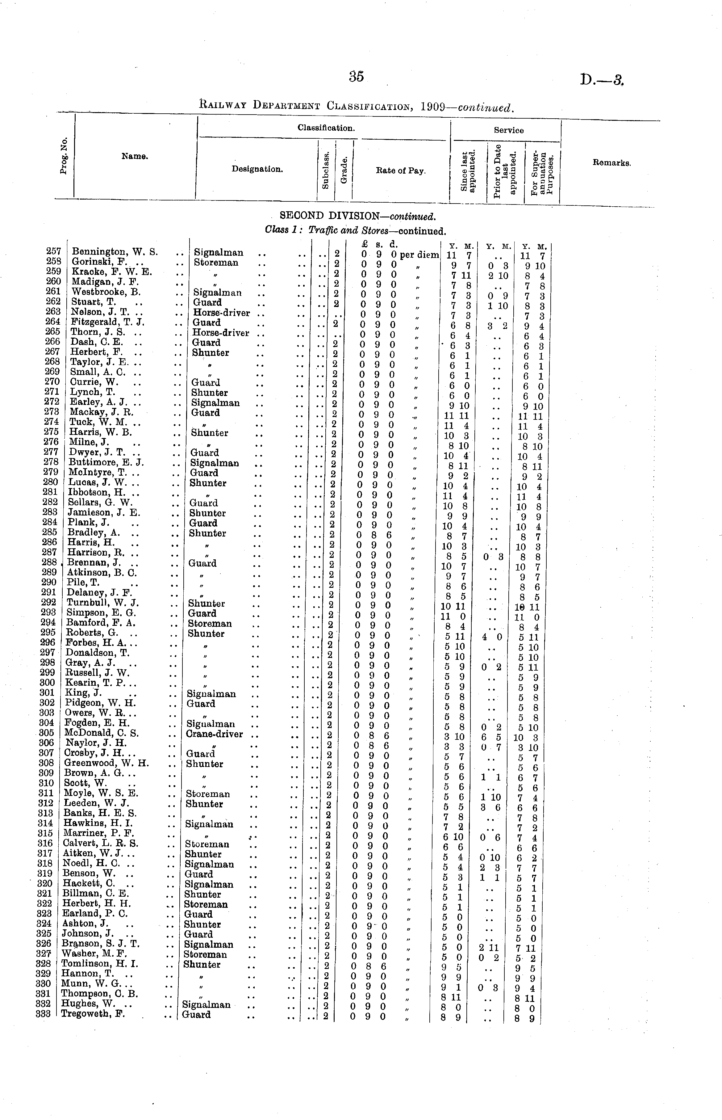 Classification. Service 3* A §> Name. Designation. I 4 a ce ■§ s 03 l_ Rate of Pay. it I J |ls 3-3 °fa Jhaa' gg, "-p. *aa || .2 a S3 5 w * £ ca pcceft Remarks. seco: ID ) DP TSION— continued. Class 1: \a\ %ffic ( nd Stores —continued Ll. 257 258 259 260 261 262 263 264 265 266 267 268 269 270 271 272 273 274 275 276 277 278 279 280 281 282 283 284 285 286 287 288 . 289 290 291 292 I 293 294 295 296 297 298 299 300 301 302 303 304 305 306 307 308 309 310 311 312 313 314 315 316 317 318 319 320 321 322 323 324 325 , 326 : 327 ' 328 ! 329 : 330 : 331 . 332 : 333 . f Bennington, W. S. ! Gorinski, F. .. I Kraoke, F. W. E. ) Madigan, J. F. Westbrooke, B. 1 Stuart, T. 1 Nelson, J. T. .. : Fitzgerald, T. J. i Thorn, J. S. i Dash, CE. Herbert, F. .. Taylor, J. E. .. Small, A. 0. Currie, W. Lynch, T. Earley, A. J. Mackay, J. R. Tuck, W. M. .. Harris, W. B. Milne, J. Dwyer, J. T. Buttimore, E. J. Mclntyre, T. .. Luoas, J. W. Ibbotson, H. .. Sellars, G. W. Jamieson, J. E. Plank, J. Bradley, A. .. Harris, H. Harrison, R. .. , Brennan, J. .. Atkinson, B. 0. Pile, T. Delaney, J. P. I Turnbull, W. J. Simpson, E. G. Bamford, P. A. Roberts, G. .. Forbes, H. A. .. Donaldson, T. Gray, A. J. Russell, J. W. Kearin, T. P. .. King, J. Pidgeon, W. H. Owers, W. R. .. Fogden, E. H. McDonald, 0. S. Naylor, J. H. Crosby, J. H. .. Greenwood, W. H. Brown, A. G. .. Soott, W. Moyle, W. S. E. Leeden, W. J. Banks, H. E. S. Hawkins, H. I. Marriner, P. F. Calvert, L. R. S. Aitken, W. J. .. Noedl, H. 0. Benson, W. .. Hackett, 0. .. Billman, 0. E. Herbert, H. H. Earland, P. 0. Ashton, J. Johnson, J. Branson, S. J. T. Washer, M. P. Tomlinson, H. I. Hannon, T. .. Munn, W. G. .. Thompson, 0. B. Hughes, W. .. Tregoweth, P. .. i i .. ( . Signalman . Storeman . Signalman . Guard . Horse-driver .. . Guara . Horse-ariver .. . Guara . Shunter Guard Shunter Signalman Guara Shunter Guara Signalman Guara Shunter Guard Shunter Guard Shunter Guara Shunter Guard Storeman Shunter . 2 . 2 . 2 . 2 . 2 . 2 ' 2* . 2 . 2 . 2 . 2 . 2 . 2 . 2 . 2 . 2 . 2 . 2 . 2 , 2 . 2 2 2 2 2 2 2 2 2 2 2 2 2 2 2 2 2 2 2 2 2 2 2 2 2 2 2 2 2 2 2 2 2 2 2 2 2 2 2 2 2 2 2 2 2 2 2 2 2 2 2 2 2 2 2 £ a. a. 0 9 0 per diem 0 9 0 0 9 0 0 9 0 0 9 0 0 9 0 0 9 0 0 9 0 0 9 0 0 9 0 0 9 0 0 9 0 0 9 0 0 9 0 0 9 0 0 9 0 0 9 0 0 9 0 0 9 0 0 9 0 0 9 0 0 9 0 0 9 0 0 9 0 0 9 0 0 9 0 0 9 0 0 9 0 0 8 6 0 9 0 0 9 0 0 9 0 0 9 0 0 9 0 0 9 0 0 9 0 0 9 0 0 9 0 0 9 0 0 9 0 0 9 0 0 9 0 0 9 0 0 9 0 0 9 0 0 9 0 0 9 0 0 9 0 0 8 6 0 8 6 0 9 0 0 9 0 0 9 0 0 9 0 0 9 0 0 9 0 „ 0 9 0 0 9 0 0 9 0 0 9 0 0 9 0 0 9 0 0 9 0 0 9 0 0 9 0 0 9 0 0 9 0 0 9 0 0 9 0 0 9 0 0 9 0 0 8 6 0 9 0 0 9 0 0 9 0 0 9 0 0 9 0 Y. M. 11 7 9 7 7 11 7 8 7 3 7 3 7 3 6 8 6 4 ■ 6 3 6 1 6 1 6 1 6 0 6 0 9 10 11 11 11 4 10 3 8 10 10 4 8 11 9 2 10 4 11 4 10 8 9 9 10 4 8 7 10 3 8 5 10 7 9 7 8 6 8 5 10 11 11 0 8 4 5 11 5 10 5 10 5 9 5 9 5 9 5 8 5 8 5 8 5 8 3 10 3 3 5 7 5 6 5 6 5 6 5 6 5 5 7 8 7 2 6 10 6 6 5 4 5 4 5 3 5 1 5 1 5 1 5 0 5 0 5 0 5 0 5 0 9 5 9 9 9 1 8 11 8 0 8 9 Y. M. 0*3 2 10 0*9 1 10 3 2 0 3 4 "o Y. M, 11 7 9 10 8 4 7 8 7 3 8 3 7 3 9 4 6 4 6 3 6 1 6 1 6 1 6 0 6 0 9 10 11 11 11 4 10 3 8 10 10 4 8 11 9 2 10 4 11 4 10 8 9 9 10 4 8 7 10 3 8 8 10 7 9 7 8 6 8 5 10 11 11 0 8 4 5 11 5 10 5 10 5 11 5 9 5 9 5 8 5 8 5 8 5 10 10 3 3 10 5 7 5 6 6 7 5 6 7 4 6 6 7 8 7 2 7 4 6 6 6 2 7 7 5 7 5 1 5 1 5 1 5 0 5 0 5 0 7 11 5 2 9 5 9 9 9 4 8 11 8 0 0 *2 Signalman Guara Signalman Crane-driver 0 2 6 5 0 7 Guard Shunter 1*1 Storeman Shunter l'io 3 6 Signalman Storeman Shunter Signalman Guard Signalman Shunter Storeman Guard Shunter Guara Signalman Storeman Shunter 0*6 0 10 2 3 1 1 211 0 2 l < I 0*3 ( Signalman .. Guara .. .. . £ ( (