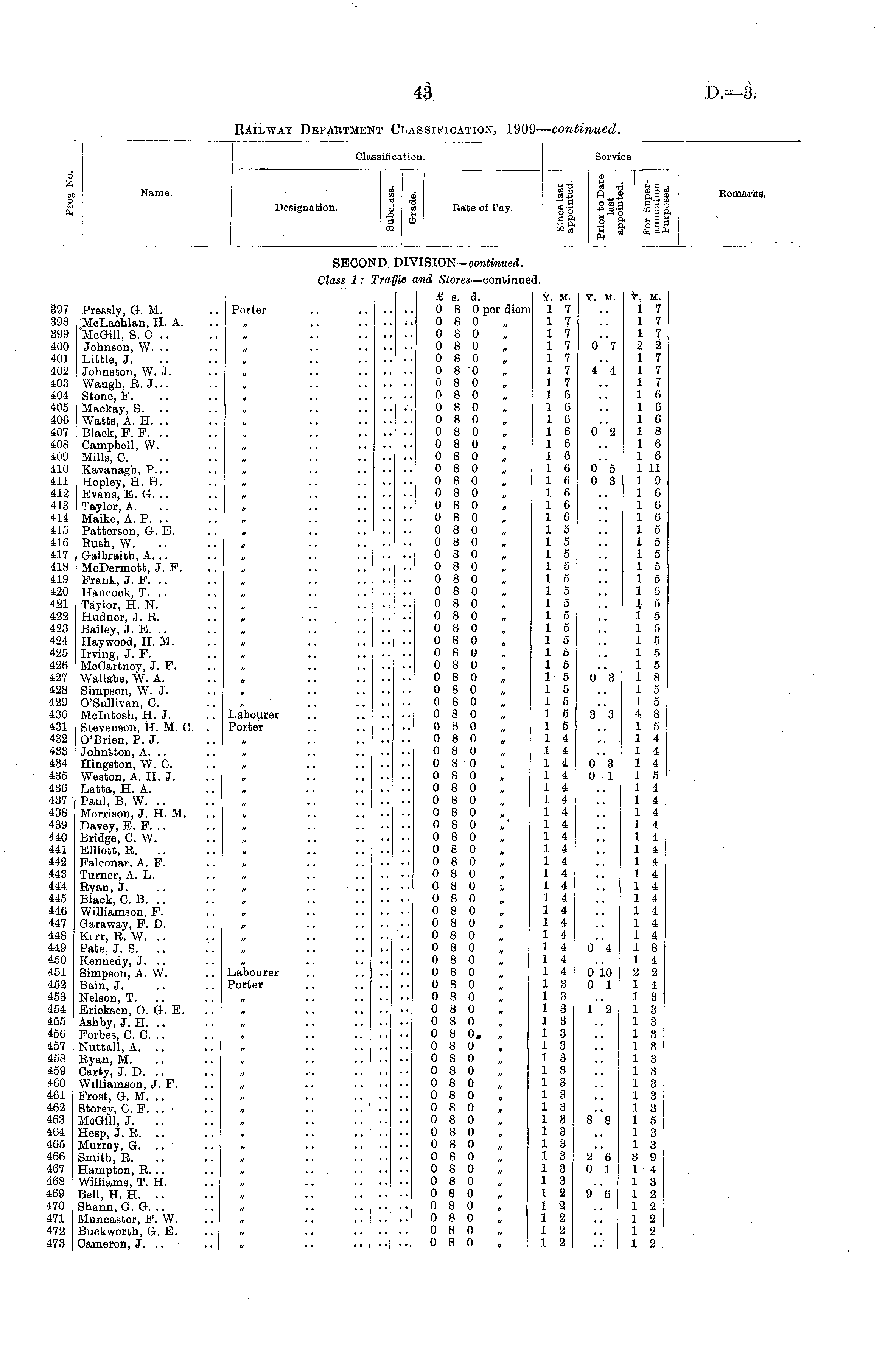 o' A DO o Name. Designation. Classification. CO CO £ a s 03 Rate of Pay. it Li III si m sga ill I a sag J 3 ce £ ce fa ceft Service Remarks. SECOI Class 1: D >r I SION— continued. "to, lc ind Stores —oontinuei .. 397 398 399 400 401 402 403 404 405 406 407 408 409 410 411 412 413 414 415 416 417 418 419 420 421 422 423 424 425 426 427 428 429 430 431 432 433 434 435 436 437 438 439 440 441 442 443 444 445 446 447 448 449 450 451 452 453 454 455 456 457 458 459 460 461 462 463 464 465 466 467 468 469 470 471 472 Pressly, G. M. 'McLachlan, H. A. McGill, S. 0. .. Johnson, W. .. Little, J. Johnston, W. J. Waugh, R. J... Stone, F. Mackay, S. .. Watts, A. H. .. Black, F. P. .. Campbell, W. Mills, 0. Kavanagh, P... Hopley, H. H. Evans, E.G... Taylor, A. Maike, A. P. .. Patterson, G. E. Rush, W. Galbraith, A. .. McDermott, J. P. Prank, J. P. .. Hancock, T. .. Taylor, H. N. Hudner, J. R. Bailey, J. E. .. Haywood, H. M. Irving, J. P. McCartney, J. P. Wallace, W. A. Simpson, W. J. O'Sullivan, 0. Mcintosh, H. J. Stevenson, H. M. C O'Brien, P. J. Johnston, A. .. Hingston, W. 0. Weston, A. H. J. Latta, H. A. Paul, B. W. .. Morrison, J. H. M. Davey, E. F. .. Bridge, 0. W. Elliott, R. Falconar, A. P. Turner, A. L. Ryan, J. Black, G. B. .. Williamson, P. Garaway, P. D. Kerr, R. W. .. Pate, J. S. Kennedy, J. .. Simpson, A. W. Bain, J. Nelson, T. .. Ericksen, 0. G. E. Ashby, J. H. .. Forbes, CO... Nuttall, A. .. Ryan, M. Oarty, J. D. .. Williamson, J. F. Frost, G. M. .. Storey, 0. P. .. McGill, J. .. Hesp, J. R. .. Murray, G. .. Smith, R. Hampton, R. .. Williams, T. H. Bell, H. H. .. Shann, G. G. .. Muncaster, P. W. Buckworth, G. E. n t Porter Labourer Porter £ a. d. 0 8 0 per diem 0 8 0 0 8 0 0 8 0 0 8 0 0 8 0 0 8 0 0 8 0 0 8 0 0 8 0 0 8 0 0 8 0 0 8 0 0 8 0 0 8 0 0 8 0 0 8 0 0 8 0 0 8 0 0 8 0 0 8 0 0 8 0 0 8 0 0 8 0 0 8 0 0 8 0 0 8 0 0 8 0 0 8 0 0 8 0 0 8 0 0 8 0 0 8 0 0 8 0 0 8 0 0 8 0 0 8 0 0 8 0 0 8 0 0 8 0 0 8 0 0 8 0 0 8 0 0 8 0 0 8 0 0 8 0 0 8 0 0 8 0 0 8 0 0 8 0 0 8 0 0 8 0 0 8 0 0 8 0 0 8 0 0 8 0 0 8 0 0 8 0 0 8 0 0 8 0. „ 0 8 0 „ 0 8 0 0 8 0 0 8 0 0 8 0 0 8 0 0 8 0 0 8 0 0 8 0 0 8 0 0 8 0 0 8 0 0 8 0 0 8 0 0 8 0 0 8 0 0 8 0 y. m. 1 7 1 7 1 7 1 7 1 7 1 7 1 7 1 6 1 6 1 6 1 6 1 6 1 6 1 6 1 6 1 6 1 6 1 6 1 5 1 5 1 5 1 5 1 5 1 5 1 5 1 5 1 5 1 5 1 5 1 5 1 5 1 5 1 5 1 5 1 5 1 4 1 4 1 4 1 4 1 4 1 4 1 4 1 4 1 4 1 4 1 4 1 4 1 4 1 4 1 4 1 4 1 4 1 4 1 4 1 4 1 3 1 3 1 3 1 3 1 3 1 3 1 3 1 3 1 3 1 3 1 3 1 3 1 3 1 3 1 3 1 3 1 3 1 2 1 2 1 2 1 2 1 2 Y. M. 0**7 4**4 0**2 0**5 0 3 0**3 3 *3 0*3 0 1 Y. M. 1 7 1 7 1 7 2 2 1 7 1 7 1 7 1 6 1 6 1 6 1 8 1 6 1 6 1 11 1 9 1 6 1 6 1 6 1 5 1 5 1 5 1 5 1 5 1 5 1 5 1 5 1 5 1 5 1 5 1 5 1 8 1 5 1 5 4 8 1 5 1 4 1 4 1 4 1 5 1 4 1 4 1 4 1 4 1 4 1 4 1 4 1 4 1 4 1 4 1 4 1 4 1 4 1 8 1 4 2 2 1 4 1 3 1 3 1 3 1 3 I 3 1 3 1 3 1 3 1 3 1 3 1 5 1 3 1 3 3 9 1 4 1 3 1 2 1 2 1 2 1 2 0 4 Labourer Porter 0 10 0 1 1 *2 8**8 2**6 0 1 9**6