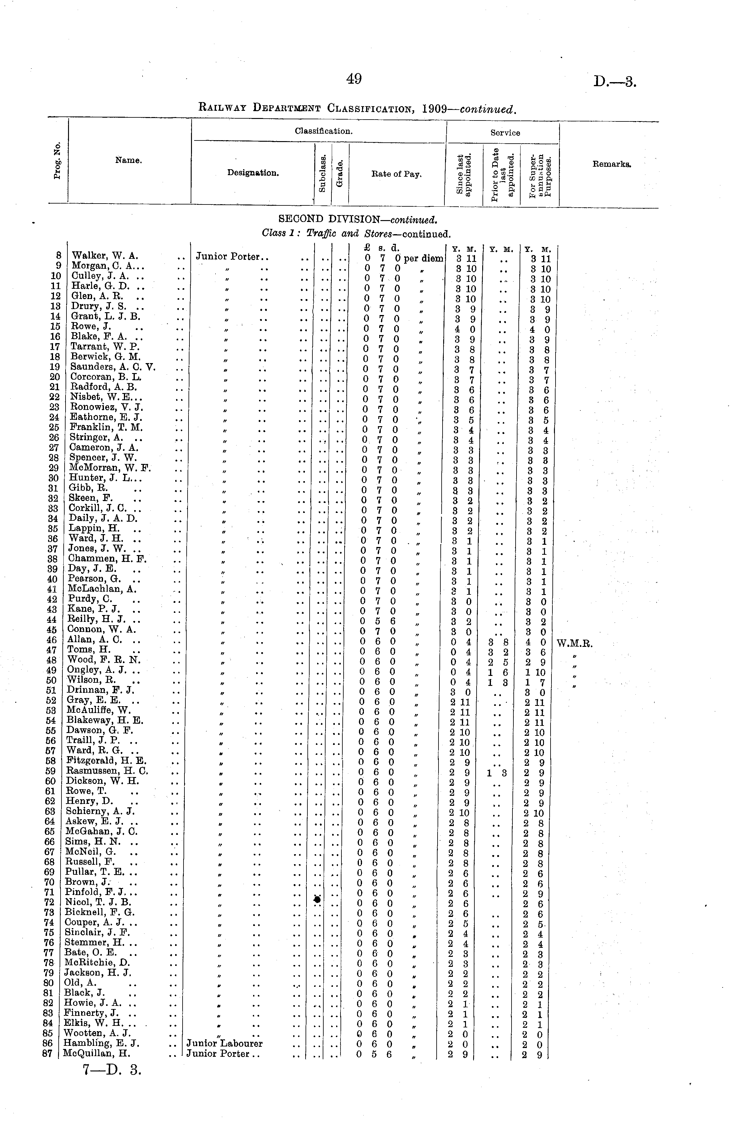 Clasi dfication. Service d A DC 3 44 ft Name. co i a S £ 03 Rate of Pay. 3 m'B O Cj £2 as 3.9 °v .9 o 3 4j ca o a a o" °< 55 ft -2 a ul ce 4. ce ft ft3 01 3 t 3 03 3 a 4US 3 3 3 fa ceft Remarks. Designation. SECOl D DIV 'ISION— continued. Glass 1: 5 ra. \c a: nd Stores—continue( i. 8 9 10 11 12 18 14 15 16 17 18 19 20 21 22 23 24 25 26 27 28 29 30 31 32 33 34 35 36 37 38 39 40 41 42 43 44 45 46 47 48 49 50 51 52 53 54 55 56 57 58 59 60 61 62 63 64 65 66 67 68 69 70 71 72 73 74 75 76 77 78 79 80 81 82 83 84 85 86 87 Walker, W. A. Morgan, 0. A... Culley, J. A. .. Harle, G. D. Glen, A. R. Drury, J. S. Grant, L. J. B. Rowe, J. Blake, P. A. Tarrant, W. P. Berwick, G. M. Saunders, A. 0. V. Corcoran,B. L. Radford, A. B. Nisbet, W.E... Ronowiez, V. J. Eathorne, E. J. Franklin, T. M. Stringer, A. .. Cameron, J. A. Spencer, J. W. McMorran, W. F. Hunter, J. L... Gibb,R. Skeen, P. Corkill, J. 0. Daily, J. A. D. Lappin, H. Ward, J. H. .. Jones, J. W. Chammen, H. P. Day, J. E. Pearson, G. McLaohlan, A. Purdy, 0. Kane, P. J. Reilry, H. J. .. Connon, W. A. Allan, A. 0. Toms, H. Wood, P. R. N. Ongley, A. J. Wilson, R. .. Drinnan, F. J. Gray, E. E. McAuliffe, W. Blakeway, H. E. Dawson, G, F. Traill, J. P. Ward, R. G. Fitzgerald, H. E. RasmuBsen, H. 0. Dickson, W. H. Rowe, T. Henry, D. Schierny, A. J. Askew, E.J. McGahan, J. 0. Sims, H. N. .. McNeil, G. .. Russell, P. .. Pullar, T. E. .. Brown, J. Pinfold, F.J... Nicol, T. J. B. Bicknell, P. G. Couper, A. J. Sinclair, J. P. Stemmer, H. .. Bate, 0. E. MoRitchie, D. Jackson, H. J. Old, A. Black, J. Howie, J. A. Pinnerty, J. .. Elkis, W. H. .. . Wootten, A. J. Hamming, E. J. McQuillan, H. Junior Porter.. £ s. d. 0 7 0 per diem 0 7 0 „ 0 7 0 0 7 0 0 7 0 0 7 0 0 7 0 0 7 0 0 7 0 0 7 0 0 7 0 0 7 0 0 7 0 0 7 0 0 7 0 „ 0 7 0 0 7 0 •„ 0 7 0 0 7 0 0 7 0 0 7 0 0 7 0 0 7 0 0 7 0 0 7 0 0 7 0 0 7 0 0 7 0 0 7 0 . „ 0 7 0 0 7 0 0 7 0 0 7 0 0 7 0 0 7 0 0 7 0 0 5 6 0 7 0 0 6 0 0 6 0 0 6 0 0 6 0 0 6 0 0 6 0 0 6 0 0 6 0 0 6 0 0 6 0 0 6 0 0 6 0 0 6 0 0 6 0 0 6 0 0 6 0 0 6 0 0 6 0 0 6 0 0 6 0 0 6 0 „ 0 6 0 „ 0 6 0 0 6 0 0 6 0 0 6 0 0 6 0 0 6 0 0 6 0 0 6 0 0 6 0 0 60 0 6 0 0 6 0 0 6 0 0 6 0 0 6 0 0 6 0 0 6 0 0 6 0 0 6 0 0 5 6 Y. M. 3 11 3 10 3 10 3 10 3 10 3 9 3 9 4 0 3 9 3 8 3 8 3 7 3 7 3 6 3 6 3 6 3 5 3 4 3 4 3 3 3 3 3 3 3 3 8 3 3 2 3 2 3 2 3 2 3 1 3 1 3 1 3 1 3 1 3 1 3 0 3 0 3 2 3 0 0 4 0 4 0 4 0 4 0 4 3 0 2 11 2 11 2 11 2 10 2 10 2 10 2 9 2 9 2 9 2 9 2 9 2 10 2 8 2 8 2 8 2 8 2 8 2 6 2 6 2 6 2 6 2 6 2 5 2 4 2 4 2 3 2 3 2 2 2 2 2 2 2 1 2 1 2 1 2 0 2 0 2 9 Y. M. 3 8 3 2 2 5 1 6 1 3 Y. M. 3 11 3 10 3 10 3 10 3 10 3 9 3 9 4 0 3 9 3 8 3 8 3 7 3 7 3 6 3 6 3 6 3 5 3 4 3 4 3 3 3 3 3 3 3 3 3 3 3 2 3 2 3 2 3 2 3 1 3 1 3 1 3 1 3 1 3 1 3 0 3 0 3 2 3 0 4 0 3 6 2 9 1 10 1 7 3 0 2 11 2 11 2 11 2 10 2 10 2 10 2 9 2 9 2 9 2 9 2 9 2 10 2 8 2 8 2 8 2 8 2 8 2 6 2 6 2 9 2 6 2 6 2 5 2 4 2 4 2 3 2 3 2 2 2 2 2 2 2 1 2 1 2 1 2 0 2 0 2 9 W.M.R. 1*3 ji Junior Labourer Junior Porter ••