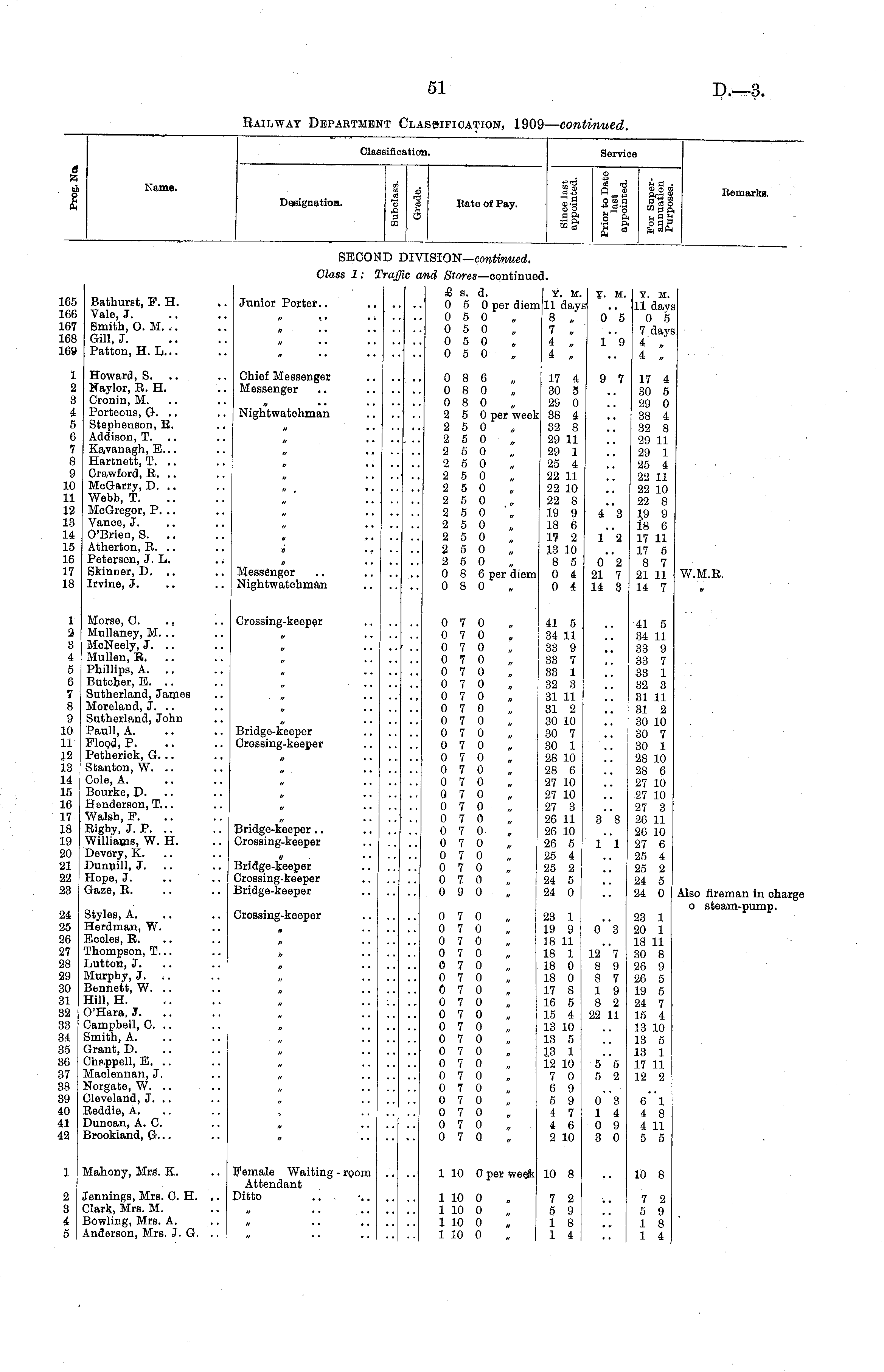 Clasi dfici Ltion. Service e z DO 3 Name. Designation. cc; ce .3 3 in CD ■B c3 4. a Rate of Pay. o S'B "ia eg sic 3 • 3-9 Si.9 i-Ns §a I s I aft .2 a S a a m <3 £ 9 gSft Remarks. SECON] iiy; :SION— continued. Class 1; Tt i at id Stores —continued 165 166 167 168 169 Bathurst, P. H. Vale, J. Smith, 0. M. .. Gill, J. Patton, H. L... Junior Porter.. £ a. d. 0 5 0 per diem 0 5 0 0 5 0 0 5 0 0 5 0 Y. M. 11 days 8 „ 7 „ 4 „ 4 „ y. m. 0**5 y. m. 11 davs 0 5 7 days 4 „ 4 „ 1**9 1 2 3 4 5 6 7 8 9 10 11 12 13 14 15 16 17 18 Howard, S. .. Naylor, R. H. Cronin, M. Porteous, G. .. Stephenson, R. Addison, T. .. Kavanagh, E... Hartnett, T. .. Crawford, R. .. McGarry, D. .. Webb, T. McGregor, P. .. Vance, J. O'Brien, S. .. Atherton, R. .. Petersen, J. L. ., Skinner, D. .. Irvine, J. Chief Messenger Messenger Nightwatohman 0 8 6 0 8 0 0 8 0 2 5 0 per week 2 5 0 2 5 0 2 5 0 2 5 0 2 5 0 2 5 0 2 5 0 2 5 0 '„ 2 5 0 2 5 0 2 5 0 2 5 0 0 8 6 per diem 0 8 0 17 4 30 S 29 0 38 4 32 8 29 11 29 1 25 4 22 11 22 10 22 8 19 9 18 6 17 2 13 10 8 5 0 4 0 4 9 7 17 4 30 5 29 0 38 4 32 8 29 11 29 1 25 4 22 11 22 10 22 8 19 9 18 6 17 11 17 5 8 7 21 11 14 7 4**3 # 1*2 Messenger Nightwatohman 0 2 21 7 14 3 W.M.R. 1 a 3 4 5 6 7 8 9 10 II 12 .13 14 15 16 17 18 19 20 21 22 23 Morse, O. Mullaney, M. .. MoNeely, J. .. Mullen, R. .. Phillips, A. .. Butcher, E. .. Sutherland, James Moreland, J. .. Sutherland, John Paull, A. .. Flood, P. Petherick, G. .. Stanton, W. Cole, A. Bourke, D. .. Henderson, T... Walsh, F. Rigby, J. P. .. Williams, W. H. Devery, K. Dunnill, J. Hope, J. Gaze, R. Crossing-keeper Bridge-keeper Crossing-keeper 0 7 0 0 7 0 0 7 0 0 7 0 0 7 0 0 7 0 0 7 0 0 7 0 0 7 0 0 7 0 0 7 0 0 7 0 0 7 0 0 7 0 0 7 0 0 7 0 0 7 0 0 7 0 0 7 0 0 7 0 0 7 0 0 7 0 0 9 0 41 5 34 11 33 9 33 7 33 1 32 3 31 11 31 2 30 10 30 7 30 1 28 10 28 6 27 10 27 10 27 3 26 11 26 10 26 5 25 4 25 2 24 5 24 0 41 5 34 11 33 9 33 7 33 1 32 3 31 11 31 2 30 10 30 7 30 1 28 10 28 6 27 10 27 10 27 3 26 11 26 10 27 6 25 4 25 2 24 5 24 0 Bridge-keeper Crossing-keeper 3 8 1 1 24 25 26 27 28 29 30 31 32 88 34 35 36 37 38 39 40 41 42 Styles, A. Herdman, W. Ecoles, R. Thompson, T... Lutton, J. Murphy, J. Bennett, W. .. Hill, H. O'Hara, 3. Campbell, 0. .. Smith, A. Grant, D. Ohnppell, E. .. Maclennan, J. Norgate, W. .. Cleveland, J. .. Reddie, A. Duncan, A. 0. Brookiand, G... it Bridge-keeper Crossing-keeper Bridge-keeper Crossing-keeper « ■ • 0 7 0 0 7 0 0 7 0 0 7 0 0 7 0 0 7 0 0 7 0 0 7 0 0 7 0 0 7 0 0 7 0 0 7 0 0 7 0 0 7 0 0 7 0 0 7 0 0 7 0 0 7 0 0 7 Q 23 1 19 9 18 11 18 1 18 0 18 0 17 8 16 5 15 4 13 10 13 5 13 1 12 10 7 0 6 9 5 9 4 7 4 6 2 10 0**3 23 1 20 1 18 11 30 8 26 9 26 5 19 5 24 7 15 4 13 10 13 5 13 1 17 11 12 2 Also fireman in oharge o steam-pump. 12 7 8 9 8 7 1 9 8 2 22 11 5**5 5 2 0 3 1 4 0 9 3 0 6 1 4 8 4 11 5 5 1 Mahony, Mrg. K. Female Waiting - room Attendant Ditto 1 10 0 per weejk 10 8 10 8 2 3 4 5 Jennings, Mrs. 0. H. ,. Clark, Mrs. M. Bowling, Mrs. A. Anderson, Mrs. J. G. .. I 1 10 0 1 10 0 1 10 0 1 10 0 7 2 5 9 1 8 1 4 7 2 5 9 1 8 1 4