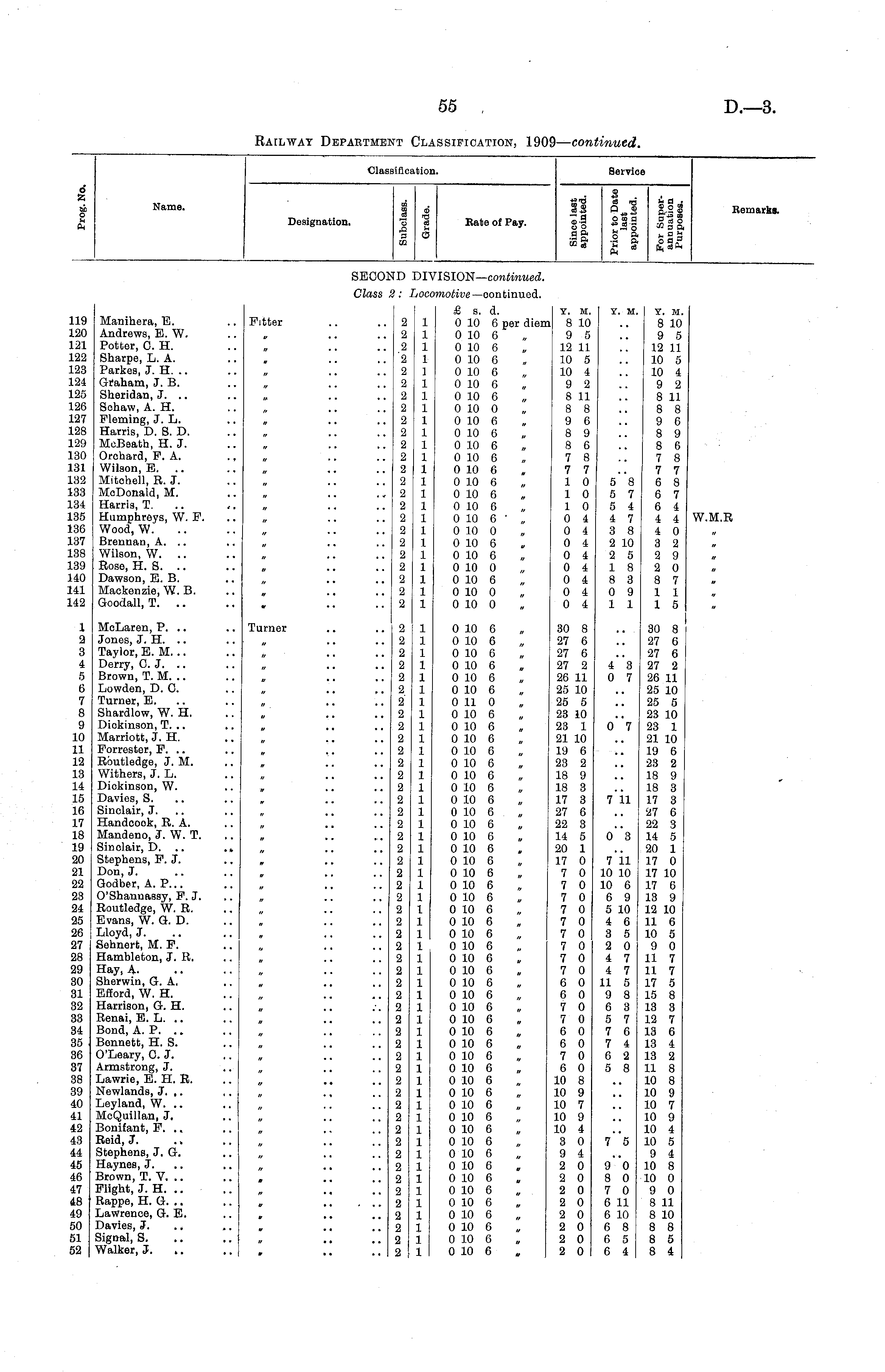 Clasi iifici btion. Servioe d A bh o 44 ft Name. W 3 13 0 m T3 cr3 U S3 Rate of Pay. S'B S3 o -S o o 0 g; BBS* ■2 ° 3.2 ■g a it a . CD o 2! a--4 © 4343 CO .5 ce 3 ■A a a ■-S3 Remarks. Designation. seco: D DIV ISION— continued. Class jOCOi motive —oontinuea. 119 120 121 122 123 124 125 126 127 128 129 130 131 132 133 134 135 136 137 138 139 140 141 142 Manihera, E. Andrews, E. W. Potter, 0. H. Sharpe, L. A. Parkes, J. H. .. Graham, J. B. Sheridan, J. .. Schaw, A. H. Fleming, J. L. Harris, D. S. D. McBeath, H. J. Orchard, P. A. Wilson, E. .. Mitchell, R. J. MoDonald, M. Harris, T. Humphreys, W. F. Wood, W. Brennan, A. .. Wilson, W. .. Rose, H. S. Dawson, E. B. Mackenzie, W. B. Goodall, T. .. Fitter 2 2 2 2 2 2 2 2 2 2 2 2 2 2 2 2 2 2 2 2 2 2 2 2 1 1 1 1 1 1 1 1 1 1 1 1 1 1 1 1 1 1 1 1 1 1 1 1 £ a. d. 0 10 6 per diem 0 10 6 0 10 6 0 10 6 0 10 6 0 10 6 0 10 6 0 10 0 0 10 6 0 10 6 0 10 6 0 10 6 0 10 6 0 10 6 0 10 6 0 10 6 0 10 6 ' „ 0 10 0 0 10 6 0 10 6 0 10 0 0 10 6 0 10 0 0 10 0 Y. M. 8 10 9 5 12 11 10 5 10 4 9 2 8 11 8 8 9 6 8 9 8 6 7 8 7 7 1 0 1 0 1 0 0 4 0 4 0 4 0 4 0 4 0 4 0 4 0 4 Y. M. Y. St. 8 10 9 5 12 11 10 5 10 4 9 2 8 11 8 8 9 6 8 9 8 6 7 8 7 7 6 8 6 7 6 4 4 4 4 0 3 2 2 9 2 0 8 7 1 1 1 5 5 8 5 7 5 4 4 7 3 8 2 10 2 5 1 8 8 3 0 9 1 1 W.M.R 1 2 3 4 5 6 7 8 9 10 11 12 13 14 15 16 17 18 19 20 21 22 23 24 25 26 27 28 29 30 31 32 33 34 35 36 37 38 39 40 41 42 43 44 45 46 47 48 49 50 51 52 McLaren, P. .. Jones, J. H. Taylor, E. M. .. Derry, C.J. Brown, T. M. .. Lowden, D. 0. Turner, E. Shardlow, W. H. Dickinson, T. .. Marriott, J. H. Forrester, F. .. Rbutledge, J. M. Withers, J. L. Dickinson, W. Davies, S. Sinclair, J. Handcook, R. A. Mandeno, J. W. T. Sinclair, D. .. Stephens, F. J. Don, J. Godber, A. P... O'Shannassy, P. J. Routledge, W. R. Evans, W. G. D. Lloyd, J. Sehnert, M. P. Hambleton, J. R. Hay, A. Sherwin, G. A. Efford, W. H. Harrison, G. H. Renai, E. L. Bond, A. P. Bennett, H. S. O'Leary, 0. J. Armstrong, J. Lawrie, E. H. R. Newlands, J. ,. Leyland, W. .. McQuillan, J. Bonifant, F. .. Reia, J. .. Stephens, J. G. Haynes, J. Brown, T. V. .. Flight, J. H. Rappe, H. G. .. Lawrence, G. E. Davies, J. Signal, S. Walker, J. Turner 2 2 2 2 2 2 2 2 2 2 2 2 2 2 2 2 2 2 2 2 2 2 2 2 2 2 2 2 2 2 2 2 2 2 2 2 2 2 2 2 2 2 2 2 2 2 2 2 2 2 2 2 1 1 1 1 1 1 1 1 1 1 1 1 1 1 1 1 1 1 1 1 1 1 1 1 1 1 1 1 1 1 1 1 1 1 1 1 1 1 1 1 1 1 1 1 1 1 1 1 1 1 1 1 0 10 6 0 10 6 0 10 6 0 10 6 0 10 6 0 10 6 0 11 0 0 10 6 0 10 6 0 10 6 0 10 6 0 10 6 0 10 6 0 10 6 0 10 6 0 10 6 0 10 6 0 10 6 0 10 6 0 10 6 0 10 6 0 10 6 0 10 6 0 10 6 0 10 6 0 10 6 0 10 6 0 10 6 0 10 6 0 10 6 0 10 6 0 10 6 0 10 6 0 10 6 0 10 6 0 10 6 0 10 6 0 10 6 0 10 6 0 10 6 0 10 6 0 10 6 0 10 6 0 10 6 0 10 6 0 10 6 0 10 6 0 10 6 0 10 6 0 10 6 0 10 6 0 10 6 30 8 27 6 27 6 27 2 26 11 25 10 25 5 23 10 23 1 21 10 19 6 23 2 18 9 18 3 17 3 27 6 22 3 14 5 20 1 17 0 7 0 7 0 7 0 7 0 7 0 7 0 7 0 7 0 7 0 6 0 6 0 7 0 7 0 6 0 6 0 7 0 6 0 10 8 10 9 10 7 10 9 10 4 3 0 9 4 2 0 2 0 2 0 2 0 2 0 2 0 2 0 2 0 4**3 0 7 0**7 r'ii 0**3 7 11 10 10 10 6 6 9 5 10 4 6 3 5 2 0 4 7 4 7 11 5 9 8 6 3 5 7 7 6 7 4 6 2 5 8 30 8 27 6 27 6 27 2 26 11 25 10 25 5 23 10 23 1 21 10 19 6 23 2 18 9 18 3 17 3 27 6 22 3 14 5 20 1 17 0 17 10 17 6 13 9 12 10 11 6 10 5 9 0 11 7 11 7 17 5 15 8 13 3 12 7 13 6 13 4 13 2 11 8 10 8 10 9 10 7 10 9 10 4 10 5 9 4 10 8 10 0 9 0 8 11 8 10 8 8 8 5 8 4 7**5 9 0 8 0 7 0 6 11 6 10 6 8 6 5 6 4 V