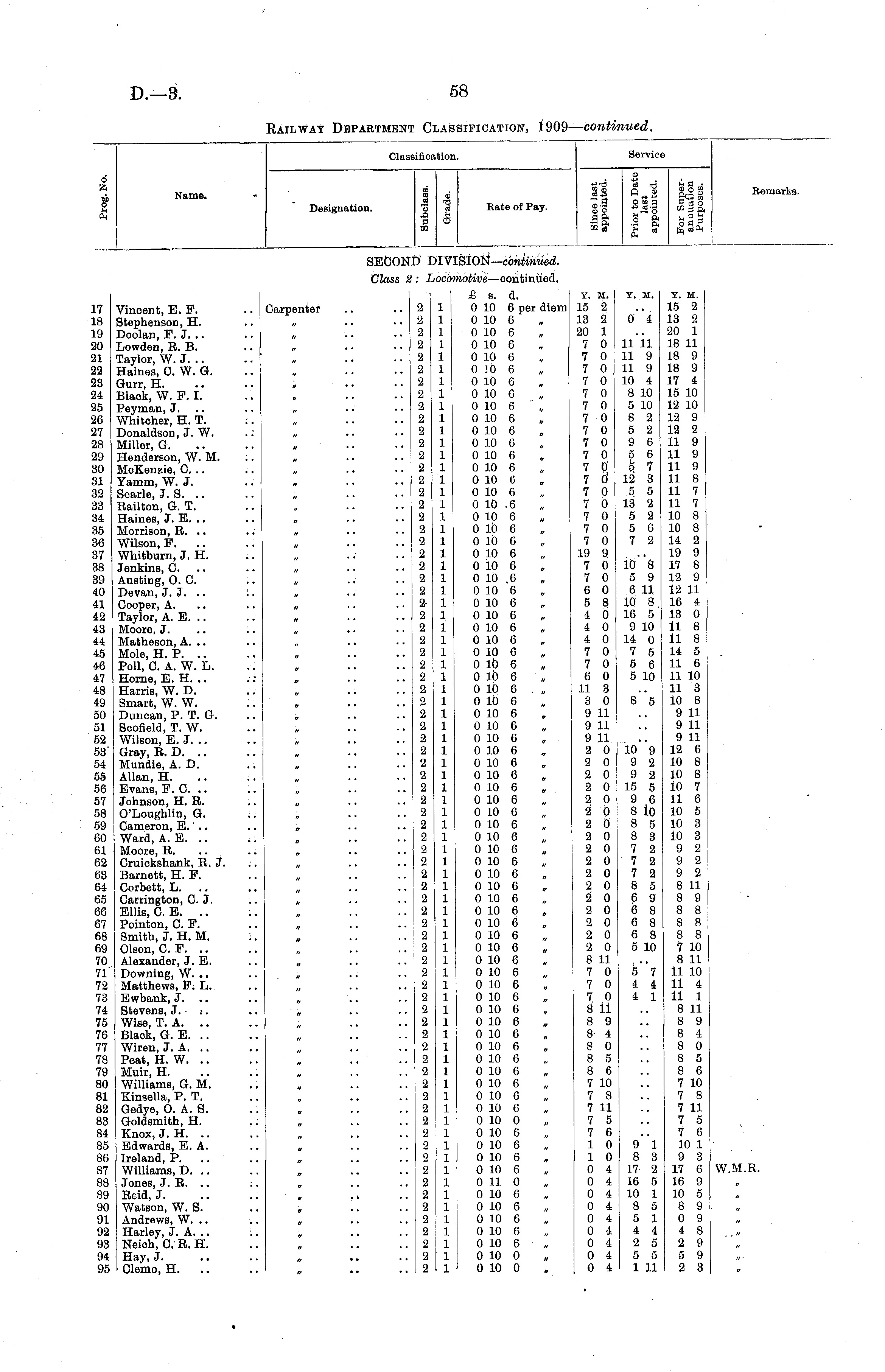 d S5 cf H ft Name. Designation. Classification. CO £ o a a oa CD ■5 ce £ Rate of Pay. 43C44 ©I © 2 a a » 9 Service © +3 ti n3 a^s 0x2 4. a . 3 g » 0.-4 © -4 43 CO a ca o 03 s n o a 3 Remarks. SECON D m r ISION— continued. Class '* i ; rOCI tmotive —oontinued. 21 ' 22 : 23 I 24 ' 25 : 26 ' 27 : 28 : 29 : 30 : 31 ■ 32 1 33 : 34 35 ; 36 37 38 , 39 40 41 42 43 44 45 46 47 48 49 50 51 52 53' 54 5S 56 57 58 59 60 61 62 63 64 65 66 67 68 69 70 71 72 73 74 75 76 77 78 79 80 81 82 83 84 85 86 87 88 89 90 91 92 93 94 95 .7 .8 .9 Vincent, E. P. Stephenson, H. Doolan, P. J. .. Lowden, R. B. Taylor, W. J. .. Haines, 0. W. G. Gurr, H. Black, W. P. I. Peyman, J. Whitoher, H. T. Donaiason, J. W. Miller, G. Henaerson, W. M. McKenzie, O. .. Yamm, W. J. Searle, J. S. Railton, G. T. Haines, J. E. .. Morrison, R. .. Wilson, F. Whitburn, J. H. Jenkins, 0. Austing, O. O. Devan, J. J. Cooper, A. Taylor, A. E. Moore, J. Matheson, A. .. Mole, H. P. Poll, 0. A. W. L. Home, E. H. .. Harris, W. D. Smart, W. W. Duncan, P. T. G. Scofield, T. W. Wilson, E. J. .. Gray, R. D. Mundie, A. D. Allan, H. Evans, P. O. Johnson, H. R. O'Loughlin, G. Cameron, E. .. Ward, A. E. .. Moore, R. Cruickshank, R. J. Barnett, H. F. Corbett, L. Carrington, 0. J. Ellis, CE. Pointon, 0. P. Smith, J. H. M. Olson, 0. P. .. Alexander, J. E. Downing, W. .. Matthews, P. L. Ewbank, J. .. Stevens, J. i! Wise, T. A. Black, G. E. Wiren, J. A. Peat, H. W. Muir, H, Williams, G. M. Kinsella, P. T. Gedye, O. A. S. Goldsmith, H. Knox, J. H. Edwards, E. A. Ireland, P. Williams, D. .. Jones, J. R. .. Reid, J. Watson, W. S. Anarews, W. .. Harley, J. A. .. Neioh, C R. H. Hay, J. Clemo, H. Carpenter 2 2 2 2 2 2 2 2 2 2 2 2 2 2 2 2 2 2 2 2 2 2 2 2 2 2 2 2 2 2 2 2 2 2 2 2 2 2 2 2 2 2 2 2 2 2 2 2 2 2 2 2 2 2 2 2 2 2 2 2 2 2 2 2 2 2 2 2 2 2 2 2 2 2 2 2 2 2 2 1 1 1 1 1 1 1 1 1 1 1 1 1 1 1 1 1 1 1 1 1 1 1 1 1 1 1 1 1 1 1 1 1 1 1 1 1 1 1 1 1 1 1 1 1 1 1 1 1 1 1 1 1 1 1 1 1 1 1 1 1 1 1 1 1 1 1 1 1 1 1 1 1 1 1 1 1 1 1 £ s. d. 0 10 6 per diem 0 10 6 0 10 6 0 10 6 0 10 6 0 10 6 0 10 6 0 10 6 0 10 6 0 10 6 0 10 6 0 10 6 0 10 6 0 10 6 0 10 6 0 10 6 0 10 .6 0 10 6 0 10 6 0 10 6 0 10 6 0 10 6 0 10 .0 0 10 6 0 10 6 0 10 6 0 10 6 0 10 6 0 10 6 0 10 6 0 10 6 0 10 6 0 10 6 0 10 6 0 10 6 0 10 6 0 10 6 0 10 6 0 10 6 0 10 6 0 10 6 0 10 6 0 10 6 0 10 6 0 10 6 0 10 6 0 10 6 0 10 6 0 10 6 0 10 6 0 10 6 0 10 6 0 10 6 0 10 6 0 10 6 0 10 6 0 10 6 0 10 6 0 10 6 0 10 6 0 10 6 0 10 6 0 10 6 0 10 6 0 10 6 0 10 6 0 10 0 0 10 6 0 10 6 0 10 6 0 10 6 0 11 0 0 10 6 0 10 6 0 10 6 0 10 6 0 10 6 0 10 0 0 10 0 y. m. 15 2 13 2 20 1 7 0 7 0 7 0 7 0 7 0 7 0 7 0 7 0 7 0 7 0 7 0 7 0 7 0 7 0 7 0 7 0 7 0 19 9 7 0 7 0 6 0 5 8 4 0 4 0 4 0 7 0 7 0 6 0 11 3 3 0 9 11 9 11 9 11 2 0 2 0 2 0 2 0 2 0 2 0 2 0 2 0 2 0 2 0 2 0 2 0 2 0 2 0 2 0 2 0 2 0 8 11 7 0 7 0 7 0 8 11 8 9 8 4 8 0 8 5 8 6 7 10 7 8 7 11 7 5 7 6 1 0 1 0 0 4 0 4 0 4 0 4 0 4 0 4 0 4 0 4 0 4 Y. M. 0*4 11 11 11 9 11 9 10 4 8 10 5 10 8 2 5 2 9 6 5 6 5 7 12 3 5 5 13 2 5 2 5 6 7 2 10 8 5 9 6 11 10 8 16 5 9 10 14 0 7 5 5 6 5 10 8**5 10 9 9 2 9 2 15 5 9 6 8 10 8 5 8 3 7 2 7 2 7 2 8 5 6 9 6 8 6 8 6 8 5 10 Y. M. 15 2 13 2 20 1 18 11 18 9 18 9 17 4 15 10 12 10 12 9 12 2 11 9 11 9 11 9 11 8 11 7 11 7 10 8 10 8 14 2 19 9 17 8 12 9 12 11 16 4 13 0 11 8 11 8 14 5 11 6 11 10 11 3 10 8 9 11 9 11 9 11 12 6 10 8 10 8 10 7 11 6 10 5 10 3 10 3 9 2 9 2 9 2 8 11 8 9 8 8 8 8 8 8 7 10 8 11 11 10 11 4 11 1 8 11 8 9 8 4 8 0 8 5 8 6 7 10 7 8 7 11 7 5 7 6 10 1 9 3 17 6 16 9 10 5 8 9 0 9 4 8 2 9 5 9 2 3 5 7 4 4 4 1 • i 9 1 8 3 17 2 16 5 10 1 8 5 5 1 4 4 2 5 5 5 1 11 W.M.R.