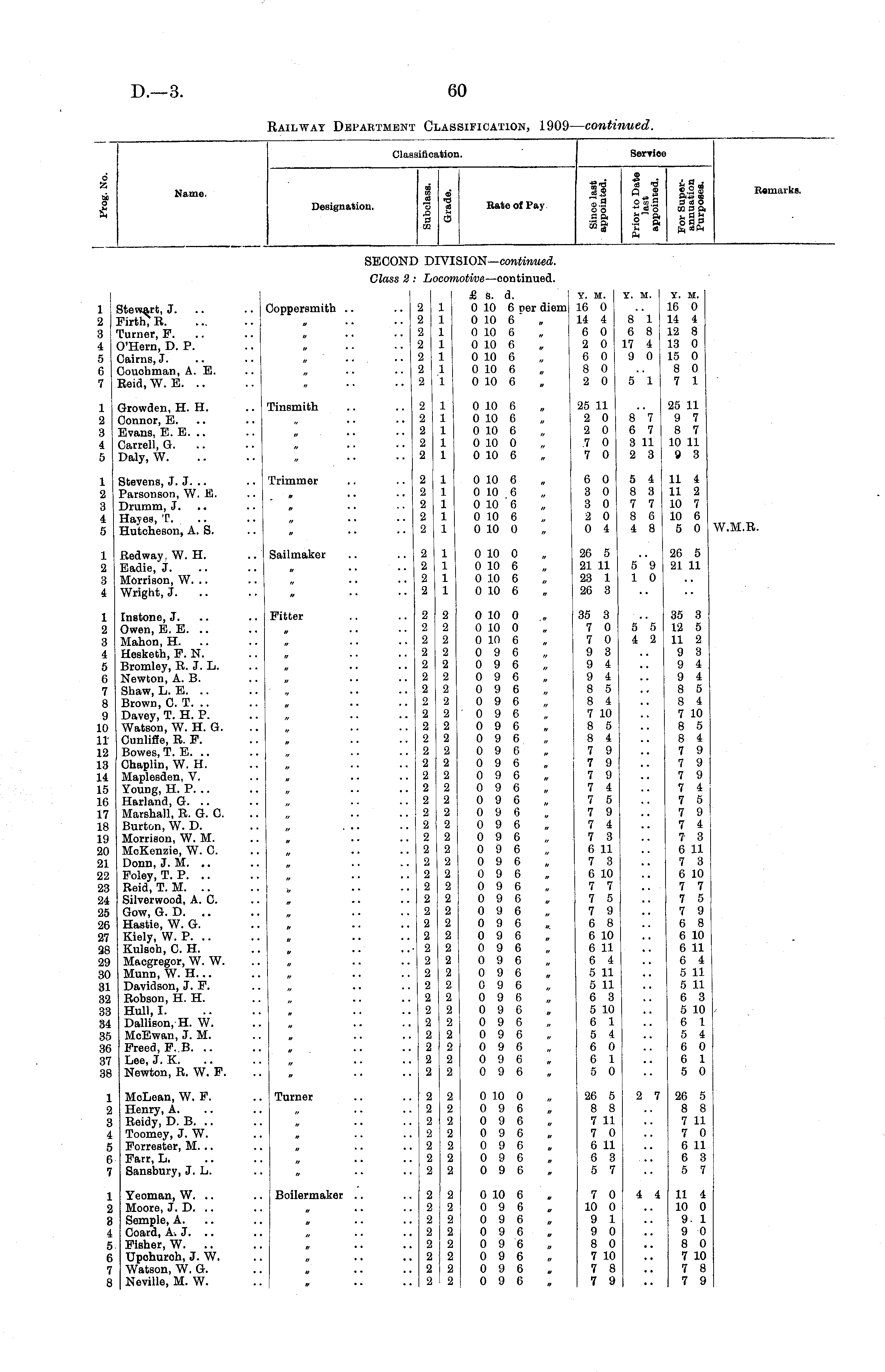 d Z oi) 3 a Name. Designation. Classificatii 00 DO £ 3 a a 03 in. 0 -S-d ti 'd & 9 _ a, a ° M 2 stio OO CO P ft ft Serviee Remarks. Rate of Pay SECONE )iv: iSION— continued. Glass 2: lOCOi totive —continued. 1 I 2 ] 3 ' 4 l 5 I 6 i 7 : Stewart, J. Firth, R. Turner, F. O'Hern, D. P. Cairns, J. Couchman, A. E. Reia, W. E. .. Coppersmith .. 2 2 2 2 2 2 2 1 1 1 1 1 1 1 £ s. d. 0 10 6 per diem 0 10 6 0 10 6 0 10 6 0 10 6 0 10 6 0 10 6 Y. M. 16 0 14 4 6 0 2 0 6 0 8 0 2 0 Y. M. 8 1 6 8 17 4 9 0 Y. M. 16 0 14 4 12 8 13 0 15 0 8 0 7 1 5**1 i 2 3 4 5 Growaen, H. H. Connor, E. Evans, E. E. Carrell, G. Daly, W. Tinsmith 2 2 2 2 2 1 1 1 1 1 0 10 6 0 10 6 0 10 6 0 10 0 0 10 6 25 11 2 0 2 0 7 0 7 0 8 7 6 7 3 11 2 3 25 11 9 7 8 7 10 11 9 3 1 2 3 4 5 Stevens, J. J. .. Parsonson, W. E. Drumm, J. Hayes, 'P. Hutcheson, A. S. Trimmer 2 2 2 2 2 1 1 1 1 1 0 10 6 0 10 6 0 10 6 0 10 6 0 10 0 6 0 3 0 3 0 2 0 0 4 5 4 8 3 7 7 8 6 4 8 11 4 11 2 10 7 10 6 5 0 W.M.R. 1 2 3 4 Reaway. W. H. Eadie, J. Morrison, W. .. Wright, J. .. Sailmaker 2 2 2 2 1 1 1 1 0 10 0 0 10 6 0 10 6 0 10 6 26 5 21 11 23 1 26 3 5**9 1 0 26 5 21 11 1 2 3 4 5 6 7 8 9 10 11 12 13 14 15 16 17 18 19 20 21 22 23 24 25 26 27 28 29 30 31 32 33 34 35 36 37 38 Instone, J. Owen, E. E. .. Mahon, H. Hesketh, P. N. Bromley, R. J. L. Newton, A. B. Shaw, L. E. Brown, C.T... Davey, T. H. P. Watson, W. H. G. Cunlifie, R. P. Bowes, T. E. .. Chaplin, W. H. Maplesden, V. Young, H. P. .. Harland, G. .. Marshall, R. G. O. Burton, W. D. Morrison, W. M. McKenzie, W. 0. Donn, J. M. Foley, T. P. Reid, T. M. Silverwood, A. O. Gow, G. D. Hastie, W. G. Kiely, W. P. Kulsoh, 0. H. Macgregor, W. W. Munn, W. H... Daviason, J. P. Robson, H. H. Hull, I. Dallison, H. W. McEwan, J. M. Freed, P. B. Lee, J. K. Newton, R. W. P. Fitter 2 2 2 2 2 2 2 2 2 2 2 2 2 2 2 2 2 2 2 2 2 2 2 2 2 2 2 2 2 2 2 2 2 2 2 2 2 2 2 2 2 2 2 2 2 2 2 2 2 2 2 2 2 2 2 2 2 2 2 2 2 2 2 2 2 2 2 2 2 2 2 2 2 2 2 2 0 10 0 0 10 0 0 10 6 0 9 6 0 9 6 0 9 6 0 9 6 0 9 6 0 9 6 0 9 6 0 9 6 0 9 6 0 9 6 0 9 6 0 9 6 0 9 6 0 9 6 0 9 6 0 9 6 0 9 6 0 9 6 0 9 6 0 9 6 0 9 6 0 9 6 0 9 6 0 9 6 0 9 6 0 9 6 0 9 6 0 9 6 0 9 6 0 9 6 0 9 6 0 9 6 0 9 6 0 9 6 0 9 6 35 3 7 0 7 0 9 3 9 4 9 4 8 5 8 4 7 10 8 5 8 4 7 9 7 9 7 9 7 4 7 5 7 9 7 4 7 3 6 11 7 3 6 10 7 7 7 5 7 9 6 8 6 10 6 11 6 4 5 11 5 11 6 3 5 10 6 1 5 4 6 0 6 1 5 0 5**5 4 2 35 3 12 5 11 2 9 3 9 4 9 4 8 5 8 4 7 10 8 5 8 4 7 9 7 9 7 9 7 4 7 5 7 9 7 4 7 3 6 11 7 3 6 10 7 7 7 5 7 9 6 8 6 10 6 11 6 4 5 11 5 11 6 3 5 10 6 1 5 4 6 0 6 1 5 0 1 2 3 4 5 6 7 MoLean, W. F. Henry, A. Reidy, D. B. Toomey, J. W. Forrester, M. .. Farr, L. Sansbury, J. L. Turner 2 2 2 2 2 2 2 2 2 2 2 2 2 2 0 10 0 0 9 6 0 9 6 0 9 6 0 9 6 0 9 6 0 9 6 26 5 8 8 7 11 7 0 6 11 6 3 5 7 2 7 26 5 8 8 7 11 7 0 6 11 6 3 5 7 1 2 8 4 5. 6 7 8 Yeoman, W. .. Moore, J. D. Semple, A. Coard, A. J. .. Fisher, W. Upohuroh, J. W. Watson, W. G. Neville, M. W. Boilermaker .. 2 2 2 2 2 2 2 2 2 2 2 2 2 2 2 2 0 10 6 0 9 6 0 9 6 0 9 6 0 9 6 0 9 6 0 9 6 0 9 6 7 0 10 0 9 1 9 0 8 0 7 10 7 8 7 9 4 4 11 4 10 0 9- 1 9 0 8 0 7 10 7 8 7 9