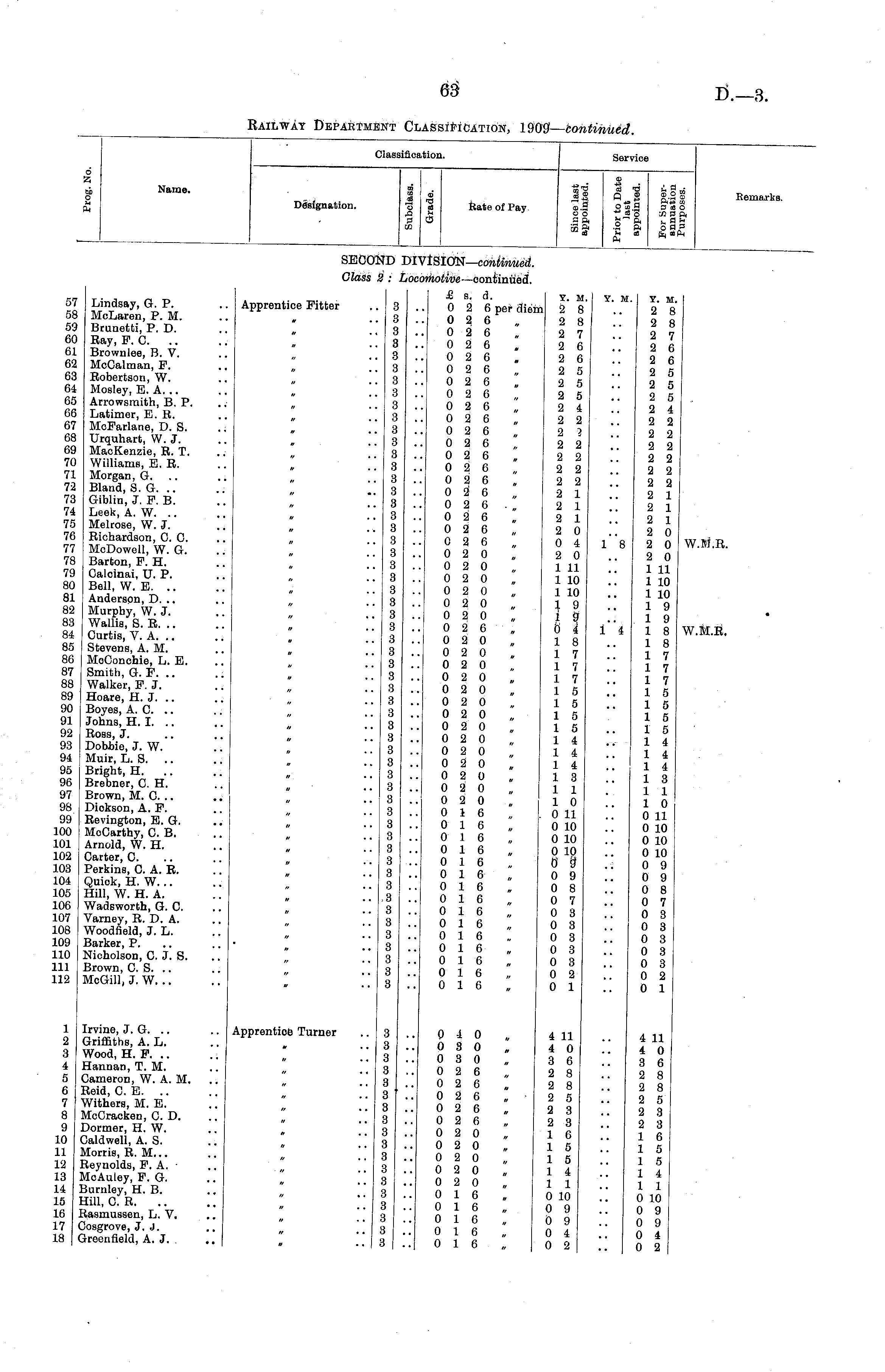 Classification. Service 6 A aj) o 4. ft Name. Designation. CO 2 © © ce a a O m Rate of Pay © ■% -b" la 03 i, a . £2 g.-2| cd .9 BcoB 3ceo ©o * J ceo o3aa a a £~ a cOj 55 a .2 a gaa ce 4h ca fa ceft ft " Remarks. SECON Class 2 )iv: rOCOf SION— continued, totive —continued. 57 58 59 60 61 62 63 64 65 66 67 68 69 70 71 72 73 74 75 76 77 78 79 80 81 82 83 84 85 86 87 88 89 90 91 92 93 94 95 96 97 98 99 100 101 102 103 104 105 106 107 108 109 110 111 112 ' Lindsay, G. P. ! McLaren, P. M. I Brunetti, P. D. 1 Ray, P. 0. Brownlee, B. V. ! McCalman, P. I Robertson, W. : Mosley, E. A. .. i Arrowsmith, B. P. i Latimer, E. R. McFarlane, D. S. TJrquhart, W. J. MacKenzie, R. T. Williams, E. R. Morgan, G. Bland, S. G. .. Giblin, J. P. B. Leek, A. W. Melrose, W. J. Richardson, 0. 0. McDowell, W. G. Barton, P. H. Oalcinai, U. P. Bell, W. E. .. Anderson, D. .. Murphy, W. J. Wallis, S. R. Curtis, V. A. Stevens, A. M. MoConchie, L. E. Smith, G. F. .. Walker, P. J. Hoare, H. J. Boyes, A. O. Johns, H. I. Ross, J. Dobbie, J. W. Muir, L. S. Bright, H. .. Brebner, 0. H. Brown, M. O. .. Dickson, A. F. Revington, E. G. McCarthy, O. B. Arnold, W. H. Carter, 0. Perkins, 0. A. R. Quiok, H. W. .. Hill, W. H. A. Wadsworth, G. 0. Varney, R. D. A. Woodfield, J. L. Barker, P. Nicholson, 0. J. S. Brown, 0. S. McGill, J. W. .. Apprentice Fitter a 3 3 3 3 3 3 3 3 3 3 3 3 3 3 3 3 3 3 3 3 3 3 3 3 3 3 3 3 3 3 3 3 3 3 3 3 3 3 3 3 3 3 3 3 3 3 3 3 ,3 3 3 3 3 3 3 3 £ a. d. 0 2 6 per diem 0 2 6 0 2 6 . 0 2 6 „ 0 2 6 0 2 6 0 2 6 . 0 2 6 0 2 6 0 2 6 0 2 6 0 2 6 0 2 6 . 0 2 6 0 2 6 „ 0 2 6 0 2 6 0 2 6 0 2 6 0 2 6 0 2 0 0 2 0 0 2 0 „ 0 2 0 0 2 0 „ 0 2 0 0 2 6 0 2 0 0 2 0 0 2 0 0 2 0 „ 0 2 0 0 2 0 0 2 0 0 2 0 0 2 0 0 2 0 0 2 0 0 2 0 0 2 0 0 2 0 0 16 0 16 0 16 0 16 0 16 0 16 0 16 0 16 0 16 0 16 0 16 0 16 0 16 . 0 16 0 16 „ Y. M. n 2 8 2 8 2 7 2 6 2 6 2 5 2 5 2 5 2 4 2 2 2 3 2 2 2 2 2 2 2 2 2 1 2 1 2 1 2 0 0 4 2 0 1 11 1 10 1 10 1 9 1 9 0 4 1 8 1 7 1 7 1 7 1 5 1 5 1 5 1 5 1 4 1 4 1 4 1 3 1 1 1 0 . 0 11 0 10 0 10 0 10 0 9 0 9 0 8 0 7 0 3 0 3 0 3 0 3 0 3 0 2 0 1 Y. M. 1*8 1*4 Y. M. 2 8 2 8 2 7 2 6 2 6 2 5 2 5 2 5 2 4 2 2 2 2 2 2 2 2 2 2 2 2 2 1 2 1 2 1 2 0 2 0 2 0 1 11 1 10 1 10 1 9 1 9 1 8 1 8 1 7 1 7 1 7 1 5 1 5 1 5 1 5 1 4 1 4 1 4 1 3 1 1 1 0 0 11 0 10 0 10 0 10 0 9 0 9 0 8 0 7 0 3 0 3 0 3 0 3 0 3 0 2 0 1 W.M.R. W.M.R. * " i 1 2 3 4 5 0 7 8 9 10 11 12 13 14 15 10 17 18 Irvine, J. G. Griffiths, A. L. Wood, H. P. Hannan, T. M. Cameron, W. A. M. Reid, 0. E. .. Withers, M. E. McCracken, C D. Dormer, H. W. Caldwell, A. S. Morris, R. M... Reynolds, P. A. McAuley, P. G. Burnley, H. B. Hill, 0. R. Rasmussen, L. V. Cosgrove, J. J. Greenfield, A. J. . Apprentice Turner € 3 3 3 3 3 3 3 3 3 3 3 3 3 3 3 3 3 3 0-10 0 3 0 „ 0 3 0 0 2 6 0 2 6 0 2 6 „ 0 2 6 „ 0 2 6 „ 0 2 0 0 2 0 0 2 0 0 2 0 0 2 0 0 16 „ 0 16 0 16 0 16 0 16 4 11 4 0 3 6 2 8 2 8 2 5 2 3 2 3 1 6 1 5 1 5 1 4 1 1 0 10 0 9 0 9 0 4 0 2 4 11 4 0 3 6 2 8 2 8 2 5 2 3 2 3 1 6 1 5 1 5 1 4 1 1 0 10 0 9 0 9 0 4 .. C .. a .. a .. a .. 3 .. 3 .. 3 .. 3 .. 3 .. 3