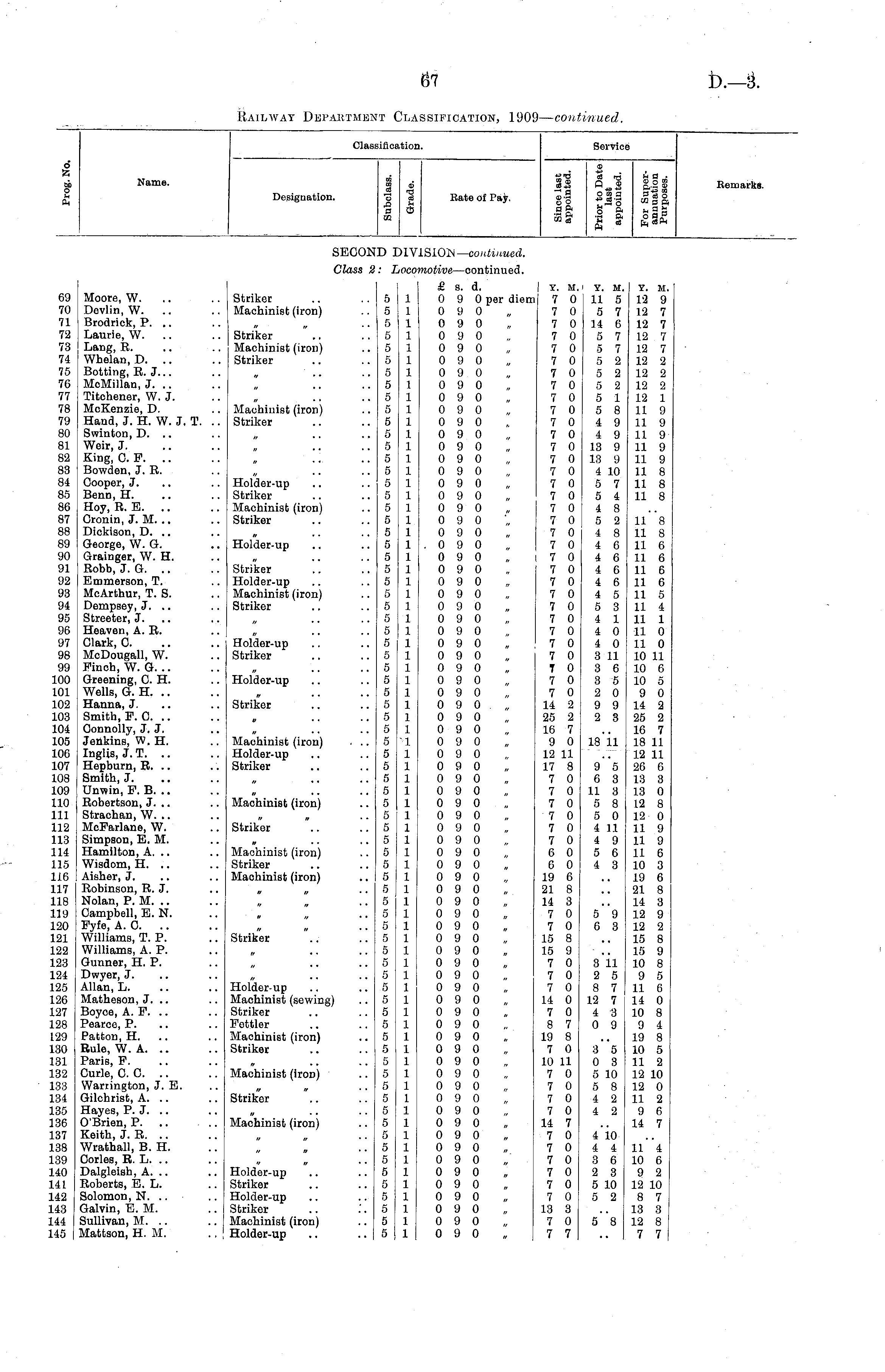 Classifici ition. Service d Z DD 3 4. ft Name, Designation. CO co a 3 a a 03 3 ce 44 Rate of Pay. © «0B te -rj it a . §3 a„© g,.2S ©.9 o|a fug II i"l "it Hem arks. SECON ;d )1V. .SIOjN — continued. Class 2 i * lOCO 1 ) notive —continued. 69 70 71 72 73 74 75 76 77 78 79 80 81 82 83 84 85 86 87 88 89 90 91 92 93 94 95 96 97 98 99 100 101 102 103 104 105 106 107 108 109 110 111 112 113 114 115 116 117 118 119 120 121 122 123 124 125 126 127 128 129 130 131 132 133 134 135 136 137 138 139 140 141 142 143 144 145 I Moore, W. ; Devlin, W. .. j Brodrick, P. .. Laurie, W. Lang, R. Whelan, D. .. Botting, R. J... McMillan, J. .. Titchener, W. J. McKenzie, D. Hand, J. H. W. J. T. .. Swinton, D. .. Weir, J. King, 0. P. .. Bowden, J. R. Cooper, J. Benn, H. Hoy, R. E. Cronin, J. M. .. Dickison, D. .. George, W. G. Grainger, W. H. Robb, J. G. .. Emmerson, T. McArthur, T. S. Dempsey, J. .. Streeter, J. Heaven, A. R. Clark, 0. McDougall, W. Finoh, W. G. .. Greening, 0. H. Wells, G. H. .. Hanna, J. Smith, P. C .. Connolly, J. J. Jenkins, W. H. Inglis, J. T. .. Hepburn, R. .. Smith, J. Unwin, P. B. .. Robertson, J. .. Strachan, W. .. McParlane, W. Simpson, E. M. Hamilton, A. .. Wisdom, H. .. Aisher, J. Robinson, R. J. Nolan, P. M. .. Campbell, E.N. Fyfe, A. 0. Williams, T. P. Williams, A. P. Gunner, H. P. Dwyer, J. Allan, L. Matheson, J. .. Boyce, A. P. .. Pearce, P. Patton, H. .. Rule, W. A. .. Paris, F. Curie, 0. 0. .. Warrington, J. E. Gilchrist, A. .. Hayes, P. J. .. O'Brien, P. Keith, J. R. .. Wrathall, B. H. Corles, R. L. .. Dalgleish, A. .. Roberts, E. L. Solomon, N. .. Galvin, E. M. Sullivan, M. .. Mattson, H. M. Striker Machinist (iron) Striker Machinist (iron) Striker Maohinist (iron) Striker Holder-up Striker Machinist (iron) Striker Holder-up Striker Holder-up Machinist (iron) Striker Holder-up Striker Holder-up Striker Machinist (iron) . .. Holder-up Striker 5 5 5 5 5 5 5 5 5 5 5 5 5 5 5 5 5 5 5 5 5 5 5 5 5 5 5 5 5 5 5 5 5 5 5 5 5 5 5 5 5 5 5 5 5 5 5 5 5 5 5 5 5 5 5 5 5 5 5 5 5 5 5 5 5 5 5 5 5 5 5 5 5 5 5 5 5 1 1 1 1 1 1 1 1 1 1 1 1 1 1 1 1 1 1 1 1 1 1 1 1 1 1 1 1 1 1 1 1 1 1 1 1 1 1 1 1 1 1 1 1 1 1 1 1 1 1 1 1 1 1 1 1 1 1 1 1 1 1 1 1 1 1 1 1 1 1 1 1 1 1 1 1 1 £ a. d. 0 9 0 per diem 0 9 0 0 9 0 0 9 0 0 9 0 0 9 0 0 9 0 0 9 0 0 9 0 0 9 0 0 9 0 0 9 0 0 9 0 0 9 0 0 9 0 0 9 0 0 9 0 0 9 0 0 9 0 0 9 0 .090 0 9 0 „ ( 0 9 0 0 9 0 0 9 0 0 9 0 0 9 0 0 9 0 0 9 0 0 9 0 0 9 0 0 9 0 0 9 0 0 9 0 0 9 0 0 9 0 0 9 0 0 9 0 0 9 0 0 9 0 0 9 0 0 9 0 0 9 0 0 9 0 0 9 0 0 9 0 0 9 0 0 9 0 0 9 0 0 9 0 0 9 0 0 9 0 0 9 0 0 9 0 0 9 0 0 9 0 0 9 0 0 9 0 0 9 0 0 9 0 0 9 0 0 9 0 0 9 0 0 9 0 0 9 0 0 9 0 0 9 0 0 9 0 0 9 0 0 9 0 0 9 0 0 9 0 0 9 0 0 9 0 0 9 0 0 9 0 0 9 0 y. m. 7 0 7 0 7 0 7 0 7 0 7 0 7 0 7 0 7 0 7 0 7 0 7 0 7 0 7 0 7 0 7 0 7 0 7 0 7 0 7 0 7 0 7 0 7 0 7 0 7 0 7 0 7 0 7 0 7 0 7 0 T 0 7 0 7 0 14 2 25 2 16 7 9 0 12 11 17 8 7 0 7 0 7 0 7 0 7 0 7 0 6 0 6 0 19 6 21 8 14 3 7 0 7 0 15 8 15 9 7 0 7 0 7 0 14 0 7 0 8 7 19 8 7 0 10 11 7 0 7 0 7 0 7 0 14 7 7 0 7 0 7 0 7 0 7 0 7 0 13 3 7 0 7 7 Y. M. 11 5 5 7 14 6 5 7 5 7 5 2 5 2 5 2 5 1 5 8 4 9 4 9 13 9 13 9 4 10 5 7 5 4 4 8 5 2 4 8 4 6 4 6 4 6 4 6 4 5 5 3 4 1 4 0 4 0 3 11 3 6 3 5 2 0 9 9 2 3 18*11 9**5 6 3 11 3 5 8 5 0 4 11 4 9 5 6 4 3 y. m. 12 9 12 7 12 7 12 7 12 7 12 2 12 2 12 2 12 1 11 9 11 9 11 9 11 9 11 9 11 8 11 8 11 8 11 8 11 8 11 6 11 6 11 6 11 6 11 5 11 4 11 1 11 0 11 0 10 11 10 6 10 5 9 0 14 2 25 2 16 7 18 11 12 11 26 6 13 3 13 0 12 8 12 0 11 9 11 9 11 6 10 3 19 6 21 8 14 3 12 9 12 2 15 8 15 9 10 8 9 5 11 6 14 0 10 8 9 4 19 8 10 5 11 2 12 10 12 0 11 2 9 6 14 7 Machinist (iron) Striker Machinist (iron) Striker Maohinist (iron) 5**9 6 3 Striker Holder-up Machinist (sewing) Striker Fettler Machinist (iron) Striker 3 11 2 5 8 7 12 7 4 3 0 9 Machinist (iron) 3 5 0 3 5 10 5 8 4 2 4 2 Striker Machinist (iron) 4 10 4 4 3 6 2 3 5 10 5 2 Holder-up Striker Holder-up Striker Machinist (iron) Holder-up 11 4 10 6 9 2 12 10 8 7 13 3 12 8 7 7 5**8
