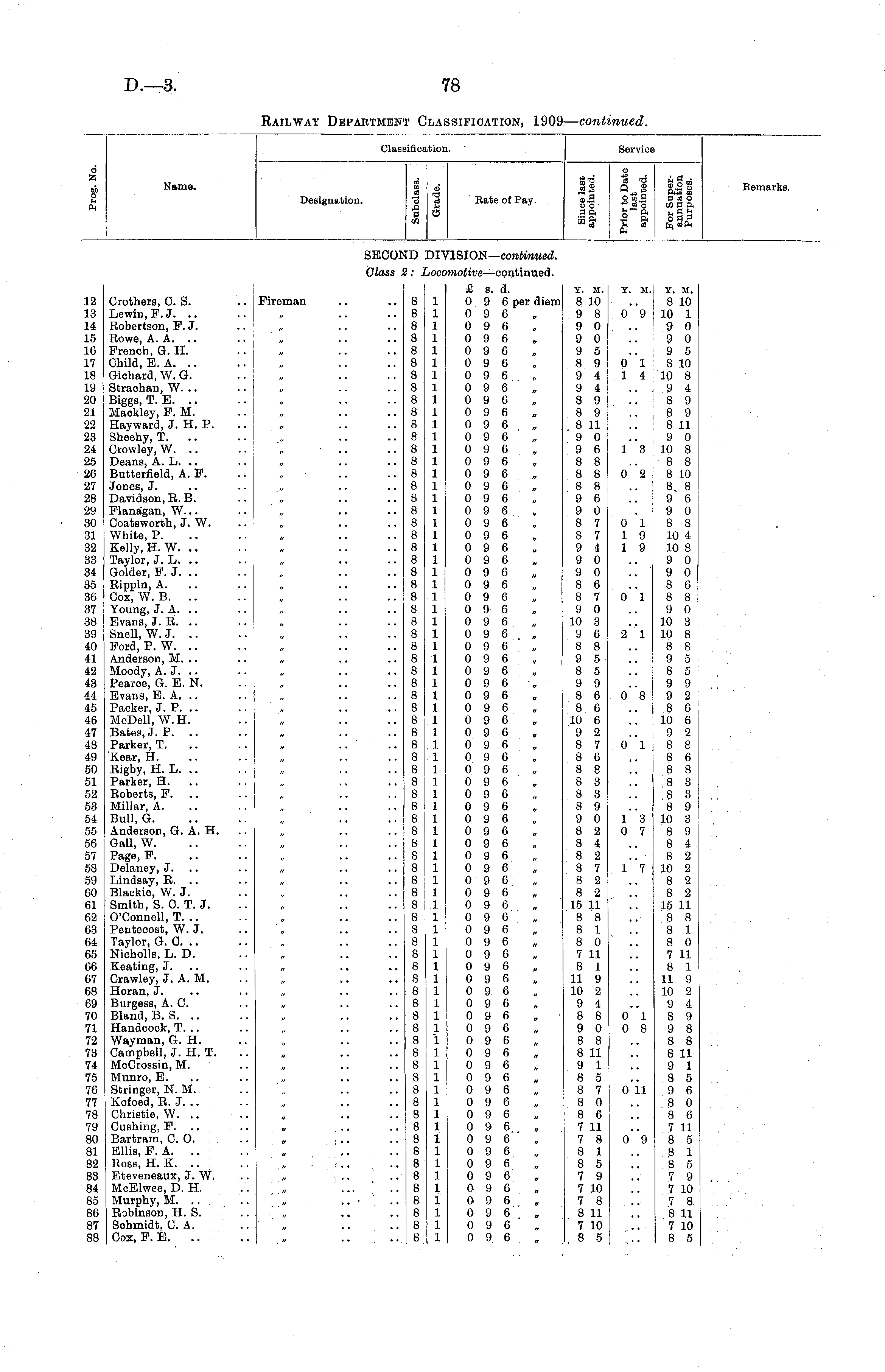 Clasi cificatioi L. Service 6 Z CO O ft Name. co CO cD £ •b © ca a 0 & 03 S -a "S tS i^ %S P £ 2-S S 41 43 43 3 a.43 CO ©.9 ° m 9 Bees ©3 0.3ft a a g~ a h 9 b a a .2 a 3 a s <" ce n ce fa caft ft " Remarks. Designation. Rate of Pay. SECO] D L>r VISION— continued. Glass lOCI 'motive —continued. 12 18 14 15 16 17 18 19 20 21 22 23 24 25 20 27 28 29 80 31 32 33 34 35 36 37 88 39 40 41 12 48 44 45 4(5 4.7 48 49 50 51 52 58 54 55 5(5 57 58 59 60 61 (52 63 64 65 66 67 68 69 70 71 72 73 74 75 76 77 78 79 80 81 82 83 84 85 86 87 88 Crothers, 0. S. Lewin, P. J. Robertson, F.J. Rowe, A. A. .. French, G. H. Child, E. A. Gichard, W. G. Strachan, W. .. Biggs, T. E. Mackley, P. M. Hayward, J. H. P. Sheehy, T. Crowley, W. .. Deans, A. L. Butterfield, A. F. Jones, J. Davidson, R. B. Flanagan, W... Coatsworth, J. W. White, P. Kelly, H. W. .. Taylor, J. L. Golder, F. J. Rippin, A. Cox, W. B. Young, J. A. .. Evans, J. R. Snell, W. J. Ford, P. W. Anderson, M. .. Moody, A. J. Pearce, G. E. N. Evans, E. A. .. Packer, J. P. McDell, W.H. Bates, J. P. .. Parker, T. Kear, H. Rigby, H. L. Parker, H. Roberts, F. Millar, A. Bull, G. Anderson, G. A. H. Gall, W. Page, P. Delaney, J. Lindsay,R. .. Blackie, W. J. Smith, S. 0. T. J. O'Connell, T. .. Penteoost, W. J. Taylor, G. C .. Nicholls, L. D. Keating, J. Crawley, J. A. M. Horan, J. Burgess, A. 0. Bland, B. S. Handcock, T. .. Wayman, G. H. Campbell, J. H. T. McCrossin, M. Munro, E. Stringer, N. M. Kofoed, R. J. .. Christie, W. .. Cushing, P. Bartram, 0. O. Ellis, P. A. .. Ross, H. K. .. Eteveneaux, J. W. McElwee, D. H. Murphy, M. .. Robinson, H. S. Sohmidt, C. A. Cox, P. E. .. Fireman 8 8 8 8 8 8 8 8 8 8 8 8 8 8 8 8 8 8 8 8 8 8 8 8 8 8 8 8 8 8 8 8 8 8 8 8 8 8 S 8 8 8 8 8 8 8 8 8 8 8 8 8 8 8 8 8 8 8 8 8 8 8 8 8 8 8 8 8 8 8 8 8 8 8 8 8 8 1 1 1 1 1 1 1 1 1 1 1 1 1 1 1 1 1 1 1 1 1 1 1 1 1 1 1 1 1 1 1 1 1 1 1 1 1 1 1 1 1 1 1 1 1 1 1 1 1 1 1 1 1 1 1 1 1 1 1 1 1 1 1 1 1 1 1 1 1 1 1 1 1 1 1 1 1 £ a. d. 0 9 6 per diem 0 9 6 0 9 6 0 9 6 0 9 6 0 9 6 0 9 6 0 9 6 0 9 6 0 9 6 0 9 6 0 9 6 0 9 6 0 9 6 0 9 6 0 9 6 0 9 6 0 9 6 0 9 6 0 9 6 0 9 6 0 9 6 0 9 6 0 9 6 0 9 6 0 9 6 0 9 6 0 9 6 0 9 6 0 9 6 0 9 6 0 9 6 „ 0 9 6 0 9 6 0 9 6 0 9 6 0 9 6 0 9 6 0 9 6 0 9 6 0 9 6 0 9 6 0 9 6 0 9 6 0 9 6 0 9 6 0 9 6 0 9 6 0 9 6 0 9 6 0 9 6 0 9 6 0 9 6 0 9 6 0 9 6 0 9 6 0 9 6 0 9 6 0 9 6 „ 0 9 6 0 9 6 0 9 6 0 9 6 0 9 6 0 9 6 0 9 6 0 9 6 0 9 6 0 9 6 0 9 6 0 9 6 0 9 6 0 9 6 0 9 6 0 9 6 0 9 6 0 9 6 Y. M. 8 10 9 8 9 0 9 0 9 5 8 9 9 4 9 4 8 9 8 9 8 11 9 0 9 6 8 8 8 8 8 8 9 6 9 0 8 7 8 7 9 4 9 0 9 0 8 6 8 7 9 0 10 3 9 6 8 8 9 5 8 5 9 9 8 6 8 6 10 6 9 2 8 7 8 6 8 8 8 3 8 3 8 9 9 0 8 2 8 4 8 2 8 7 8 2 8 2 15 11 8 8 8 1 8 0 7 11 8 1 11 9 10 2 9 4 8 8 9 0 8 8 8 11 9 1 8 5 8 7 8 0 8 6 7 11 7 8 8 1 8 5 7 9 7 10 7 8 8 11 7 10 8 5 Y. M. 0*9 0*1 1 4 1*3 0 2 0 1 1 9 1 9 0 "l 2 1 0*8 0 "l Y. M. 8 10 10 1 9 0 9 0 9 5 8 10 10 8 9 4 8 9 8 9 8 11 9 0 10 8 8 8 8 10 8 8 9 6 9 0 8 8 10 4 10 8 9 0 9 0 8 6 8 8 9 0 10 3 10 8 8 8 9 5 8 5 9 9 9 2 8 6 10 6 9 2 8 8 8 6 8 8 8 3 8 3 8 9 10 3 8 9 8 4 8 2 10 2 8 2 8 2 15 11 8 8 8 1 8 0 7 11 8 1 11 9 10 2 9 4 8 9 9 8 8 8 8 11 9 1 8 5 9 6 8 0 8 6 7 11 8 5 8 1 8 5 7 9 7 10 7 8 8 11 7 10 8 5 1*8 0 7 1*7 0 1 0 8 oil u 0*9