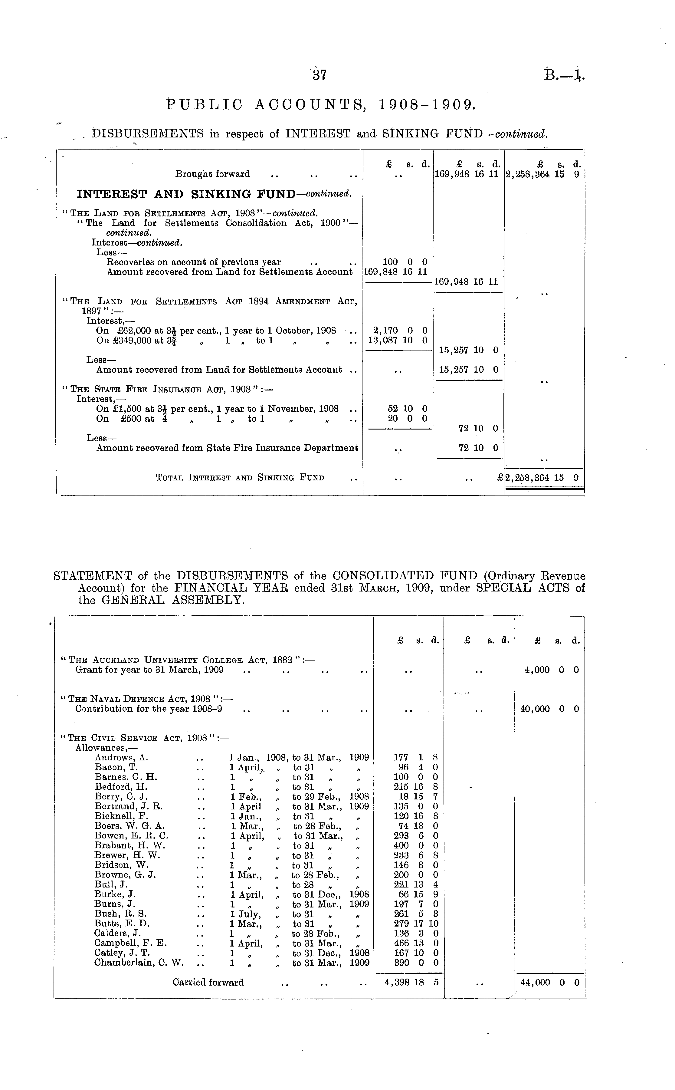 " The Auckland Univeesity College Act, 1882 " :— Grant for year to 31 March, 1909 £ s. d. £ s. d. £ s. d. 4,000 0 0 " The Naval Defence Act, 1908 ": — Contribution for the year 1908-9 40,000 0 0 "The Civil Sebvice Act, 1908": — Allowances, — Andrews, A. .. 1 Jan., 1908, to 31 Mar., 1909 Baoon, T. 1 April, „ to 31 „ Barnes, G. H. .. 1 „ ' „ to 31 „ Bedford, H. .. 1 „ „ to 31 , Berry, C. J. .. IFeb., „ to 29 Feb., 1908 Bertrand, J. R. .. 1 April „ to 31 Mar., 1909 Bicknell, F. .. Uan., „ to 31 „ Boers, W. G. A. .. 1 Mar., „ to 28 Feb., „ Bowen, E. R. C. .. 1 April, „ to 31 Mar., „ Brabant, H. W. .. 1 „ „ to 31 „ Brewer, H. W. .. 1 „ „ to 31 „ Bridson, W. .. 1 „ „ to 31 „ Browne, G. J. .. 1 Mar., „ to 28 Feb., Bull, J. .. 1 „ „ to 28 „ Burke, J. .. 1 April, „ to 31 Deo,, 1908 Burns, J. .. 1 „ „ to 31 Mar., 1909 Bush, R. S. .. 1 July, „ to 31 „ Butts, E. D. .. 1 Mar., „ to 31 „ Calders, J. .. 1 „ „ to 28 Feb., Campbell, F. E. .. 1 April, „ to 31 Mar., „ Catley, J. T. .. 1 „ „ to 31 Dec, 1908 Chamberlain, C. W. .. 1 „ „ to 31 Mar., 1909 177 1 8 96 4 0 100 0 0 215 16 8 18 15 7 135 0 0 120 16 8 74 18 0 293 6 0 400 0 0 233 6 8 146 8 0 200 0 0 221 13 4 66 15 9 197 7 0 261 5 3 279 17 10 136 3 0 466 13 0 167 10 0 390 0 0 Carried forward 4,398 18 5 44,000 0 0