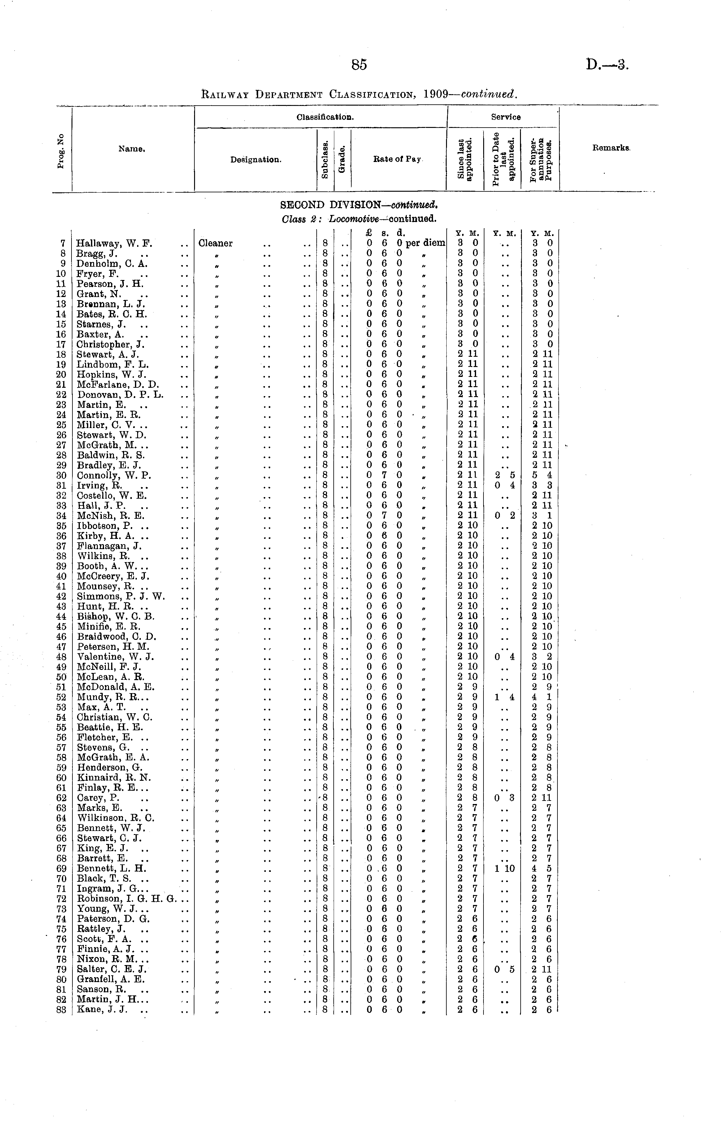 .| Classificatioi Service 3 Z ti 3 ft Name. Designation. CO TO q JO ffj o ca a i- 1 o O QQ Rate of Fay © S b a 03' it g i2 as g,|l ©9 Bco.9 BeeO 53 -» ca 3 033ft a a g~ a h au B a .2 a o a a m * * ca ft "ft ft Remarks. SECON )1V ISION— continued. Class 2 COCO! •notive—continued. 7 8 9 10 11 12 13 14 15 16 17 18 19 20 21 22 23 24. 25 2(5 27 28 29 30 81 32 33 34 35 30 37 38 39 40 41 42 43 44 45 46 47 18 49 50 51 52 58 54 55 56 57 58 59 60 61 62 03 64 65 66 67 68 69 70 71 72 73 74 75 7(5 77 78 79 80 81 82 83 Hallaway, W. P. Bragg, J. Denholm, 0. A. Fryer, F. Pearson, J. H. Grant, N. Bronnan, L. J. Bates, R. 0. H. Starnes, J. Baxter, A. Christopher, J. Stewart, A. J. Lindbom, P. L. Hopkins, W.J. McFarlane, D. D. Donovan, D. P. L. Martin, E. .. Martin, E. R. Miller, 0. V. .. Stewart, W. D. McGrath, M. .. Baldwin, R. S. Bradley, E. J. Connolly, W. P. Irving, R. Costello, W. E. Hall, J. P. McNish, R. E. Ibbotson, P. .. Kirby, H. A. .. Plannagan, J. Wilkins, R. .. Booth, A. W. .. McCreery, E. J. Mounsey, R. .. Simmons, P. J. W. Hunt, H. R. .. Bishop, W. 0. B. Minifie, E. R. Braidwood, 0. D. Petersen, H. M. Valentine, W. J. McNeill, P. J. McLean, A. R. McDonald, A. E. Mundy, R. R... Max, A. T. .. Christian, W. 0. Beattie, H. E. Fletcher, E. .. Stevens, G. .. MoGrath, E. A. Henaerson, G. Kinnaird, R. N. Finlay, R. E... Carey, P. Marks, E. Wilkinson, R. C Bennett, W. J. Stewart, C.J. King, E.J... Barrett, E. .. Bennett, L. H. Black, T. S. .. Ingram, J. G... Robinson, I. G. H. G. .. Young, W. J. .. Paterson, D. G. Rattley, J. Scotl, P. A. .. Pinnie, A. J. .. Nixon, R. M. .. Salter, 0. E. J. Graniell, A. E. Sanson,R. Martin, J. H... Kane, J.J. Cleaner a 8 8 8 8 8 8 8 8 8 8 8 8 8 8 8 8 8 8 8 8 8 8 8 8 8 8 8 8 8 8 8 8 8 8 8 8 8 8 8 8 8 8 8 8 8 8 8 8 8 8 8 8 8 8 8 8 8 8 8 8 8 8 8 8 8 8 8 8 8 8 8 8 8 8 8 8 8 £ a. a. 0 6 0 per aiem 0 6 0 0 6 0 0 6 0 0 6 0 0 6 0 0 6 0 0 6 0 0 6 0 0 6 0 0 6 0 0 6 0 0 6 0 0 6 0 0 6 0 0 6 0 0 6 0 0 6 0 ■ „ 0 6 0 0 6 0 0 6 0 0 6 0 0 6 0 0 7 0 0 6 0 0 6 0 0 6 0 0 7 0 0 6 0 0 6 0 0 6 0 0 6 0 0 6 0 0 6 0 0 6 0 0 6 0 0 6 0 0 6 0 0 6 0 0 6 0 0 6 0 0 6 0 0 6 0 0 6 0 0 6 0 0 6 0 0 6 0 0 6 0 0 6 0 0 6 0 0 6 0 0 6 0 0 6 0 0 6 0 0 6 0 0 6 0 0 6 0 0 6 0 0 6 0 0 6 0 0 6 0 0 6 0 0 6 0 0 6 0 0 6 0 0 6 0 0 6 0 0 6 0 0 6 0 0 6 0 0 6 0 0 6 0 0 6 0 0 6 0 0 6 0 0 6 0 „ 0 6 0 Y. M. 3 0 3 0 3 0 3 0 3 0 3 0 3 0 3 0 3 0 3 0 3 0 2 11 2 11 2 11 2 11 2 11 2 11 2 11 2 11 2 11 2 11 2 11 2 11 2 11 2 11 2 11 2 11 2 11 2 10 2 10 2 10 2 10 2 10 2 10 2 10 2 10 2 10 2 10 2 10 2 10 2 10 2 10 2 10 2 10 2 9 2 9 2 9 2 9 2 9 2 9 2 8 2 8 2 8 2 8 2 8 2 8 2 7 2 7 2 7 2 7 2 7 2 7 2 7 2 7 2 7 2 7 2 7 2 6 2 6 2 6 2 6 2 6 2 6 2 6 2 6 2 6 2 6 y. m. 2 *5 0 4 0**2 Y. M. 3 0 3 0 3 0 3 0 3 0 3 0 3 0 3 0 3 0 3 0 3 0 2 11 2 11 2 11 2 11 2 11 2 11 2 11 2 11 2 11 2 11 2 11 2 11 5 4 3 3 2 11 2 11 3 1 2 10 2 10 2 10 2 10 2 10 2 10 2 10 2 10 2 10 2 10 2 10 2 10 2 10 3 2 2 10 2 10 2 9 4 1 2 9 2 9 2 9 2 9 2 8 2 8 2 8 2 8 2 8 2 11 2 7 2 7 2 7 2 7 2 7 2 7 4 5 2 7 2 7 2 7 2 7 2 6 2 6 2 6 2 6 2 6 2 11 2 6 2 6 2 6 2 6 0 "4 1**4 0**3 l'io 0**5