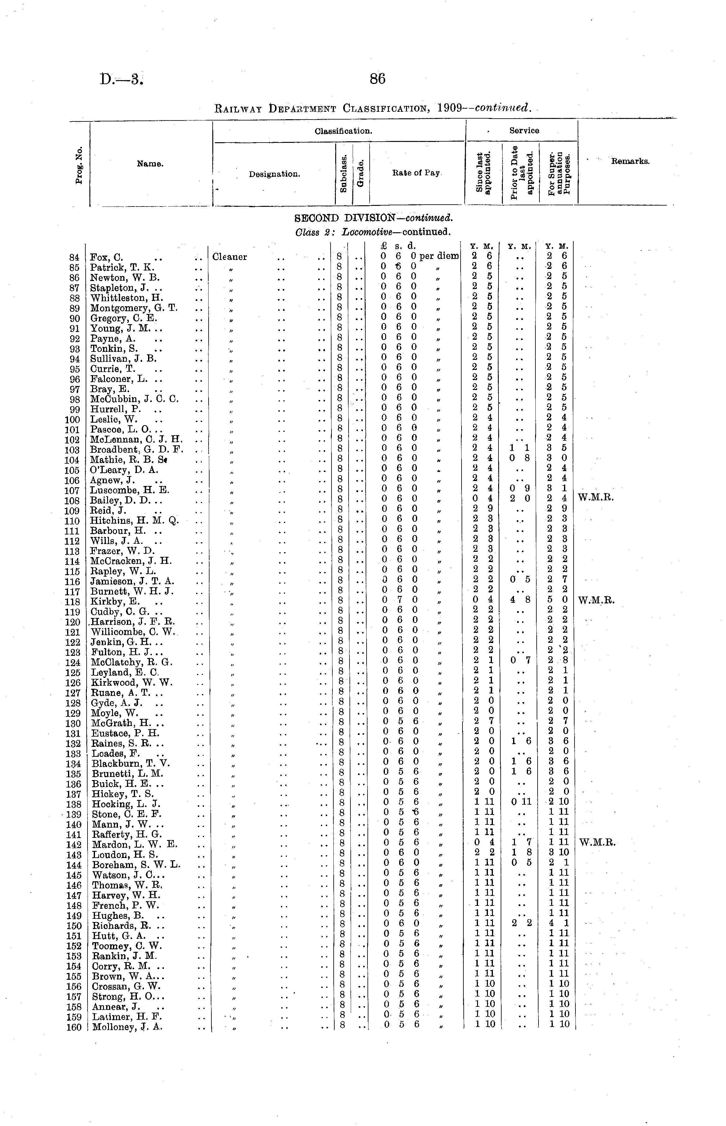 Classification. Service 3 z 3 44 ft Name. Designation. TO TO © £ "3 © ca B O OQ Rate of Pay © Sti « cb u a .sf as £.2© © .9 B to a 3 ca B OO *o 023a a a g- a >. 9 S sa .2 a b a a "a 4. ca ftceft ft Remarks. SECON m nv: [SION — continued. Glass 2 ,. DCOt notive —continued. 84 85 86 87 88 89 90 91 92 93 94 95 96 97 98 99 100 101 102 103 104 105 106 107 108 109 110 111 112 113 114 115 116 117 118 119 120 121 122 123 124 125 126 127 128 129 130 131 132 133 134 135 136 137 138 139 140 141 142 143 144 145 146 147 148 149 150 151 152 153 154 155 156 157 158 159 160 Pox, 0. Patrick, T. K. Newton, W. B. Stapleton, J. .. Whittleston, H. Montgomery, G. T. Gregory, CE. Young, J. M. .. Payne, A. Tonkin, S. Sullivan, J. B. Currie, T. Falconer, L. .. Bray, E. McCubbin, J. 0. C. Hurrell, P. .. Leslie, W. Pascoe, L. 0. .. McLennan, 0. J. H. Broadbent, G. D. P. Mathie, R. B. S« O'Leary, D. A. Agnew, J. Luscombe, H. E. Bailey, D. D. .. Reid, J. Hitchins, H. M. Q. Barbour, H. .. Wills, J. A. Prazer, W. D. McCraoken, J. H. Rapley, W. L. Jamieson, J. T. A. Burnett, W. H. J. Kirkby, E. .. Cudby, CG. .Harrison, J. F. R. Willicombe, 0. W. Jenkin, G. H. .. Fulton, H. J. .. McClatchy, R. G. Leyland, E. C. Kirkwood, W. W. Ruane, A. T. Gyde, A. J. Moyle, W. McGrath, H. .. Eustace, P. H. Raines, S. R. Loades, F. Blackburn, T. V. Brunetti, L. M. Buick, H. E. Hickey, T. S. Hooking, L. J. Stone, 0. E. F. Mann, J. W. Rafferty, H. G. Mardon, L. W. E. Loudon, H. S. Boreham, S. W. L. Watson, J. C... Thomas, W. R, Harvey, W. H. French, P. W. Hughes, B. Riohards, R. .. Hutt, G. A. Toomey, C W. Rankin, J. M. Corry, R. M. Brown, W. A... Crossan, G. W. Strong, H. 0... Annear, J. Latimer, H. F. Molloney, J. A. Cleaner 8 8 8 8 8 8 8 8 8 8 8 8 8 8 8 8 8 8 8 8 8 8 8 8 8 8 8 8 8 8 8 8 8 8 8 8 8 8 8 8 8 8 8 8 8 8 8 8 8 8 8 8 8 8 8 8 8 8 8 8 8 8 8 8 8 8 8 8 8 8 8 8 8 8 8 8 8 £ a. d. 0 6 0 per diem 0 6 0 0 6 0 0 6 0 0 6 0 0 6 0 0 6 0 0 6 0 0 6 0 0 6 0 0 6 0 0 6 0 0 6 0 0 6 0 0 6 0 0 6 0 0 6 0 0 6 0 0 6 0 0 6 0 0 6 0 0 6 0 0 6 0 0 6 0 0 6 0 0 6 0 0 6 0 0 6 0 0 6 0 0 6 0 0 6 0 0 6 0 0 6 0 0 6 0 0 7 0 0 6 0 0 6 0 0 6 0 0 6 0 0 6 0 0 6 0 0 6 0 0 6 0 0 6 0 0 6 0 0 6 0 0 5 6 0 6 0 0 6 0 0 6 0 0 6 0 0 5 6 0 5 6 0 5 6 0 5 6 0 5-6 0 5 6 0 5 6 0 5 6 0 6 0 0 6 0 0 5 6 0 5 6 0 5 6 0 5 6 0 5 6 0 6 0 0 5 6 0 5 6 0 5 6 0 5 6 0 5 6 0 5 6 0 5 6 0 5 6 0 5 6 0 5 6 Y. M. 2 6 2 6 2 5 2 5 2 5 2 5 2 5 2 5 2 5 2 5 2 5 2 5 2 5 2 5 2 5 2 5 2 4 2 4 2 4 2 4 2 4 2 4 2 4 2 4 0 4 2 9 2 3 2 3 2 3 2 3 2 2 2 2 2 2 2 2 0 4 2 2 2 2 2 2 2 2 2 2 2 1 2 1 2 1 2 1 2 0 2 0 2 7 2 0 2 0 2 0 2 0 2 0 2 0 2 0 1 11 1 11 1 11 1 11 0 4 2 2 1 11 1 11 1 11 1 11 1 11 1 11 1 11 1 11 1 11 1 11 1 11 1 11 1 10 1 10 1 10 1 10 1 10 Y. M. l"l 0 8 0**9 2 0 0**5 4**8 Y. M. 2 6 2 6 2 5 2 5 2 5 2 5 2 5 2 5 2 5 2 5 2 5 2 5 2 5 2 5 2 5 2 5 2 4 2 4 2 4 3 5 3 0 2 4 2 4 3 1 2 4 2 9 2 3 2 3 2 3 2 3 2 2 2 2 2 7 2 2 5 0 2 2 2 2 2 2 2 2 2 "2 2 8 2 1 2 1 2 1 2 0 2 0 2 7 2 0 3 6 2 0 3 6 3 6 2 0 2 0 2 10 1 11 1 11 1 11 1 11 3 10 2 1 1 11 1 11 1 11 1 11 1 11 4 1 1 11 1 11 1 11 1 11 1 11 1 10 1 10 1 10 1 10 1 10 W.M.R. W.M.R. 0**7 1*6 1*6 1 6 oil 1 7 1 8 0 5 W.M.R. 2**2