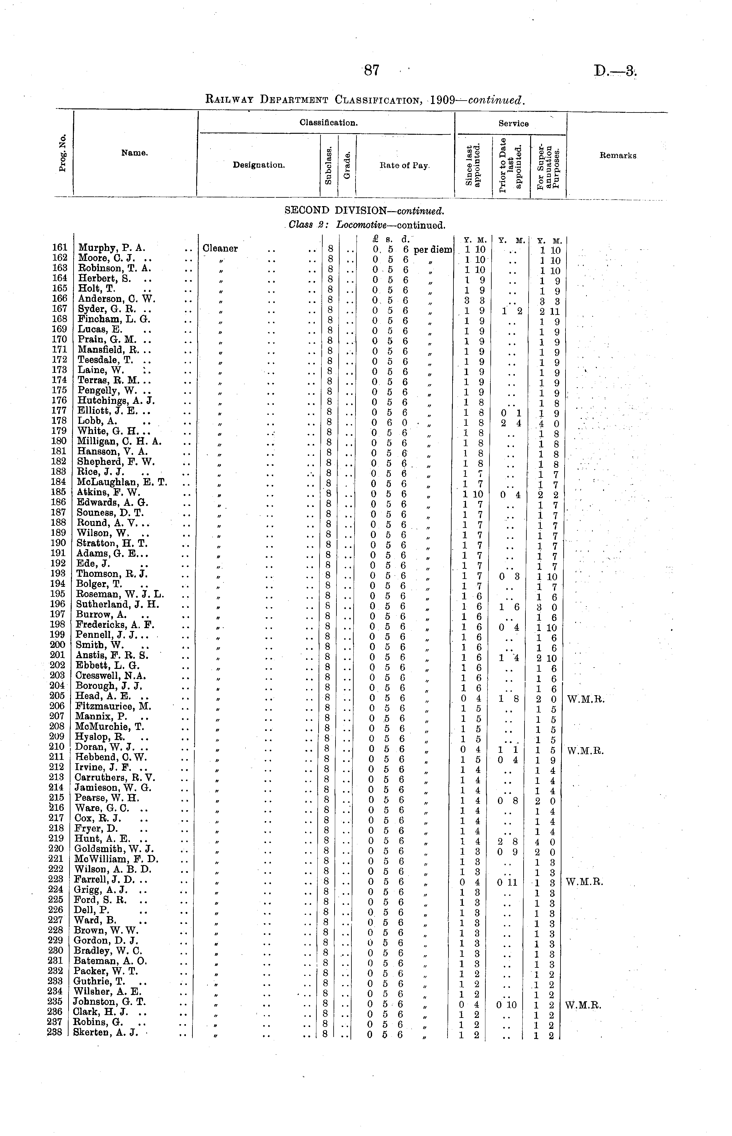 Clasi lifi cation. Service d A ci 0 44 ft Name. CO 2 3 © ce •§ s Rate of Pay. 3 Sin £ "° ceS a © ©■9 .2 3 3 si I a i 0 - <u o M n 3 a 4. a 4. oas fa csft Remarks Designation. SECOl D iiv: [SION— continued. Class 2: ,OC0 motive —continued. 161 162 163 164 165 166 167 168 169 170 171 172 173 174 175 176 177 178 179 180 181 182 183 184 185 186 187 188 189 190 191 192 193 194 195 196 197 198 199 200 201 202 203 204 205 206 207 208 209 210 211 212 213 214 215 216 217 218 219 220 221 222 223 224 225 226 227 228 229 230 231 232 233 234 235 236 237 238 Murphy, P. A. Moore, 0. J. Robinson, T. A. Herbert, S. Holt, T. Anderson, 0. W. Syder, G. R. Fincham, L. G. Lucas, E. Prain, G. M. Mansfield, R. .. Teesdale, T. .. Laine, W. Terras, R. M. .. Pengelly, W. .. Hutchings, A. J. Elliott, J. E. .. Lobb, A. White, G. H. .. Milligan, 0. H. A. Hansson, V. A. Shepherd, F. W. Rice, J. J. McLaughlan, E. T. Atkins, P. W. Edwards, A. G. Souness, D. T. Round, A. V. .. Wilson, W. .. Stratton, H. T. Adams, G. E... Ede, J. Thomson, R. J. Bolger, T. Roseman, W. J. L. Sutherland, J. H. Burrow, A. Fredericks, A. F. Pennell, J.J... Smith, W. Anstis, P. R. S. Ebbett, L. G. Cresswell, N.A. Borough, J. J. Head, A. E. .. Fitzmaurice, M. Mannix, P. McMurchie, T. Hyslop, R. Doran, W. J. Hebbend, CW. Irvine, J. F. .. Carruthers, R. V. Jamieson, W. G. Pearse, W. H. Ware, G. 0. Cox, R. J. Fryer, D. Hunt, A. E. .. Goldsmith, W.J. MoWilliam, P. D. Wilson, A. B. D. Farrell, J. D. Grigg, A. J. Ford, S. R. Dell, P. Ward, B. Brown, W.W. Gordon, D. J. Bradley, W. 0. Bateman, A. O. Packer, W. T. Guthrie, T. .. Wilsher, A. E. Johnston, G. T. Clark, H. J. Robins, G. Skerten, A. J. Cleaner 8 8 8 8 8 8 8 8 8 8 8 8 g 8 8 8 8 8 8 8 8 8 8 8 '8 8 8 8 8 8 8 8 8 8 8 8 8 8 8 8 8 8 8 8 8 8 8 8 8 8 8 8 8 8 8 8 8 8 8 8 8 8 8 8 8 8 8 8 8 8 8 8 8 .8 8 8 8 8 £ a. d. 0 5 6 per diem 0 5 6 0 5 6 0 5 6 0 5 6 0 5 6 0 5 6 0 5 6 0 5 6 0 5 6 0 5 6 0 5 6 0 5 6 0 5 6 0 5 6 0 5 6 0 5 6 0 6 0 - „ 0 5 6 0 5 6 0 5 6 0 5 6 0 5 6 0 5 6 0 5 6 0 5 6 0 5 6 0 5 6 0 5 6 0 5 6 0 5 6 0 5 6 0 5 6 0 5 6 0 5 6 0 5 6 0 5 6 0 5 6 0 5 6 0 5 6 0 5 6 0 5 6 0 5 6 0 5 6 0 5 6 0 5 6 0 5 6 0 5 6 0 5 6 0 5 6 0 5 6 0 5 6 0 5 6 0 5 6 0 5 6 0 5 6 0 5 6 0 5 6 0 5 6 0 5 6 0 5 6 0 5 6 0 5 6 0 5 6 0 5 6 0 5 6 0 5 6 0 5 6 0 5 6 0 5 6 0 5 6 0 5 6 0 5 6 0 5 6 0 5 6 0 5 6 0 5 6 0 5 6 Y. M. ) 1 10 1 10 1 10 1 9 1 9 3 3 1 9 1 9 1 9 1 9 1 9 1 9 1 9 1 9 1 9 1 8 1 8 1 8 1 8 1 8 1 8 1 8 1 7 1 7 1 10 1 7 1 7 1 7 1 7 1 7 1 7 1 7 1 7 1 7 1 6 1 6 1 6 1 6 1 6 1 6 1 6 1 6 1 6 1 6 0 4 1 5 1 5 1 5 1 5 0 4 1 5 1 4 1 4 1 4 1 4 1 4 1 4 1 4 1 4 1 3 1 3 1 3 0 4 1 3 1 3 1 3 1 3 1 3 1 3 1 3 1 3 1 2 1 2 1 2 0 4 1 2 1 2 1 2 Y. M. 1**2 0*1 2 4 0**4 0 *3 16 0*4 Y. M. 1 10 1 10 1 10 1 9 1 9 3 3 2 11 1 9 1 9 1 9 1 9 1 9 1 9 1 9 1 9 1 8 1 9 4 0 1 8 1 8 1 8 1 8 1 7 1 7 2 2 1 7 1 7 1 7 1 7 1 7 1 7 1 7 1 10 1 7 1 6 3 0 1 6 1 10 1 6 1 6 2 10 1 6 1 6 1 6 2 0 1 5 1 5 1 5 1 5 1 5 1 9 1 4 1 4 1 4 2 0 1 4 1 4 1 4 4 0 2 0 1 3 1 3 1 3 1 3 1 3 1 3 1 3 1 3 1 3 1 3 1 3 1 2 .1 2 1 2 1 2 1 2 1 2 1 2 1**4 1**8 W.M.R. 1 "l 0 4 W.M.R. 0*8 2 8 0 9 0 11 W.M.R. o'io W.M.R.