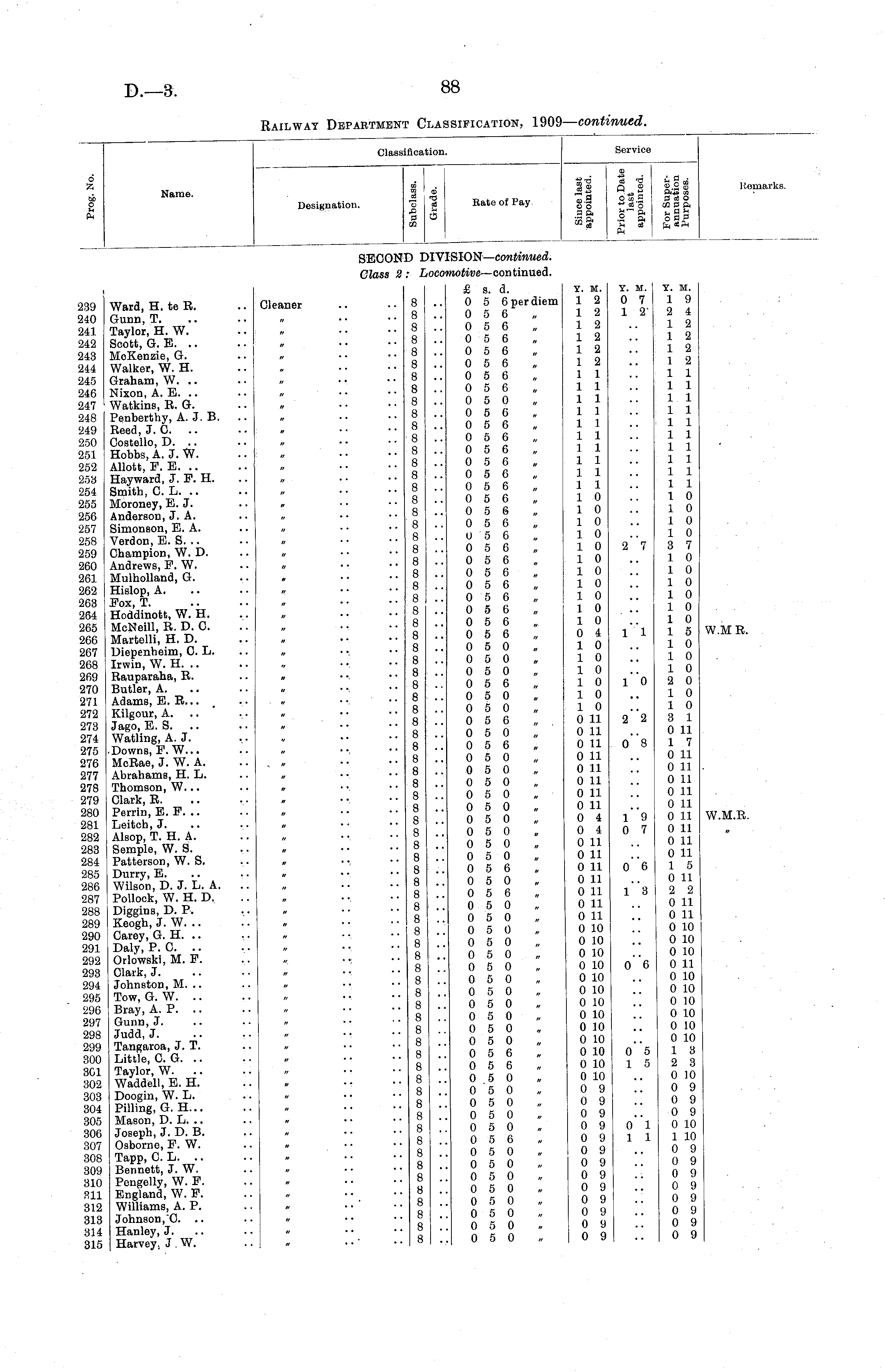 Classification. Service 6 'A o u Name. Designation. co co © £ 'B © ca ■S o Rate of Pay !l at |-2 8 £Z -& ■ J3 _ 0**3 « 0,0 O to _ 0 a. O o o ** a 3 O20& ft Remarks. SECON >iv: toco ISION — continued, motive —con tinued. Class 2 239 240 241 242 243 244 245 246 247 248 249 250 251 252 258 254 255 256 257 258 259 260 261 262 263 264 265 266 267 268 269 270 271 272 273 274 275 276 277 278 279 280 281 282 283 284 285 286 287 288 289 290 291 292 293 294 295 296 297 298 299 300 301 302 303 304 305 306 307 308 309 310 311 312 313 314 315 Ward, H. te R. Gunn, T. Taylor, H. W. Scott, G. E. McKenzie, G. Walker, W. H. Graham, W. Nixon, A. E. Watkins, R. G. Penberthy, A. J. B. Reed, J. 0. .. Costello, D. .. Hobbs, A. J. W. Allott, P. E. Hayward, J. P. H. Smith, 0. L. .. Moroney, E. J. Anderson, J. A. Simonson, E. A. Verdon, E. S. .. Champion, W. D. Andrews, F. W. Mulholland, G. Hislop, A. Pox, T. Hoddinott, W. H. McNeill, R. D. O. Martelli, H. D. Diepenheim, 0. L. Irwin, W. H. .. Rauparaha, R. Butler, A. Adams, E. R... Kilgour, A. Jago, E. S. .. Watling, A. J. .Downs, P. W... McRae, J. W. A. Abrahams, H. L. Thomson, W... Clark,R. Perrin, E. P. .. Leitch, J. Alsop, T. H. A. Semple, W. S. Patterson, W. S. Durry, E. Wilson, D. J. L. A. I Pollock, W. H. D. Diggins, D. P. Keogh, J. W. .. Carey, G. H. Daly, P. 0. Orlowski, M. P. Clark, J. Johnston, M. .. Tow, G. W. Bray, A. P. Gunn, J. Judd, J. Tangaroa, J. T. Little, 0. G. .. Taylor, W. Waddell, E. H. Doogin, W. L. Pilling, G. H... Mason, D. L. .. Joseph, J. D. B. Osborne, F. W. Tapp, C L. Bennett, J. W. Pengelly, W. F. Englana, W. F. Williams, A. P. Johnson, C .. Hanley, J. Harvey, J W. Gleaner 8 8 8 8 8 8 8 8 8 8 8 8 8 8 8 8 8 8 8 8 8 8 8 8 8 8 8 8 8 8 8 8 8 8 8 8 8 8 8 8 8 8 8 8 8 8 8 8 8 8 8 8 8 8 8 8 8 8 8 8 8 8 8 8 8 8 8 8 8 8 8 8 8 8 8 8 8 £ s. d. 0 5 6 per diem 0 5 6 0 5 6 0 5 6 0 5 6 0 5 6 0 5 6 0 5 6 0 5 0 0 5 6 0 5 6 0 5 6 0 5 6 0 5 6 0 5 6 0 5 6 0 5 6 0 5 6 0 5 6 0 5 6 0 5 6 0 5 6 0 5 6 0 5 6 0 5 6 0 5 6 0 5 6 0 5 6 0 5 0 0 5 0 0 5 0 0 5 6 0 5 0 0 5 0 0 5 6 0 5 0 0 5 6 0 5 0 0 5 0 0 5 0 0 5 0 0 5 0 0 5 0 0 5 0 0 5 0 0 5 0 0 5 6 0 5 0 0 5 6 0 5 0 0 5 0 0 5 0 0 5 0 0 5 0 0 5 0 0 5 0 0 5 0 0 5 0 0 5 0 0 5 0 0 5 0 0 5 6 0 5 6 0 5 0 0 5 0 0 5 0 0 5 0 0 5 0 0 5 6 0 5 0 0 5 0 0 5 0 0 5 0 0 5 0 0 5 0 0 5 0 0 5 0 y. m. 1 2 1 2 1 2 1 2 1 2 1 2 1 1 1 1 1 1 1 1 1 1 1 1 1 1 1 1 1 1 1 1 1 0 1 0 1 0 1 0 1 0 1 0 1 0 1 0 1 0 1 0 1 0 0 4 1 0 1 0 1 0 1 0 1 0 1 0 0 11 0 11 0 11 0 11 0 11 0 11 0 11 0 11 0 4 0 4 0 11 0 11 0 11 0 11 0 11 0 11 0 11 0 10 0 10 0 10 0 10 0 10 0 10 0 10 0 10 0 10 0 10 0 10 0 10 0 10 0 9 0 9 0 9 0 9 0 9 0 9 0 9 0 9 0 9 0 9 0 9 0 9 0 9 y. m. 0 7 1 2 2**7 l"l 1**0 2**2 0**8 y. m. 1 9 2 4 1 2 1 2 1 2 1 2 1 1 1 1 1 1 1 1 1 1 1 1 1 1 1 1 1 1 1 1 1 0 1 0 1 0 1 0 3 7 1 0 1 0 1 0 1 0 1 0 1 0 1 5 1 0 1 0 1 0 2 0 1 0 1 0 3 1 0 11 1 7 0 11 0 11 0 11 0 11 0 11 0 11 0 11 0 11 0 11 1 5 0 11 2 2 0 11 0 11 0 10 0 10 0 10 0 11 0 10 0 10 0 10 0 10 0 10 0 10 1 3 2 3 0 10 0 9 0 9 0 9 0 10 1 10 0 9 0 9 0 9 0 9 0 9 0 9 0 9 0 9 W.MR. 1**9 0 7 W.M.R. 0**6 1**8 0**6 0**5 1 5 0**1 1 1
