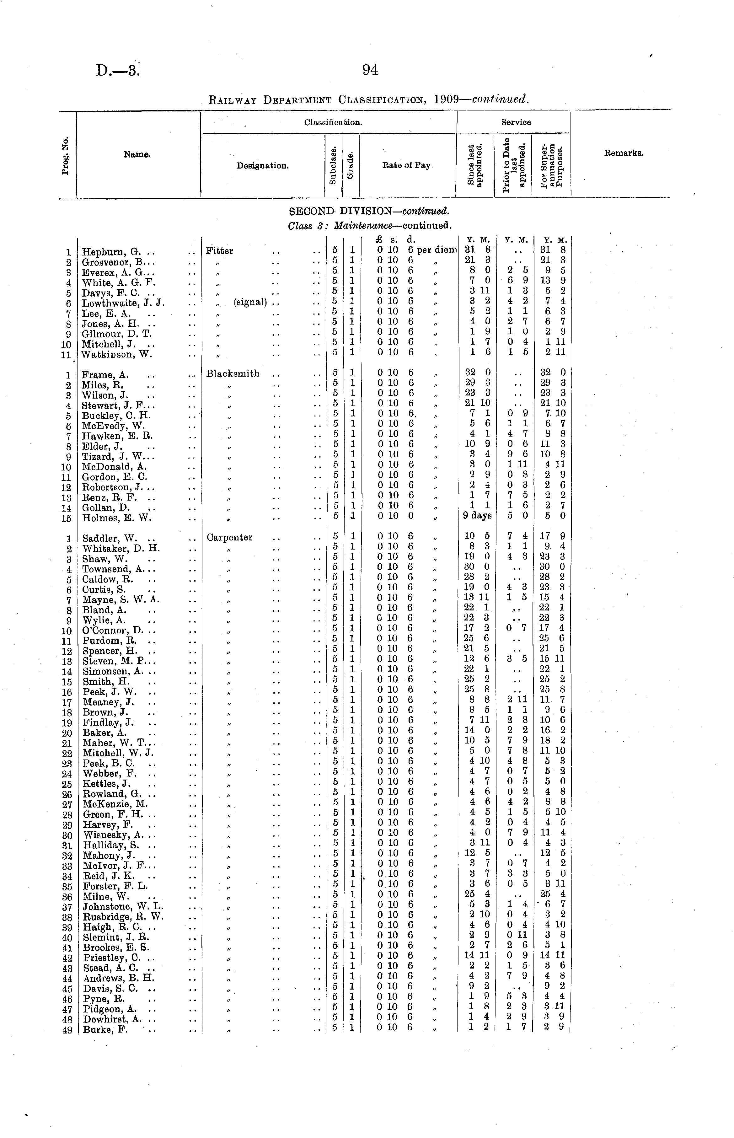 Classifici ition. Service d z ci 3 44 ft Name. Designation. CO CO ca ■© a 3 m CD ■B cB <5 Rate of Pay. 11 a t ||| ©9 °to9 Bceo ©3 -"ceo 033ft a ft g~ a h g j-j 33 a .2 ft o a a <" ca Jf * ft« ft ft Remarks. SECON nv: !SION— continued. Class 3: lint ■e tnance —con tinued. 1 2 3 4 5 6 7 8 9 10 11 Hepburn, G. .. Grosvenor, B... Everex, A. G... White, A. G. P. Davys, P. O. Lewthwaite, J. J. Lee, E. A. Jones, A. H. Gilmour, D. T. Mitchell, J. .. Watkinson, W. Fitter „ (signal) .. 5 5 5 5 5 5 5 5 5 5 5 1 1 1 1 1 1 1 1 1 1 1 £ a. d. 0 10 6 per diem 0 10 6 0 10 6 0 10 6 0 10 6 0 10 6 0 10 6 0 10 6 0 10 6 0 10 6 0 10 6 Y. M. 31 8 21 3 8 0 7 0 3 11 3 2 5 2 4 0 1 9 1 7 1 6 Y. M. 2 5 6 9 1 3 4 2 1 1 2 7 1 0 0 4 1 5 Y. M. 31 8 21 3 9 5 13 9 5 2 7 4 6 3 6 7 2 9 1 11 2 11 1 2 3 4 5 6 7 8 9 10 11 12 13 14 15 Frame, A. Miles, R. Wilson, J. Stewart, J. F... Buckley, O. H. McEvedy, W. Hawken, E. R. Elder, J. Tizard, J. W... McDonald, A. Gordon, E. 0. Robertson, J. .. Renz, R. F. Gollan, D. Holmes, E. W. Blacksmith 5 5 5 5 5 5 5 5 5 5 5 5 5 5 5 1 1 1 1 1 1 1 1 1 1 1 1 1 1 1 0 10 6 0 10 6 0 10 6 0 10 6 0 10 6. 0 10 6 0 10 6 ,, 0 10 6 0 10 6 0 10 6 0 10 6 0 10 6 0 10 6 0 10 6 0 10 0 32 0 29 3 23 3 21 10 7 1 5 6 4 1 10 9 3 4 3 0 2 9 2 4 1 7 1 1 9 days 0 9 1 1 4 7 0 6 9 6 1 11 0 8 0 3 7 5 1 6 5 0 32 0 29 3 23 3 21 10 7 10 6 7 8 8 11 3 10 8 4 11 2 9 2 6 2 2 2 7 5 0 1 2 3 4 5 6 8 9 10 11 12 13 14 15 16 17 18 19 20 21 22 23 24 25 26 27 28 29 30 31 32 33 34 35 36 37 38 39 40 41 42 43 44 45 46 47 48 49 Saddler, W. .. Whitaker, D. H. Shaw, W. Townsend, A. .. Caldow, R. Curtis, S. Mayne, S. W. A. Bland, A. Wylie, A. O'Connor, D. .. Purdom, R. .. Spencer, H. .. Steven, M. P... Simonsen, A. .. Smith, H. Peek, J. W. Meaney, J. Brown, J. Findlay, J. Baker, A. Maher, W. T... Mitohell, W. J. Peek, B. 0. Webber, F. .. Kettles, J. Rowland, G. McKenzie, M. Green, P. H. Harvey, F. Wisnesky, A. .. Halliday, S. .. Mahony, J. Mclvor, J. F... Reid, J. K. Forster, F. L. Milne, W. Johnstone, W. L. Rusbridge, R. W. Haigh, R. C Slemint, J. R. Brookes, E. S. Priestley, 0. .. Stead, A. 0. Andrews, B. H. Davis, S. C Pyne, R. Pidgeon, A. .. Dewhirst, A. Burke, F. Carpenter 5 5 5 5 5 5 5 5 5 5 5 5 5 5 5 5 5 5 5 5 5 5 5 5 5 5 5 5 5 5 5 5 5 5 5 5 6 5 5 5 5 5 5 5 5 5 5 6 5 1 1 1 1 1 1 1 1 1 1 1 1 1 1 1 1 1 1 1 1 1 1 1 1 1 1 1 1 1 1 1 1 1 1 1 1 1 1 1 1 1 1 1 1 1 1 1 1 1 0 10 6 0 10 6 0 10 6 0 10 6 0 10 6 0 10 6 0 10 6 0 10 6 0 10 6 0 10 6 0 10 6 0 10 6 0 10 6 0 10 6 0 10 6 0 10 6 0 10 6 0 10 6 0 10 6 0 10 6 0 10 6 0 10 6 0 10 6 0 10 6 0 10 6 0 10 6 0 10 6 0 10 6 0 10 6 0 10 6 0 10 6 0 10 6 0 10 6 0 10 6 0 10 6 0 10 6 0 10 6 0 10 6 0 10 6 0 10 6 0 10 6 0 10 6 0 10 6 0 10 6 0 10 6 0 10 6 0 10 6 0 10 6 0 10 6 10 5 8 3 19 0 30 0 28 2 19 0 13 11 22 1 22 3 17 2 25 6 21 5 12 6 22 1 25 2 25 8 8 8 8 5 7 11 14 0 10 5 5 0 4 10 4 7 4 7 4 6 4 6 4 5 4 2 4 0 3 11 12 5 3 7 3 7 3 6 25 4 5 3 2 10 4 6 2 9 2 7 14 11 2 2 4 2 9 2 1 9 1 8 1 4 1 2 7 4 1 1 4 8 4**3 1 5 0**7 3 5 2 11 1 1 2 8 2 2 7 9 7 8 4 8 0 7 0 5 0 2 4 2 1 5 0 4 7 9 0 4 17 9 9 4 23 3 30 0 28 2 23 3 15 4 22 1 22 3 17 4 25 6 21 5 15 11 22 1 25 2 25 8 11 7 9 6 10 6 16 2 18 2 11 10 5 3 5 2 5 0 4 8 8 8 5 10 4 5 11 4 4 3 12 5 4 2 5 0 3 11 25 4 • 6 7 3 2 4 10 3 8 5 1 14 11 3 6 4 8 9 2 4 4 3 11 3 9 2 9 0 7 3 3 0 5 1 4 0 4 0 4 0 11 2 6 0 9 1 5 7 9 5 3 2 3 2 9 1 7