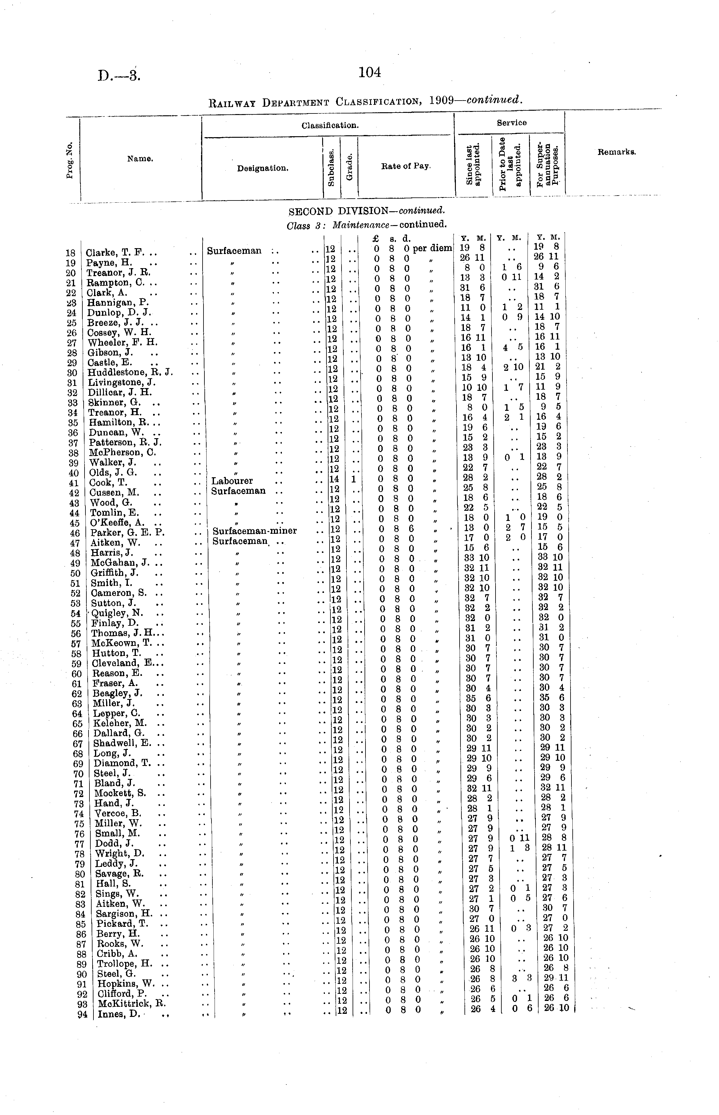 Classifici ition. iervi CO 6 ci> 3 Name. Designation. I i $ 0 CO -5 u O Rate of Pay. fi a i lis ""a otoa Peso S'S t*o m aa ag< o»- *S3 33 S | §• £§ftRemarks. SECOND DIV ISION — continued. Class 3: 'aim 'enance— continued. 18 ( 19 1 20 r 21 1 22 ( 23 1 24 ] 25 ] 26 I 27 ' 28 i 29 I 30 : 31 : 32 : 33 34 ' 35 36 37 38 39 40 41 42 43 44 45 46 47 48 49 50 51 52 53 54 ' 55 56 57 58 59 60 61 62 63 64 65 66 67 68 69 70 71 72 73 74 75 76 77 78 79 80 81 82 83 84 85 86 87 88 89 90 91 92 93 94 Clarke, T. P. Payne, H. Treanor, J. R. Rampton, 0. .. Clark, A. Hannigan, P. Dunlop, D. J. Breeze, J. J. Cossey, W. H. Wheeler, F. H. Gibson, J. Castle, E. Huddlestone, R. J. Livingstone, J. Dillicar, J. H. Skinner, G. Treanor, H. .. Hamilton, R. .. Duncan, W. .. Patterson, R. J. MoPherson, O. Walker, J. Olds, J. G. Cook, T. Cussen, M. Wood, G. Tomlin, E. O'Keeffe, A. .. Parker, G. E. P. Aitken, W. .. Harris, J. McGahan, J. .. Griffith, J. Smith, I. Cameron, S. .. Sutton, J. •Quigley, N. .. Finlay,D. Thomas, J.H... McKeown, T. .. Hutton, T. .. Cleveland, E... Reason, E. Praser, A. Beagley, J. Miller, J. Lepper, 0. Keleher, M. .. Dallard, G. .. Shaawell, E. .. Long, J. Diamona, T. .. Steel, J. Blancl, J. Mookett, S. .. Hand, J. Vercoe, B. Miller, W. .. Small, M. Dodd, J. Wright, D. .. Leddy, J. 1 Savage, R. Hall, S. 1 Sings, W. 1 Aitken, W. Sargison, H. .. i Pickard, T. .. 5 Berry, H. r Rooks, W. J Cribb, A. ) Trollope, H. .. ) Steel, G. 1 Hopkins, W. .. 2 Clifford, P. .. 3 McKittrick, R. I Innes, D. ., .. 5 Surfaoeman :. .. li 1 < .. 1! 1 ' .. 1! i .. 1 i •• 1 1 .. 1 1 .. 1 1 1 .. 1 .. 1 1 .. 1 i .. 1 i .. 1 1 .. 1 1 .. 1 i .. 1 1 .. 1 i .. 1 1 .. 1 1 ..I 1 .. 1 i .. 1 Labourer .. .. 1 Surfaceman .. .. 1 i i •• - Surfaceman-miner .. '. Surfaoeman, .. ■ ■ '■ 12 12 12 12 12 12 12 12 12 12 12 12 12 12 12 12 12 12 12 12 12 12 12 14 12 12 12 12 12 12 12 12 12 12 12 12 12 . 12 . 12 . 12 . 12 . 12 . 12 . 12 . 12 . 12 . 12 . 12 . 12 . 12 . 12 . 12 . 12 . 12 . 12 . 12 . 12 . 12 . 12 . 12 . 12 . 12 . 12 . 12 . 12 . 12 . 12 . 12 . 12 . 12 . 12 . 12 .. 12 .. 12 .. 12 .. 12 .. 12 1 £ s. d. 0 8 0 per diem 0 8 0 0 8 0 0 8 0 0 8 0 0 8 0 0 8 0 0 8 0 0 8 0 0 8 0 0 8 0 0 80 0 8 0 0 8 0 0 8 0 0 8 0 0 8 0 0 8 0 0 8 0 0 8 0 0 8 0 0 8 0 0 8 0 0 8 0 0 8 0 0 8 0 0 8 0 0 8 0 0 8 6 „ • 0 8 0 0 8 0 0 8 0 0 8 0 0 8 0 0 8 0 0 8 0 0 8 0 0 8 0 0 8 0 0 8 0 0 8 0 0 8 0 0 8 0 „ 0 8 0 0 8 0 0 8 0 0 8 0 0 8 0 0 8 0 0 8 0 0 8 0 0 8 0 0 8 0 0 8 0 0 8 0 0 8 0 0 8 0 0 8 0 0 8 0 0 8 0 0 8 0 0 8 0 0 8 0 0 8 0 0 8 0 0 8 0 0 8 0 0 8 0 0 8 0 0 8 0 0 8 0 0 8 0 0 8 0 0 8 0 0 8 0 0 8 0 0 8 0 Y. M. 19 8 26 11 8 0 13 3 31 6 18 7 11 0 14 1 18 7 16 11 16 1 13 10 18 4 15 9 10 10 18 7 8 0 16 4 19 6 15 2 23 3 13 9 22 7 28 2 25 8 18 6 22 5 18 0 13 0 17 0 15 6 33 10 32 11 32 10 32 10 32 7 32 2 32 0 31 2 31 0 30 7 30 7 30 7 30 7 30 4 35 6 30 3 30 3 30 2 30 2 29 11 29 10 29 9 29 6 32 11 28 2 28 1 27 9 27 9 27 9 27 9 27 7 27 5 27 3 27 2 27 1 30 7 27 0 26 11 26 10 26 10 26 10 26 8 26 8 26 6 26 5 26 4 Y. M. i"o 0 11 1 "2 0 9 4 5 2 io 1 "7 1**5 2 1 0 "l 1 0 2 7 2 0 Y. M. 19 8 26 11 9 6 14 2 31 6 18 7 11 1 14 10 18 7 16 11 16 1 13 10 21 2 15 9 11 9 18 7 9 5 16 4 19 6 15 2 23 3 13 9 22 7 28 2 25 8 18 6 22 5 19 0 15 5 17 0 15 6 33 10 32 11 32 10 32 10 32 7 32 2 32 0 31 2 31 0 30 7 30 7 30 7 30 7 30 4 35 6 30 3 30 3 30 2 30 2 29 11 29 10 29 9 29 6 32 11 28 2 28 1 27 9 27 9 28 8 28 11 27 7 27 5 27 3 27 3 27 6 30 7 27 0 27 2 26 10 26 10 26 10 26 8 29 11 26 6 26 6 26 10 o'ii 1 3 o"i 0 5 0**3 3**3 o"i 0 6