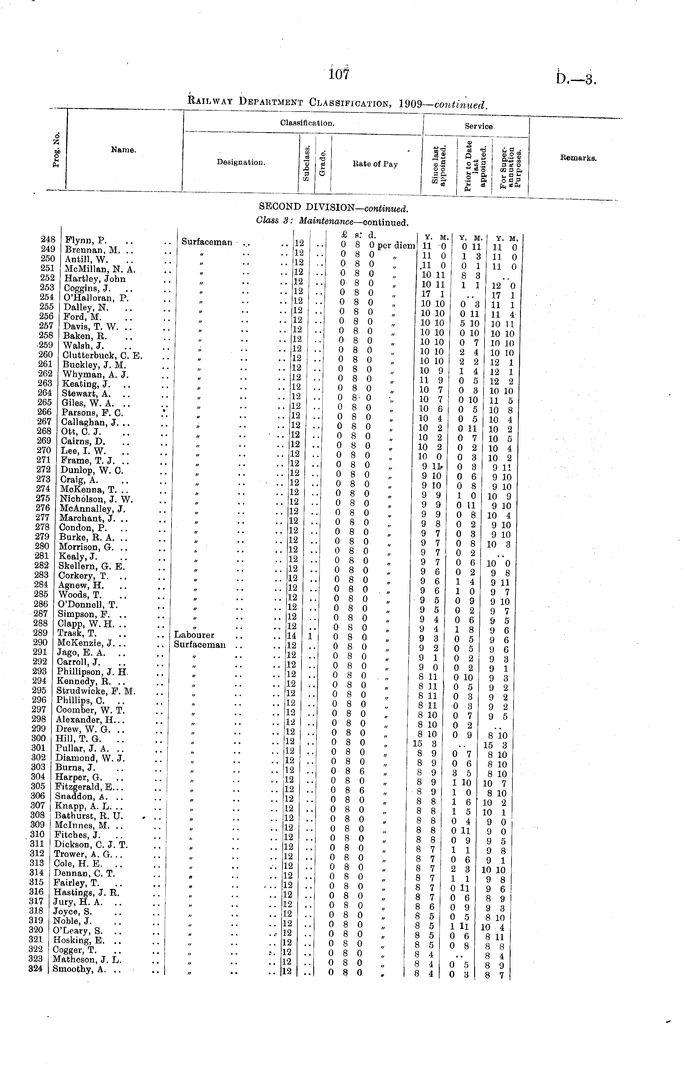 Classificatioi Service d A Of) o ft Name. Designation. . i CO £ ; ® .2 "Q O 0. 0 G CG CO §2 O 2 S.-2 8 <D.9 [ O ia.;; ; 3 _ o 2° I "T -£ © CG 3 _, .3 & o Q* ' -CI* toil- _ _• ! ° a J? Kate of Pay Remarks. secon: )iv: ISION— continued. Ci!ass 3: 'lintt '-nance —continued. 248 249 250 251 252 253 254 255 256 257 258 259 260 261 262 263 264 265 266 267 268 269 270 271 272 273 274 275 276 277 278 279 280 281 282 283 284 285 286 287 288 289 290 291 292 293 294 295 296 297 298 299 300 : 301 : 302 : 303 : 304 : 305 : 306 ! 307 : 308 ] 309 1 310 ] 311 1 312 . 313 ( 314 1 315 I 316 1 317 J 318 J 319 1 320 C 321 I 322 C 323 1 324 E 8 Plynn, P. 9 Brennan, M. .. 0 Antill, W. 1 McMillan, N. A. 2 Hartley, John 3 Coggins, J. 1 O'Halloran, P. 5 Dalley, N. .. 3 Ford, M. r Davis, T. W. .. i Baken, R. ) Walsh, J. ) Clutterbuck, 0. E. Buckley, J. M. ! Whyman, A. J. I Keating, J. Stewart, A. ■ Giles, W. A. .. > Parsons, F. C. Callaghan, J. .. Ott, 0. J. Cairns, D. Lee, I. W. Frame, T. J. Dunlop, W. 0. Craig, A. MoKenna, T. .. Nicholson, J. W. McAnnalley, J. Marohant, J. .. Condon, P. Burke, R. A. Morrison, G. .. Kealy, J. Skellern, G. E. Corkery, T. Agnew, H. Woods, T. O'Donnell, T. Simpson, F. .. Ciapp, W. H. .. Trask, T. McKenzie, J. .. Jago, E. A. Carroll, J. Phillipson, J. H. Kennedy, R. .. Strudwicke, P. M. Phillips, 0. .. Coomber, W. T. Alexander, H... Drew, W. G. Hill, T. G. Pullar, J. A. .. Diamond, W. J. Burns, J. Harper, G. Fitzgerald, E... Snaddon, A. Knapp, A. L. .. Bathurst, R. U. Mclnnes, M. .. Pitches, J. Dickson, 0. J. T. Trower, A. G. .. Cole, H. E. Dennan, C T. Fairley, T. Hastings, J. R. Jury, H. A. Joyce, S. Noble, J. O'Leary, S. Hosking, E. .. Cogger, T. Matheson, J. L. Smoothy, A. .. "'! Surfaceman .. : .. ] .. ] .. i .. i .. i .. i .. i .. l .. i .. l .. l .. l • .. i .. l .. l •• * .. l - .. l .. l .. l: .. 1! .. 11 .. 1! .. li .. 1! .. 15 .. 1! .. 15 .. 15 .. 15 .. 12 .. 12 .. 12 .. 12 .. 12 .. 12 .. 12 .. 12 ,. 12 .. 12 . 12 . 12 . 12 . 12 . 12 . 12 . 12 . 12 . 12 . 12 . 12 . 12 . 12 . 12 . 12 . 12 . 12 . 12 . 12 . 12 . 12 . 12 . 12 . 12 . 12 . 12 , 12 12 12 12 12 14 12 12 12 12 12 12 12 12 12 12 12 12 12 12 12 12 12 12 12 12 12 12 12 12 12 12 12 12 12 12 12 12 12 12 , 12 . £ a: d. 0 8 0 per diem 0 8 0 0 8 0 0 8 0 0 8 0 0 8 0 0 8 0 0 8 0 0 8 0 0 8 0 0 8 0 0 8 0 0 8 0 0 8 0 0 8 0 0 8 0 0 8-0 0 8 0 0 8 0 0 8 0 0 8 0 0 8 0 0 8 0 0 8 0 0 8 0 0 8 0 0 8 0 0 8 0 0 8 0 0 8 0 0 8 0 0 8 0 0 8 0 0 8 0 0 8 0 0 8 0 0 8 0 0 8 0 0 8 0 0 8 0 0 8 0 0 8 0 0 8 0 0 8 0 0 8 0 0 8 0 0 8 0 0 8 0 0 8 0 0 8 0 0 8 0 0 8 0 0 8 0,, 1 0 8 0 0 8 0 0 8 6 0 8 0 0 8 6,, 0 8 0 0 8 0 0 8 0 0 8 0 0 8 0 0 8 0 0 8 0 0 8 0,, 0 8 0,, ! 0 8 0,, ! 0 8 0,, ! 0 8 0,, I 0 8 0,, | 0 8 0,, ! 0 8 0,, i 0 8 0 | 0 8 0,, f 0 8 0 ( 0 8 0 „ | f | Y. M. n! 11 0 11 0 .11 o 10 11 10 11 17 1 10 10 10 10 10 10 10 10 10 10 10 10 10 10 10 9 11 9 10 7 10 7 10 6 10 4 10 2 10 2 10 2 10 0 9 11. 9 10 9 10 9 9 9 9 9 9 9 8 9 7 9 7 9 7 9 7 9 6 9 6 9 6 9 5 9 5 9 4 9 4 9 3 9 2 9 1 9 0 8 11 8 11 8 11 8 11 8 10 8 10 8 10 15 3 8 9 8 9 8 9 8 9 8 9 8 8 8 8 8 8 8 8 8 8 8 7 8 7 8 7 8 7 8 7 8 7 8 6 8 5 8 5 8 5 8 5 8 4 8 4 8 4 , Y. M. 0 11 1 3 0 1 8 3 1 1 0 3 0 11 5 10 0 10 0 7 2 4 2 2 1 4 0 5 0 3 0 10 0 5 0 5 0 11 0 7 0 2 0 3 0 3 0 6 0 8 1 0 0 Ll 0 8 0 2 0 3 0 8 0 2 0 6 0 2 1 4 1 0 0 9 0 2 0 6 1 8 0 5 0 5 0 2 0 2 0 10 0 5 0 3 0 3 0 7 0 2 0 9 :. y. M. . 11 0 I 11 0 11 0 12 0 17 1 11 1 11 4 10 11 10 10 10 10 10 10 12 1 12 1 12 2 10 10 11 5 10 8 10 4 10 2 10 5 10 4 10 2 9 11 9 10 9 10 10 9 9 10 10 4 9 10 9 10 10 3 10 0 9 8 9 11 9 7 9 10 9 7 9 5 9 6 9 6 9 6 9 3 9 1 9 3 9 2 9 2 9 2 9 5 .. IS .. IS Labourer Surfaceman .. .. IS .. U .. IS i' .. IS .. 12 .. IS .. 12 .. 12 .. 12 .. 12 .. 12 8 10 15 3 8 10 8 10 8 10 10 7 8 10 10 2 10 1 9 0 9 0 9 5 9 8 9 1 10 10 9 8 9 6 8 9 9 3 8 10 10 4 8 11 8 8 8 4 8 9 8 7 .. 12 .. 12 0 7 0 6 3 5 1 10 1 0 1 6 : 1 5 : 0 4 0 11 0 9 1 1 0 6 2 3 ] 1 1 0 11 0 6 0 9 0 5 1 U 1 0 6 0 8 .. 12 .. 12 .. 12 .. 12 .. 12 .. 12 .. 12 .. 12 .. 12 .. 12 .. 12 .. 12 .-. 12 n .. .. 12 ... 12 .. 12 .. 12 .. 12 .. 12 ... 12 .. 12 .-. 12 0 5 0 3 .. 12 .. 12