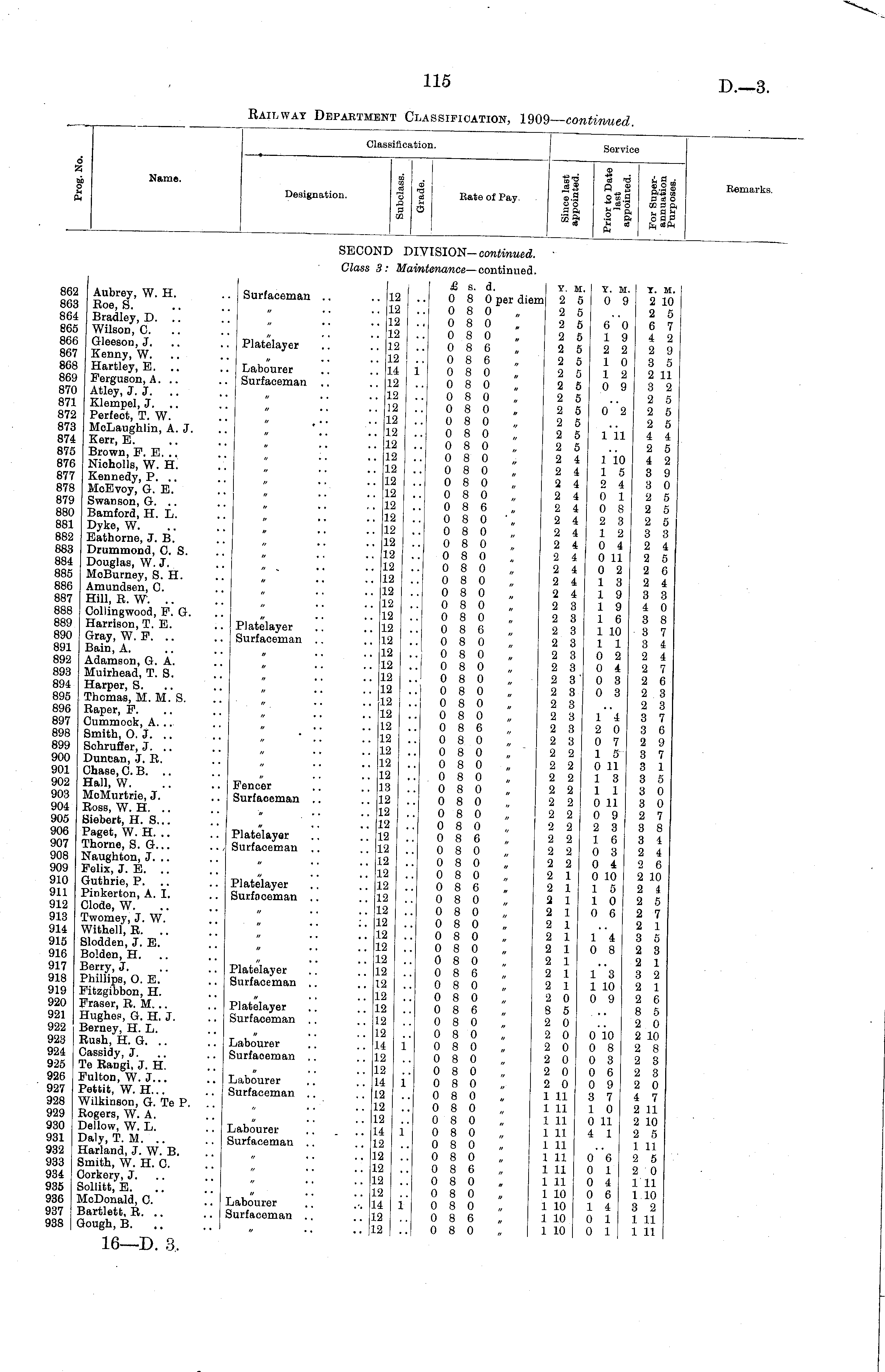lassi] ical jion. Service 6 A I Name. Designation. CO CO £ a a co CD O-J ca Rate of Pay. £2 CD .9 CD O a a CD a o it a j B 2 S.-S 3 „ 43 a ft-43 CO a co a oso ,* o m a a o2, „, a H .a a o a a £ ca fcctft Remarks. SECON 'IVISION— continued. Class 3 •dntenance —continued. 862 863 864 865 866 867 868 869 870 871 872 873 874 875 876 877 878 879 880 881 882 883 884 885 886 887 888 889 890 891 892 893 894 895 896 897 898 899 900 901 902 903 904 905 906 907 908 909 910 911 912 913 914 915 916 917 918 919 : 920 : 921 922 : 923 : 924 I 925 ! 926 ] 927 : 928 ' 929 5 930 ] 931 1 932 1 933 S 934 ( 935 I 936 I 937 1 938 ( 2 Aubrey, W. H. 3 Roe, S. 4 Bradley, D. .. 5 Wilson, 0. 3 Gleeson, J. I Kenny, W. 3 Hartley, E. .. 1 Ferguson, A. .. ) Atley, J. J. .. 5 Klempel, J. ! Perfeot, T. W. I McLaughlin, A. J. i Kerr, E. > Brown, F. E. .. 1 Nioholls, W. H. Kennedy, P. .. McEvoy, G. E. Swanson, G. .. Bamford, H. L. Dyke, W. Eathorne, J. B. Drummond, O. S. Douglas, W. J. MoBurney, S. H. Amundsen, O. Hill, R. W. .. Collingwood, F. G. Harrison, T. E. Gray, W. P. Bain, A. Adamson, G. A. Muirhead, T. S. Harper, S. Thomas, M. M. S. Raper, P. Cummock, A. .. Smith, 0. J. Schrufler, J. Duncan, J. R. Chase, CB. .. Hall, W. MoMurtrie, J. Ross, W. H. Siebert, H. S... Paget, W. H. .. Thome, S. G... Naughton, J. .. Felix, J. E. Guthrie, P. .. Pinkerton, A. I. Clode, W. Twomey, J. W. Withell, R. .. Slodden, J. E. Bolden, H. .. Berry, J. Phillips, O. E. Fitzgibbon, H. Fraser, R. M. .. Hughes, G. H. J. Berney, H. L. Rush, H. G. Cassidy, J. Te Rangi, J. H. Pulton, W. J... Pettit, W. H... Wilkinson, G. Te P. Rogers, W. A. Dellow, W. L. Daly, T. M. .. Harland, J. W. B. Smith, W. H. C Corkery, J. Sollitt, E. McDonald, 0. Bartlett, R. .. Gough, B. .. ] .. ! ..' 1 • • h .'. 1 .. t .. 1 .. i .. I .. £ .. I .. S . • Surfaceman .. . Platelayer . Labourer . Surfaceman .. Platelayer Surfaceman .. .. 5 .. ] .. 5 .. 1 .. 1 .. 1 .. 1 .. 1 .. 1 .. 1 .. 1 .. 1 .. 12 .. 12 .. 12 .. 12 .. 12 .. 12 .. 14 .. 12 .. 12 .. 12 .. 12 .. 12 .. 12 .. 12 .. 12 .. 12 . 12 . 12 . 12 . 12 . 12 . 12 . 12 . 12 . 12 . 12 . 12 . 12 . 12 . 12 . 12 . 12 . 12 . 12 . 12 . 12 . 12 . 12 . 12 , 12 13 12 12 12 12 12 12 12 12 12 12 12 12 12 12 12 12 12 12 12 12 14 : 12 12 14 5 12 12 12 , 14 1 12 . 12 . 12 . 12 . 12 . 14 1 12 . 12 . £ s. d. 0 8 0 per diem 0 8 0 0 8 0 .. 0 8 0 „ 0 8 6 0 8 6 1 0 8 0 0 8 0 0 8 0 0 8 0 0 8 0 0 8 0 0 8 0 0 8 0 0 8 0 0 8 0 0 8 0 0 8 6 0 8 0 '„ 0 8 0 0 8 0 0 8 0 0 8 0 0 8 0 0 8 0 0 8 0 0 8 0 0 8 6 0 8 0 0 8 0 ■ 0 8 0 • 0 8 0 0 8 0 0 8 0 0 8 0 0 8 6 0 8 0 0 8 0 0 8 0 0 8 0 0 8 0 0 8 0 0 8 0 0 8 0 0 8 6 0 8 0 0 8 0 0 8 0 0 8 6 0 8 0 0 8 0 0 8 0 0 8 0 0 8 0 0 8 0 0 8 6 0 8 0 0 8 0 0 8 6,, 0 8 0,, ! 0 8 0,, : 0 8 0 ! 0 8 0,, ! 0 8 0,, ! 0 8 0,, ! 0 8 0,, 0 8 0,, : 0 8 0,, : 0 8 0,, j 0 8 0,, ] 0 8 0,, 1 0 8 6,, 1 0 8 0, 1 0 8 0,, 1 0 8 0,, 1 0 8 6,, 1 0 8 0,, 1 Y. M. a 2 5 2 5 2 5 2 5 2 5 2 5 2 5 2 5 2 5 2 5 2 5 2 5 2 5 2 4 2 4 2 4 2 4 2 4 2 4 2 4 2 4 2 4 2 4 2 4 2 4 2 3 2 3 2 3 2 3 2 3 2 3 2 3' 2 3 2 3 2 8 2 3 2 3 2 2 2 2 2 2 2 2 2 2 2 2 2 2 2 2 2 2 2 2 2 1 2 1 2 1 2 1 2 1 2 1 2 1 2 1 2 1 2 1 2 0 8 5 2 0 2 0 2 0 2 0 2 0 2 0 1 11 1 11 1 11 1 11 1 11 1 11 1 11 1 11 1 10 1 10 1 10 1 10 i Y. M. 0 9 6 0 1 9 2 2 1 0 1 2 0 9 0**2 l'il 1 10 1 5 2 4 0 1 0 8 2 3 1 2 0 4 0 11 0 2 1 3 1 9 1 9 1 6 1 10 1 1 0 2 0 4 0 3 0 3 1 4 2 0 0 7 1 5 0 11 1 3 1 1 0 11 0 9 2 3 1 6 0 3 0 4 0 10 1 5 1 0 0 6 Y. M. 2 10 2 5 6 7 4 2 2 9 3 5 2 11 3 2 2 5 2 5 2 5 4 4 2 5 4 2 3 9 3 0 2 5 2 5 2 5 3 3 2 4 2 5 2 6 2 4 3 3 4 0 3 8 3 7 3 4 2 4 2 7 2 6 2 3 2 3 3 7 3 6 2 9 3 7 3 1 3 5 3 0 3 0 2 7 3 8 3 4 2 4 2 6 2 10 2 4 2 5 2 7 2 1 3 5 2 3 2 1 3 2 2 1 2 6 8 5 2 0 2 10 2 8 2 3 2 3 2 0 4 7 2 11 2 10 2 5 1 11 2 5 2 0 I'll 1.10 3 2 1 11 1 11 .. 1 Fencer Surfaoeman .. .. 1 .. 1 .. 1 .. 1 Platelayer Surfaceman .. .. 1 .. 1 .. 1 .. l: Platelayer Surfaceman .. .. 1! .. l: .. l; .. 1! :. 1! .. L 1 4 0 8 .. 1! Platelayer Surfaceman .. .. IS .. IS .. IS 1 3 1 10 0 9 Platelayer Surfaceman .. .. IS .. IS .. IS Labourer Surfaceman .. Labourer Surfaceman .. .. IS .. 14 .. IS .. IS .. 14 .. 12 0 10 0 8 0 3 0 6 0 9 3 7 1 0 0 11 4 1 .. 12 Labourer Surfaceman .. .. 12 . .. 14 .. 12 Labourer Surfaceman .. .. 12 .. 12 .. 12 .. 12 .-. 14 .. 12 0 6 0 1 0 4 0 6 1 4 0 1 0 1 .. 12
