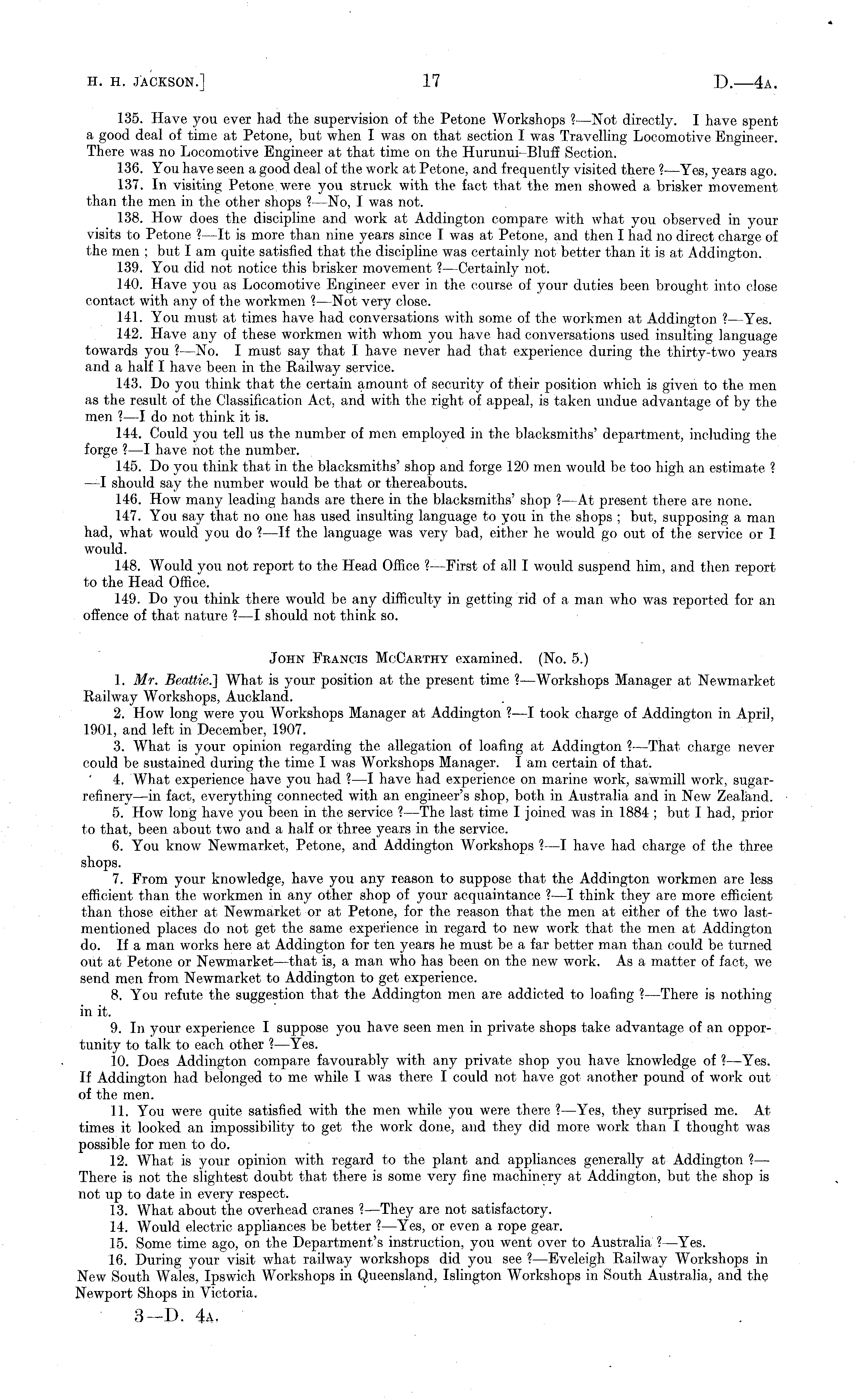 135. Have you ever had the supervision of the Petone Workshops ?—Not directly. I have spent a good deal of time at Petone, but when I was on that section I was Travelling Locomotive Engineer. There was no Locomotive Engineer at that time on the Hurunui-Bluff Section. 136. You have seen a good deal of the work at Petone, and frequently visited there ?—Yes, years ago. 137. In visiting Petone were you struck with the fact that the men showed a brisker movement than the men in the other shops ?—No, I was not. 138. How does the discipline and work at Addington compare with what you observed in your visits to Petone ?—lt is more than nine years since I was at Petone, and then I had no direct charge of the men ; but I am quite satisfied that the discipline was certainly not better than it is at Addington. 139. You did not notice this brisker movement % —Certainly not. 140. Have you as Locomotive Engineer ever in the course of your duties been brought into close contact with any of the workmen ? —Not very close. 141. You must at times have had conversations with some of the workmen at Addington ?—Yes. 142. Have any of these workmen with whom you have had conversations used insulting language towards you ? —No. I must say that I have never had that experience during the thirty-two years and a half I have been in the Railway service. 143. Do you think that the certain amount of security of their position which is given to the men as the result of the Classification Act, and with the right of appeal, is taken undue advantage of by the men ?—I do not think it is. 144. Could you tell us the number of men employed in the blacksmiths' department, including the forge ? —I have not the number. 145. Do you think that in the blacksmiths' shop and forge 120 men would bo too high an estimate ? —I should say the number would be that or thereabouts. 146. How many leading hands are there in the blacksmiths' shop ? —At present there are none. 147. You say that no one has used insulting language to you in the shops ; but, supposing a man had, what would you do ? —lf the language was very bad, either he would go out of the service or I would. 148. Would you not report to the Head Office ?—First of all I would suspend him, and then report to the Head Office. 149. Do you think there would be any difficulty in getting rid of a man who was reported for an offence of that nature ? —I should not think so. John Francis McCarthy examined. (No. 5.) 1. Mr. Beattie.] What is your position at the present time ? —Workshops Manager at Newmarket Railway Workshops, Auckland. 2. How long were you Workshops Manager at Addington ? —I took charge of Addington in April, 1901, and left in December, 1907. 3. What is your opinion regarding the allegation of loafing at Addington ?—That charge never could be sustained during the time I was Workshops Manager. lam certain of that. 4. What experience have you had ? —I have had experience on marine work, sawmill work, sugarrefinery —in fact, everything connected with an engineer's shop, both in Australia and in New Zealand. 5. How long have you been in the service ? —The last time I joined was in 1884 ; but I had, prior to that, been about two and a half or three years in the service. 6. You know Newmarket, Petone, and Addington Workshops ? —I have had charge of the three shops. 7. From your knowledge, have you any reason to suppose that the Addington workmen are less efficient than the workmen in any other shop of your acquaintance ? —I think they are more efficient than those either at Newmarket or at Petone, for the reason that the men at either of the two lastmentioned places do not get the same experience in regard to new work that the men at Addington do. If a man works here at Addington for ten years he must be a far better man than could be turned out at Petone or Newmarket —that is, a man who has been on the new work. As a matter of fact, we send men from Newmarket to Addington to get experience. 8. You refute the suggestion that the Addington men are addicted to loafing ? —There is nothing in it. 9. In your experience I suppose you have seen men in private shops take advantage of an opportunity to talk to each other ? —Yes. 10. Does Addington compare favourably with any private shop you have knowledge of ? —Yes. If Addington had belonged to me while I was there I could not have got another pound of work out of the men. 11. You were quite satisfied with the men while you were there ? —Yes, they surprised me. At times it looked an impossibility to get the work done, and they did more work than I thought was possible for men to do. 12. What is your opinion with regard to the plant and appliances generally at Addington ?— There is not the slightest doubt that there is some very fine machinery at Addington, but the shop is not up to date in every respect. 13. What about the overhead cranes ?—They are not satisfactory. 14. Would electric appliances be better ? —Yes, or even a rope gear. 15. Some time ago, on the Department's instruction, you went over to Australia ?—Yes. 16. During your visit what railway workshops did you see ? —Eveleigh Railway Workshops in New South Wales, Ipswich Workshops in Queensland, Islington Workshops in South Australia, and the Newport Shops in Victoria.