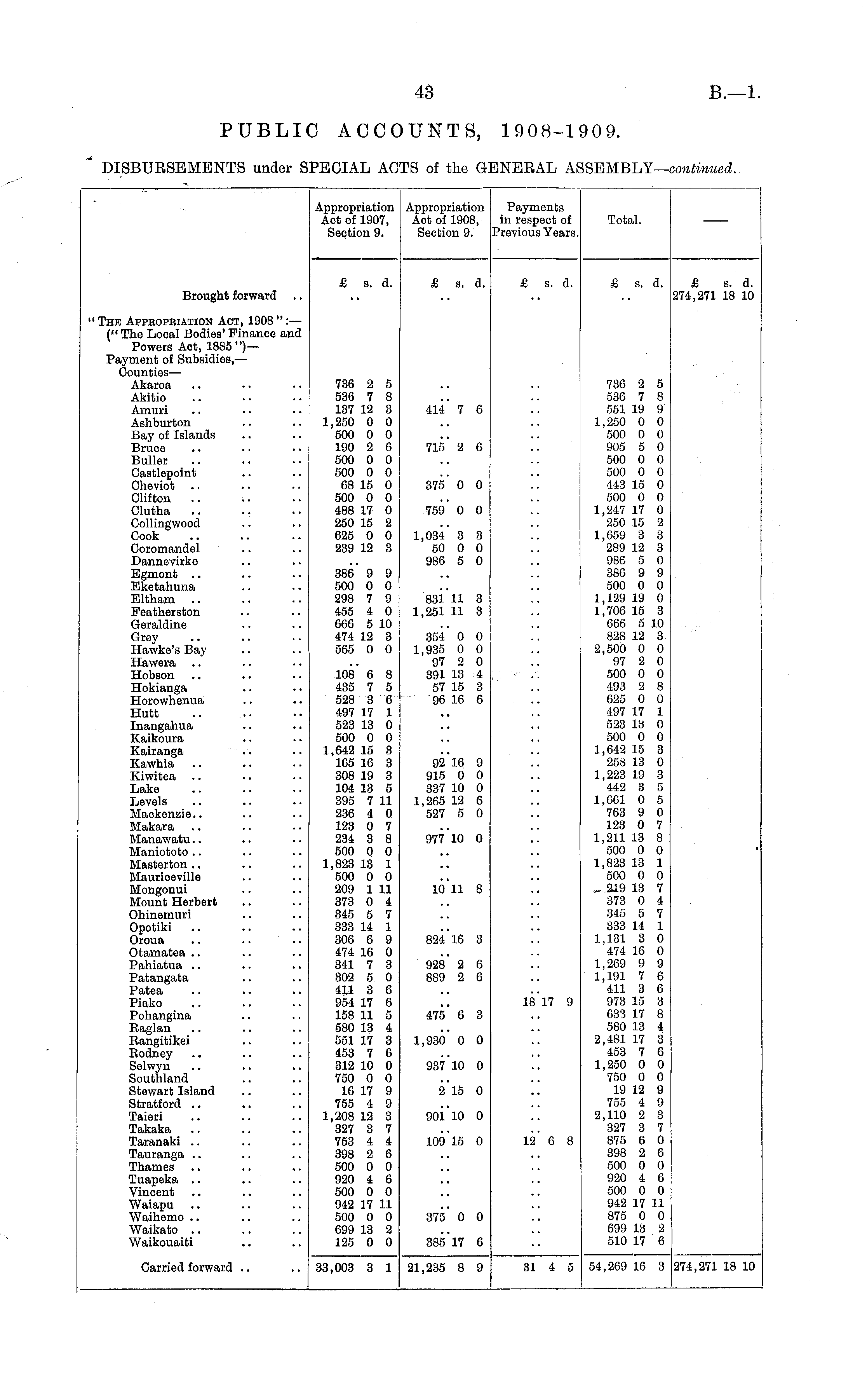 Appropriation Act of 1907, Section 9. Appropriation Aot of 1908, Section 9. Payments in respect of Previous Years. Total. Brought forward £ s. d. £ s. d. £ s. d. £ s. d. £ s. d. 274,271 18 10 'he Appbopeiation Act, 1908 " :— (" The Local Bodies' Finance and Powers Aot, 1885 ")— Payment of Subsidies, — Counties — Akaroa Akitio Amuri Ashburton Bay of Islands Bruce Buller Castlepoint Cheviot Clifton .. Clutha .. Collingwood Cook Coromandel Dannevirke Egmont Eketahuna Eltham .. Featherston Geraldine Grey Hawke's Bay Hawera Hobson Hokianga Horowhenua Hutt Inangahua Kaikoura Kairanga Kawhia Kiwitea Lake Levels Mackenzie.. Makara Manawatu.. Maniototo Masterton Maurioeville Mongonui Mount Herbert Ohinemuri Opotiki Oroua .. .. Otamatea Pahiatua Patangata Patea Piako Pohangina Raglan Rangitikei Rodney Selwyn Southland Stewart Island Stratford Taieri Takaka Taranaki Tauranga Thames Tuapeka Vincent Waiapu Waihemo Waikato Waikouaiti 736 2 5 536 7 8 137 12 3 1,250 0 0 500 0 0 190 2 6 500 0 0 500 0 0 68 15 0 500 0 0 488 17 0 250 15 2 625 0 0 239 12 3 386 9 9 500 0 0 298 7 9 455 4 0 666 5 10 474 12 3 565 0 0 108 6 8 435 7 5 528 3 6 497 17 1 523 13 0 500 0 0 1,642 15 3 165 16 3 308 19 3 104 13 5 395 7 11 236 4 0 123 0 7 234 3 8 500 0 0 1,823 13 1 500 0 0 209 1 11 373 0 4 345 5 7 333 14 1 306 6 9 474 16 0 341 7 3 302 5 0 411 3 6 954 17 6 158 11 5 580 13 4 551 17 3 453 7 6 312 10 0 750 0 0 16 17 9 755 4 9 1,208 12 3 327 3 7 753 4 4 398 2 6 500 0 0 920 4 6 500 0 0 942 17 11 500 0 0 699 13 2 125 0 0 414* 7 6 715' 2 6 375' 0 0 759 0 0 1,034 3 3 50 0 0 986 5 0 831 11 3 1,251 11 3 354 0 0 1,935 0 0 97 2 0 391 13 4 57 15 3 96 16 6 92 16 9 915 0 0 337 10 0 1,265 12 6 527 5 0 736 2 5 536 7 8 551 19 9 1,250 0 0 500 0 0 905 5 0 500 0 0 500 0 0 443 15 0 500 0 0 1,247 17 0 250 15 2 1,659 3 3 289 12 3 986 5 0 386 9 9 500 0 0 1,129 19 0 1,706 15 3 666 5 10 828 12 3 2,500 0 0 97 2 0 500 0 0 493 2 8 625 0 0 497 17 1 523 18 0 500 0 0 1,642 15 3 258 13 0 1,223 19 3 442 3 5 1,661 0 5 763 9 0 123 0 7 1,211 13 8 500 0 0 1,823 13 1 500 0 0 219 13 7 373 0 4 345 5 7 333 14 1 1,131 3 0 474 16 0 1,269 9 9 1,191 7 6 411 3 6 973 15 3 633 17 8 580 13 4 2,481 17 3 453 7 6 1,250 0 0 750 0 0 19 12 9 755 4 9 2,110 2 3 327 3 7 875 6 0 398 2 6 500 0 0 920 4 6 500 0 0 942 17 11 875 0 0 699 13 2 510 17 6 977 10 0 1011 8 824*16 3 928* 2 6 889 2 6 18'l7 9 475* 6 3 1,930* 0 0 937 10 0 215 0 90110 0 109 15 0 12' 6 8 375* 0 0 385'l7 6 Carried forward 33,003 3 1 21,235 8 9 31 4 5 54,269 16 3 274,271 18 10