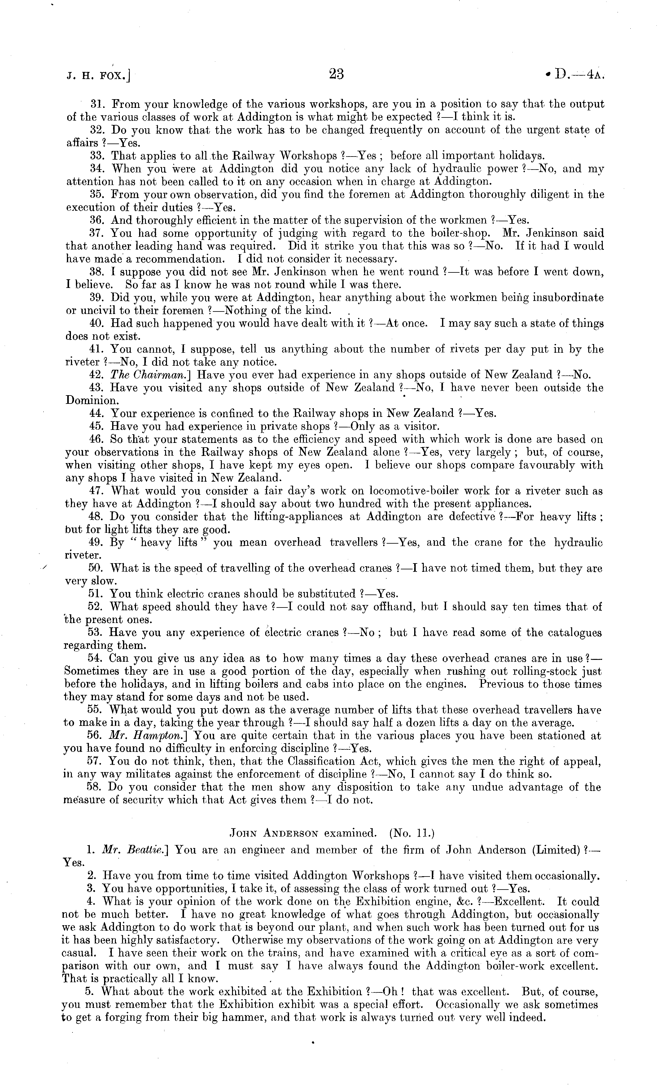 81. From your knowledge of the various workshops, are you in a position to say that the output of the various classes of work at Addington is what might be expected ? —I think it is. 32. Do you know that the work has to be changed frequently on account of the urgent state of affairs ? —Yes. 33. That applies to all the Railway Workshops ?—Yes ; before all important holidays. 34. When you were at Addington did you notice any lack of hydraulic power ? —No, and my attention has not been called to it on any occasion when in charge at Addington. 35. From your own observation, did you find the foremen at Addington thoroughly diligent in the execution of their duties ?—Yes. 36. And thoroughly efficient in the matter of the supervision of the workmen ? —Yes. 37. You had some opportunity of judging with regard to the boiler-shop. Mr. Jenkinson said that another leading hand was required. Did it strike you that this was so ?—No. If it had I would have made a recommendation. I did not consider it necessary. 38. I suppose you did not see Mr. Jenkinson when he went round I—lt was before I went down, I believe. So far as I know he was not round while I was there. 39. Did you, while you were at Addington, hear anything about the workmen being insubordinate or uncivil to their foremen ? —Nothing of the kind. 40. Had such happened you would have dealt with it ? —At once. I may say such a state of things does not exist. 41. You cannot, I suppose, tell, us anything about the number of rivets per day put in by the riveter ?—No, I did not take any notice. 42. The Chairman.] Have you ever had experience in any shops outside of New Zealand ?—No. 43. Have you visited any shops outside of New Zealand ? —No, I have never been outside the Dominion. 44. Your experience is confined to the Railway shops in New Zealand ?—Yes. 45. Have you had experience in private shops ?—Only as a visitor. 46. So that your statements as to the efficiency and speed with which work is done are based on your observations in the Railway shops of New Zealand alone I —Yes, very largely ; but, of course, when visiting other shops, I have kept my eyes open. I believe our shops compare favourably with any shops I nave visited in New Zealand. 47. What would you consider a fair day's work on locomotive-boiler work for a riveter such as they have at Addington ?—I should say about two hundred with the present appliances. 48. Do you consider that the lifting-appliances at Addington are defective ? —For heavy lifts : but for light lifts they are good. 49. By " heavy lifts " you mean overhead travellers ? —Yes, and the crane for the hydraulic riveter. 50. What is the speed of travelling of the overhead cranes ?—I have not timed them, but they are very slow. 51. You think electric cranes should be substituted ? —Yes. 52. What speed should they have ?—I could not say offhand, but I should say ten times that of the present ones. 53. Have you any experience of electric cranes ? —No ; but I have read some of the catalogues regarding them. 54. Can you give us any idea as to how many times a day these overhead cranes are in use 1 — Sometimes they are in use a good portion of the day, especially when rushing out rolling-stock just before the holidays, and in lifting boilers and cabs into place on the engines. Previous to those times they may stand for some days and not be used. 55. What would you put down as the average number of lifts that these overhead travellers have to make in a day, taking the year through ? —I should say half a dozen lifts a day on the average. 56. Mr. Hampton.] You are quite certain that in the various places you have been stationed at you have found no difficulty in enforcing discipline ?—Yes. 57. You do not think, then, that the Classification Act, which gives the men the right of appeal, in any way militates against the enforcement of discipline ?—No, I cannot say I do think so. 58. Do you consider that the men show any disposition to take any undue advantage of the measure of security which that Act gives them ? —I do not. John Anderson examined. (No. 11.) 1. Mr. Beattie.] You are an engineer and member of the firm of John Anderson (Limited) ? — Yes. 2. Have you from time to time visited Addington Workshops I—l1 —I have visited them occasionally. 3. You have opportunities, I take it, of assessing the class of work turned out ?—Yes. 4. What is your opinion of the work done on the Exhibition engine, &c. ?—Excellent. It could not be much better. I have no great knowledge of what goes through Addington, but occasionally we ask Addington to do work that is beyond our plant, and when such work has been turned out for us it has been highly satisfactory. Otherwise my observations of the work going on at Addington are very casual. I have seen their work on the trains, and have examined with a critical eye as a sort of comparison with our own, and I must say I have always found the Addington boiler-work excellent. That is practically all I know. 5. What about the work exhibited at the Exhibition ? —Oh ! that was excellent. But, of course, you must remember that the Exhibition exhibit was a special effort. Occasionally we ask sometimes to get a forging from their big hammer, and that work is always turned out very well indeed.