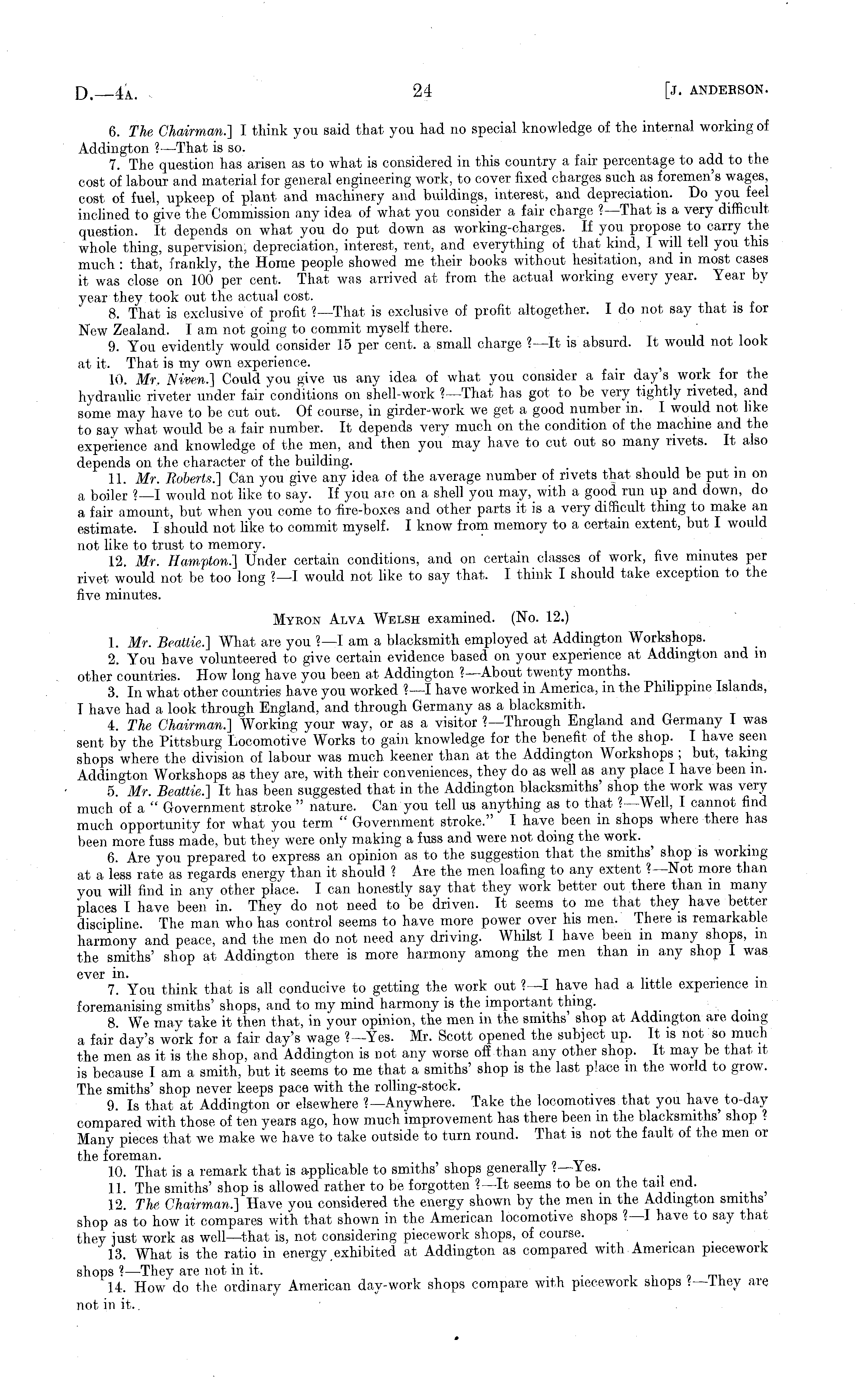 6. The Chairman.'] I think you said that you had no special knowledge of the internal working of Addington? —That is so. 7. The question has arisen as to what is considered in this country a fair percentage to add to the cost of labour and material for general engineering work, to cover fixed charges such as foremen's wages, cost of fuel, upkeep of plant and machinery and buildings, interest, and depreciation. Do you feel inclined to give the Commission any idea of what you consider a fair charge ?— That is a very difficult question. It depends on what you do put down as working-charges. If you propose to carry the whole thing, supervision, depreciation, interest, rent, and everything of that kind, I will tell you this much : that, frankly, the Home people showed me their books without hesitation, and in most cases it was close on 100 per cent. That was arrived at from the actual working every year. Year by year they took out the actual cost. 8. That is exclusive of profit '—That is exclusive of profit altogether. Ido not say that is for New Zealand. lam not going to commit myself there. 9. You evidently would consider 15 per cent, a small charge ?—lt is absurd. It would not look at it. That is my own experience. ; 10. Mr. Niven.] Could you give us any idea of what you consider a fair day s work for the hydraulic riveter under fair conditions on shell-work ?—That has got to be very tightly riveted, and some may have to be cut out. Of course, in girder-work we get a good number in. I would not like to say what would be a fair number. It depends very much on the condition of the machine and the experience and knowledge of the men, and then you may have to cut out so many rivets. It also depends on the character of the building. 11. Mr. Roberts.] Can you give any idea of the average number of rivets that should be put in on a boiler ?—I would not like to say. If you aie on a, shell you may, with a good run up and down, do a fair amount, but when you come to fire-boxes and other parts it is a very difficult thing to make an estimate. I should not like to commit myself. I know from memory to a certain extent, but I would not like to trust to memory. 12. Mr. Hampton.] Under certain conditions, and on certain classes of work, five minutes per rivet would not be too long ?—I would not like to say that, I think I should take exception to the five minutes. Myron Alva Welsh examined. (No. 12.) 1. Mr. Beattie.] What are you ?—I am a blacksmith employed at Addington Workshops. 2. You have volunteered to give certain evidence based on your experience at Addington and in other countries. How long have you been at Addington ?—About twenty months. 3. In what other countries have you worked ?—I have worked in America, in the Philippine Islands, I have had a look through England, and through Germany as a blacksmith. 4. The Chairman.] Working your way, or as a visitor ?— Through England and Germany I was sent by the Pittsburg Locomotive Works to gain knowledge for the benefit of the shop. I have seen shops where the division of labour was much keener than at the Addington Workshops ; but, taking Addington Workshops as they are, with their conveniences, they do as well as any place I have been in. 5. Mr. Beattie.] It has been suggested that in the Addington blacksmiths' shop the work was very much of a " Government stroke " nature. Can you tell us anything as to that ?— Well, I cannot find much opportunity for what you term " Government stroke." I have been in shops where there has been more fuss made, but they were only making a fuss and were not doing the work. 6. Are you prepared to express an opinion as to the suggestion that the smiths' shop is working at a less rate as regards energy than it should ? Are the men loafing to any extent ?— Not more than you will find in any other place. I can honestly say that they work better out there than m many places I have been in. They do not need to be driven. It seems to me that they have better discipline. The man who has control seems to have more power over his men. There is remarkable harmony and peace, and the men do not need any driving. Whilst I have been in many shops, m the smiths' shop at Addington there is more harmony among the men than in any shop I was ever in. 7. You think that is all conducive to getting the work out ?—I have had a little experience in foremanising smiths' shops, and to my mind harmony is the important thing. 8 We may take it then that, in your opinion, the men in the smiths shop at Addington are doing a fair day's work for a fair day's wage ?— Yes. Mr. Scott opened the subject up. It is not so much the men as it is the shop, and Addington is not any worse off than any other shop. It may be that it is because I am a smith, but it seems to me that a smiths' shop is the last place in the world to grow. The smiths' shop never keeps pace with the rolling-stock. 9. Is that at Addington or elsewhere ?— Anywhere. Take the locomotives that you have to-day compared with those of ten years ago, how much improvement has there been in the blacksmiths' shop ? Many pieces that we make we have to take outside to turn round. That is not the fault of the men or the foreman. 10. That is a remark that is applicable to smiths' shops generally «—Yes. 11. The smiths' shop is allowed rather to be forgotten ?—lt seems to be on the tail end. 12. The Chairman.] Have you considered the energy shown by the men in the Addington smiths shop as to how it compares with that shown in the American locomotive shops ?—I have to say that they iust work as well—that is, not considering piecework shops, of course. ■ 13. What is the ratio in energy exhibited at Addington as compared with American piecework shops ? —They are not in it. . 14. How do the ordinary American day-work shops compare with piecework shops <—lney are not in it..