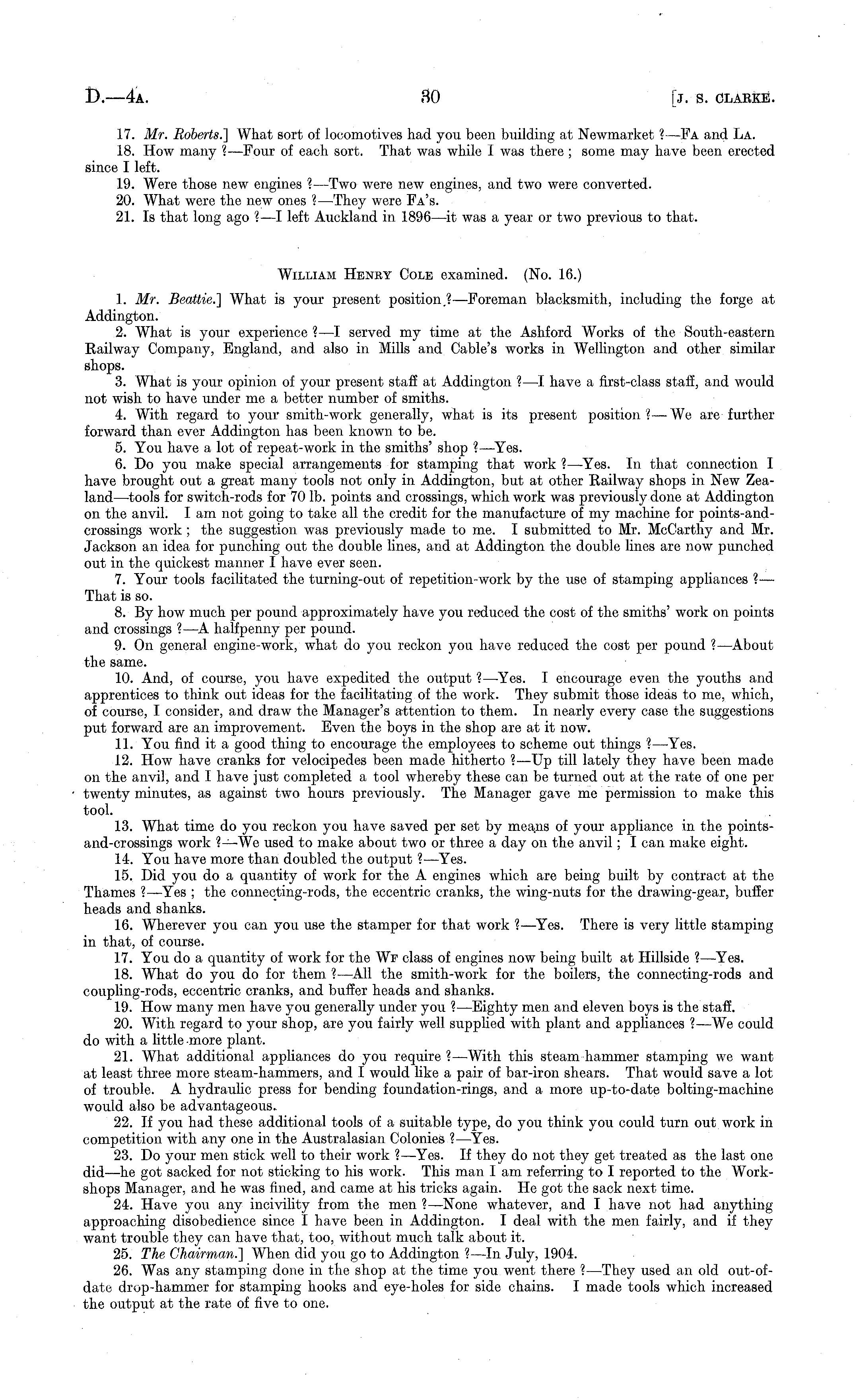 17. Mr. Roberts.] What sort of locomotives had you been building at Newmarket ?—Fα and Lα. 18. How many ? —Four of each sort. That was while I was there ; some may have been erected since I left. 19. Were those new engines ? —Two were new engines, and two were converted. 20. What were the new ones ?—They were Fa's. 21. Is that long ago ?—I left Auckland in 1896—it was a year or two previous to that. William Henry Cole examined. (No. 16.) 1. Mr. Beattie.~\ What is your present position,?— Foreman blacksmith, including the forge at Addington. 2. What is your experience ?—I served my time at the Ashford Works of the South-eastern Railway Company, England, and also in Mills and Cable's works in Wellington and other similar shops. 3. What is your opinion of your present staff at Addington % —I have a first-class staff, and would not wish to have under me a better number of smiths. 4. With regard to your smith-work generally, what is its present position?—We are further forward than ever Addington has been known to be. 5. You have a lot of repeat-work in the smiths' shop ?—Yea. 6. Do you make special arrangements for stamping that work ?—Yes. In that connection I have brought out a great many tools not only in Addington, but at other Railway shops in New Zealand —tools for switch-rods for 70 lb. points and crossings, which work was previously done at Addington on the anvil. lam not going to take all the credit for the manufacture of my machine for points-and-crossings work ; the suggestion was previously made to me. I submitted to Mr. McCarthy and Mr. Jackson an idea for punching out the double lines, and at Addington the double lines are now punched out in the quickest manner I have ever seen. 7. Your tools facilitated the turning-out of repetition-work by the use of stamping appliances ?— That is so. 8. By how much per pound approximately have you reduced the cost of the smiths' work on points and crossings ? —A halfpenny per pound. 9. On general engine-work, what do you reckon you have reduced the cost per pound ?—About the same. 10. And, of course, you have expedited the output ?—Yes. I encourage even the youths and apprentices to think out ideas for the facilitating of the work. They submit those ideas to me, which, of course, I consider, and draw the Manager's attention to them. In nearly every case the suggestions put forward are an improvement. Even the boys in the shop are at it now. 11. You find it a good thing to encourage the employees to scheme out things ?—Yes. 12. How have cranks for velocipedes been made hitherto ? —Up till lately they have been made on the anvil, and I have just completed a tool whereby these can be turned out at the rate of one per twenty minutes, as against two hours previously. The Manager gave me permission to make this tool. 13. What time do you reckon you have saved per set by means of your appliance in the points-and-crossings work ?—We used to make about two or three a day on the anvil; I can make eight. 14. You have more than doubled the output ? —Yes. 15. Did you do a quantity of work for the A engines which are being built by contract at the Thames ?—Yes ; the connecting-rods, the eccentric cranks, the wing-nuts for the drawing-gear, buffer heads and shanks. 16. Wherever you can you use the stamper for that work ?—Yes. There is very little stamping in that, of course. 17. You do a quantity of work for the Wγ class of engines now being built at Hillside ?—Yes. 18. What do you do for them ? —All the smith-work for the boilers, the connecting-rods and coupling-rods, eccentric cranks, and buffer heads and shanks. 19. How many men have you generally under you ? —Eighty men and eleven boys is the staff. 20. With regard to your shop, are you fairly well supplied with plant and appliances ?—We could do with a little more plant. 21. What additional appliances do you require ?—With this steam hammer stamping we want at least three more steam-hammers, and I would like a pair of bar-iron shears. That would save a lot of trouble. A hydraulic press for bending foundation-rings, and a more up-to-date bolting-machine would also be advantageous. 22. If you had these additional tools of a suitable type, do you think you could turn out work in competition with any one in the Australasian Colonies ?—Yes. 23. Do your men stick well to their work ?—Yes. If they do not they get treated as the last one did—he got sacked for not sticking to his work. This man lam referring to I reported to the Workshops Manager, and he was fined, and came at his tricks again. He got the sack next time. 24. Have you any incivility from the men ?—None whatever, and I have not had anything approaching disobedience since I have been in Addington. I deal with the men fairly, and if they want trouble they can have that, too, without much talk about it. 25. The Chairman.] When did you go to Addington ?—ln July, 1904. 26. Was any stamping done in the shop at the time you went there ?—They used an old out-of-date drop-hammer for stamping hooks and eye-holes for side chains. I made tools which increased the output at the rate of five to one.