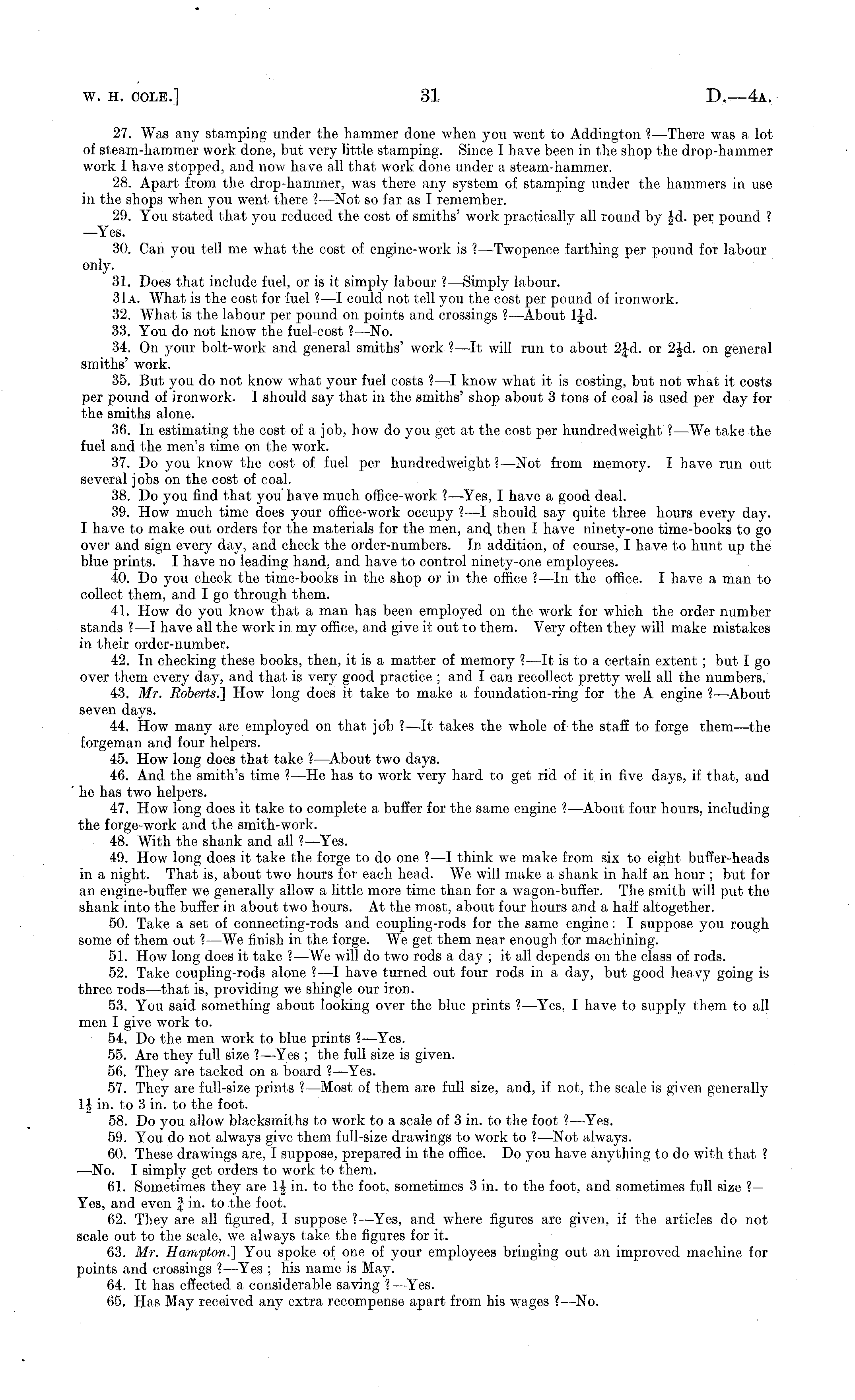 27. Was any stamping under the hammer done when you went to Addington ? —There was a lot of steam-hammer work done, but very little stamping. Since I have been in the shop the drop-hammer work I have stopped, and now have all that work done under a steam-hammer. 28. Apart from the drop-hammer, was there any system of stamping under the hammers in use in the shops when you went there ? —Not so far as I remember. 29. You stated that you reduced the cost of smiths' work practically all round by Jd. per pound ? —Yes. 30. Can you tell me what the cost of engine-work is ?—Twopence farthing per pound for labour only. 31. Does that include fuel, or is it simply labour ? —Simply labour. 31a. What is the cost for fuel ?—I could not tell you the cost per pound of ironwork. 32. What is the labour per pound on points and crossings ? —About ljd. 33. You do not know the fuel-cost ? —No. 34. On your bolt-work and general smiths' work ?—lt will run to about 2|d. or 2|d. on general smiths' work. 35. But you do not know what your fuel costs ?—I know what it is costing, but not what it costs per pound of ironwork. I should say that in the smiths' shop about 3 tons of coal is used per day for the smiths alone. 36. In estimating the cost of a job, how do you get at the cost per hundredweight ?—We take the fuel and the men's time on the work. 37. Do you know the cost of fuel per hundredweight ?—Not from memory. I have run out several jobs on the cost of coal. 38. Do you find that you have much office-work ?—Yes, I have a good deal. 39. How much time does your office-work occupy ? —I should say quite three hours every day. I have to make out orders for the materials for the men, and then I have ninety-one time-books to go over and sign every day, and check the order-numbers. In addition, of course, I have to hunt up the blue prints. I have no leading hand, and have to control ninety-one employees. 40. Do you check the time-books in the shop or in the office ? —ln the office. I have a man to collect them, and I go through them. 41. How do you know that a man has been employed on the work for which the order number stands ? —I have all the work in my office, and give it out to them. Very often they will make mistakes in their order-number. 42. In checking these books, then, it is a matter of memory ? —lt is to a certain extent; but Igo over them every day, and that is very good practice ; and I can recollect pretty well all the numbers. 43. Mr. Roberts.] How long does it take to make a foundation-ring for the A engine ? —About seven days. 44. How many are employed on that job ?—lt takes the whole of the staff to forge them—the forgeman and four helpers. 45. How long does that take ? —About two days. 46. And the smith's time ? —He has to work very hard to get rid of it in five days, if that, and he has two helpers. 47. How long does it take to complete a buffer for the same engine ?—About four hours, including the forge-work and the smith-work. 48. With the shank and all ?—Yes. 49. How long does it take the forge to do one ? —I think we make from six to eight buffer-heads in a night. That is, about two hours for each head. We will make a shank in half an hour ; but for an engine-buffer we generally allow a little more time than for a wagon-buffer. The smith will put the shank into the buffer in about two hours. At the most, about four hours and a half altogether. 50. Take a set of connecting-rods and coupling-rods for the same engine: I suppose you rough some of them out ?—We finish in the forge. We get them near enough for machining. 51. How long does it take ? —We will do two rods a day ; it all depends on the class of rods. 52. Take coupling-rods alone ?—I have turned out four rods in a day, but good heavy going is three rods —that is, providing we shingle our iron. 53. You said something about looking over the blue prints ? —Yes, I have to supply them to all men I give work to. 54. Do the men work to blue prints ? —Yes. 55. Are they full size ? —Yes ; the full size is given. 56. They are tacked on a board ?—Yes. 57. They are full-size prints ?—Most of them are full size, and, if not, the scale is given generally 1} in. to 3 in. to the foot. 58. Do you allow blacksmiths to work to a scale of 3 in. to the foot ?—Yes. 59. You do not always give them full-size drawings to work to ?—Not always. 60. These drawings are, I suppose, prepared in the office. Do you have anything to do with that % —No. I simply get orders to work to them. 61. Sometimes they are \\ in. to the foot, sometimes 3 in. to the foot, and sometimes full size ?— Yes, and even f in. to the foot. 62. They are all figured, I suppose ?—Yes, and where figures are given, if the articles do not scale out to the scale, we always take the figures for it. 63. Mr. Hampton.'] You spoke of one of your employees bringing out an improved machine for points and crossings ?—Yes ; his name is May. 64. It has effected a considerable saving ? —Yes. 65. Has May received any extra recompense apart from his wages ? —No.