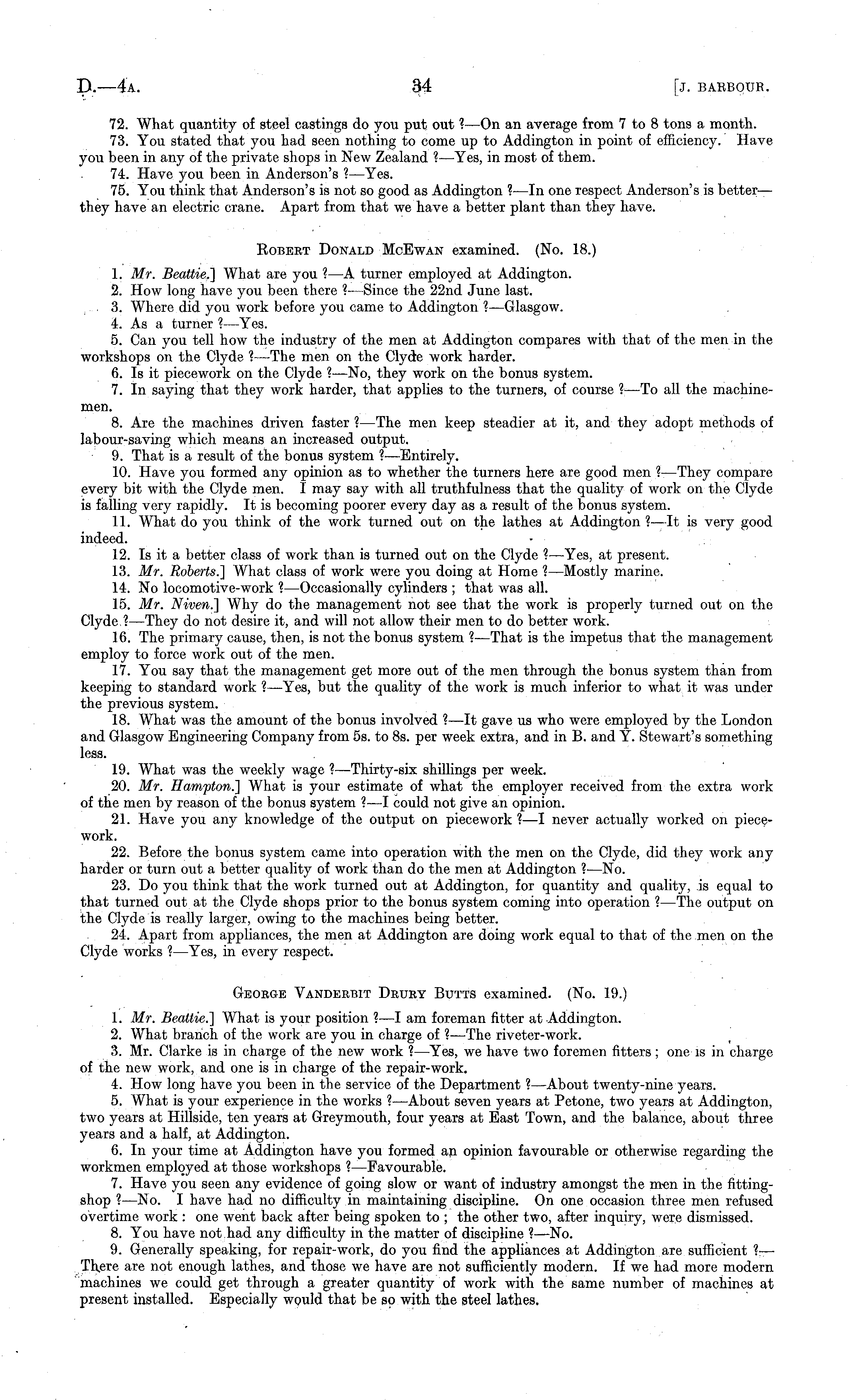 72. What quantity of steel castings do you put out ? —On an average from 7 to 8 tons a month. 73. You stated that you had seen nothing to come up to Addington in point of efficiency. Have you been in any of the private shops in New Zealand I—Yes, in most of them. 74. Have you been in Anderson's ? —Yes. 75. You think that Anderson's is not so good as Addington ?—ln one respect Anderson's is better— they have an electric crane. Apart from that we have a better plant than they have. Eobbrt Donald McEwan examined. (No. 18.) 1. Mr. Beattie.] What are you ?—A turner employed at Addington. 2. How long have you been there ? —Since the 22nd June last. 3. Where did you work before you came to Addington ? —Glasgow. 4. As a turner ? —Yes. 5. Can you tell how the industry of the men at Addington compares with that of the men in the workshops on the Clyde ? —The men on the Clyde work harder. 6. Is it piecework on the Clyde ? —No, they work on the bonus system. 7. In saying that they work harder, that applies to the turners, of course ? —To all the machinemen. 8. Are the machines driven faster ? —The men keep steadier at it, and they adopt methods of labour-saving which means an increased output. 9. That is a result of the bonus system ?—Entirely. 10. Have you formed any opinion as to whether the turners here are good men ? —They compare every bit with the Clyde men. I may say with all truthfulness that the quality of work on the Clyde is falling very rapidly. It is becoming poorer every day as a result of the bonus system. 11. What do you think of the work turned out on the lathes at Addington ? —lt is very good indeed. 12. Is it a better class of work than is turned out on the Clyde ? —Yes, at present. 13. Mr. Roberts.] What class of work were you doing at Home ? —Mostly marine. 14. No locomotive-work ?—Occasionally cylinders ; that was all. 15. Mr. Niven.] Why do the management not see that the work is properly turned out on the Clyde ?—They do not desire it, and will not allow their men to do better work. 16. The primary cause, then, is not the bonus system ? —That is the impetus that the management employ to force work out of the men. 17. You say that the management get more out of the men through the bonus system than from keeping to standard work ?—Yes, but the quality of the work is much inferior to what it was under the previous system. 18. What was the amount of the bonus involved ?—lt gave us who were employed by the London and Glasgow Engineering Company from ss. to Bs. per week extra, and in B. and Y. Stewart's something less. 19. What was the weekly wage ?—Thirty-six shillings per week. 20. Mr. Hampton.] What is your estimate of what the employer received from the extra work of the men by reason of the bonus system ? —I could not give an opinion. 21. Have you any knowledge of the output on piecework ?—I never actually worked on piecework. 22. Before the bonus system came into operation with the men on the Clyde, did they work any harder or turn out a better quality of work than do the men at Addington ? —No. 23. Do you think that the work turned out at Addington, for quantity and quality, is equal to that turned out at the Clyde shops prior to the bonus system coming into operation ? —The output on the Clyde is really larger, owing to the machines being better. 24:. Apart from appliances, the men at Addington are doing work equal to that of the men on the Clyde works ? —Yes, in every respect. George Vandeebit Drury Butts examined. (No. 19.) 1. Mr. Beattie.] What is your position ?—I am foreman fitter at Addington. 2. What branch of the work are you in charge of ? —The riveter-work. 3. Mr. Clarke is in charge of the new work ? —Yes, we have two foremen fitters ; one is in charge of the new work, and one is in charge of the repair-work. 4. How long have you been in the service of the Department ? —About twenty-nine years. 5. What is your experience in the works ? —About seven years at Petone, two years at Addington, two years at Hillside, ten years at Greymouth, four years at East Town, and the balance, about three years and a half, at Addington. 6. In your time at Addington have you formed an opinion favourable or otherwise regarding the workmen employed at those workshops ?—Favourable. 7. Have you seen any evidence of going slow or want of industry amongst the men in the fittingshop ? —No. I have had no difficulty in maintaining discipline. On one occasion three men refused overtime work : one went back after being spoken to ; the other two, after inquiry, were dismissed. 8. You have not had any difficulty in the matter of discipline ?—No. 9. Generally speaking, for repair-work, do you find the appliances at Addington are sufficient ? — There are not enough lathes, and those we have are not sufficiently modern. If we had more modern machines we could get through a greater quantity of work with the same number of machines at present installed. Especially would that be so with the steel lathes.