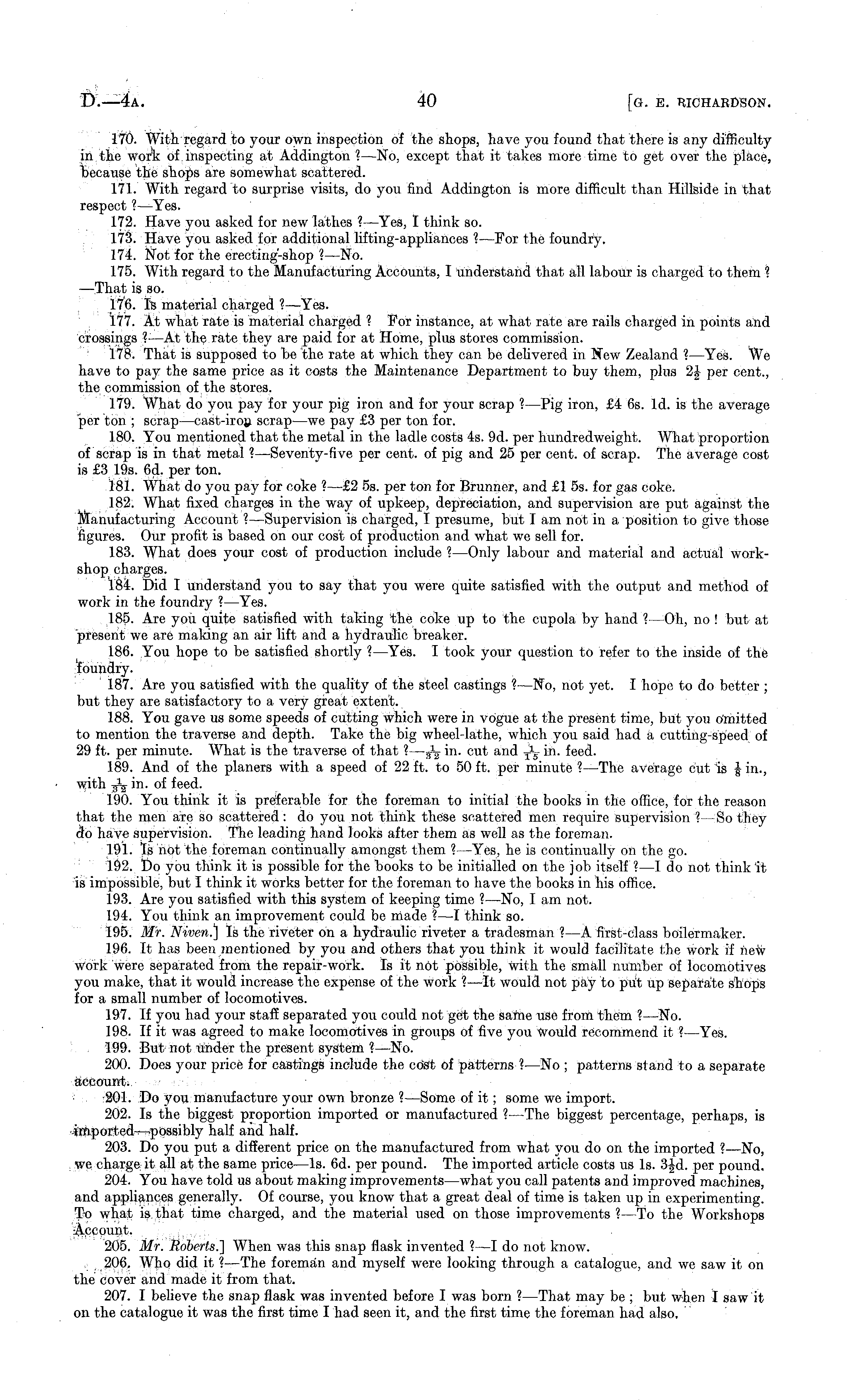 170. With regard to your own inspection of the shops, have you found that there is any difficulty in the work of inspecting at Aldington ?—No, except that it takes more time to get over the place, because the shops are somewhat scattered. 171. With regard to surprise visits, do you find Addington is more difficult than Hillside in that respect ?—Yes. 172. Have you asked for new lathes ? —Yes, I think so. 173. Have you asked for additional lifting-appliances ? —For the foundry. 174. Not for the erecting'-shop ? —No. 175. With regard to the Manufacturing Accounts, I understand that all labour is charged to them 1 —That is so. 176. Is material charged % —Yes. 177. At what rate is material charged ? For instance, at what rate are rails charged in points and crossings ?—At the rate they are paid for at Home, plus stores commission. 178. That is supposed to be the rate at which they can be delivered in New Zealand ? —Yes. We have to pay the same price as it costs the Maintenance Department to buy them, plus 2| per cent., the commission of the stores. 179. What do you pay for your pig iron and for your scrap ? —Pig iron, £4 6s. Id. is the average per ton ; serap —cast-iroe scrap—we pay £3 per ton for. 180. You mentioned that the metal in the ladle costs 4s. 9d. per hundredweight. What proportion of scrap is in that metal ? —Seventy-five per cent, of pig and 25 per cent, of scrap. The average cost is £3 19s. 6d. per ton. 181. What do you pay for coke ? —£2 ss. per ton for Brunner, and £1 ss. for gas coke. 182. What fixed charges in the way of upkeep, depreciation, and supervision are put against the Manufacturing Account ?—Supervision is charged, I presume, but I am not in a position to give those figures. Our profit is based on our cost of production and what we sell for. 183. What does your cost of production include ? —Only labour and material and actual workshop charges. 184. Did I understand you to say that you were quite satisfied with the output and method of work in the foundry % —Yes. 185. Are you quite satisfied with taking the coke up to the cupola by hand I—Oh,1 —Oh, no ! but at present we are making an air lift and a hydraulic breaker. 186. You hope to be satisfied shortly ?—Yes. I took your question to refer to the inside of the foundry. 187. Are you satisfied with the quality of the steel castings ? —No, not yet. I hope to do better ; but they are satisfactory to a very great extent. 188. You gave us some speeds of cutting which were in vogue at the present time, but you omitted to mention the traverse and depth. Take the big wheel-lathe, which you said had a cutting-speed of 29 ft. per minute. What is the traverse of that ? in. cut and Jt in. feed. 189. And of the planers with a speed of 22 ft. to 50 ft. per minute ? —The average cut is \ in., with Jj- in. of feed. 190. You think it is preferable for the foreman to initial the books in the office, for the reason that the men are so scattered: do you not think these scattered men require supervision ?—So they do have supervision. The leading hand looks after them as well as the foreman. 191. Is not the foreman continually amongst them ? —Yes, he is continually on the go. 192. Do you think it is possible for the books to be initialled on the job itself ?—I do not think it is impossible, but I think it works better for the foreman to have the books in his office. 193. Are you satisfied with this system of keeping time ?—No, I am not. 194. You think an improvement could be made ?—I think so. 195. Mr. Niven.) Is the riveter on a hydraulic riveter a tradesman ?—A first-class boilermaker. 196. It has been mentioned by you and others that you think it would facilitate the work if new work were separated from the repair-work. Is it not possible, with the small number of locomotives you make, that it would increase the expense of the work ? —lt would not pay to put up separate shops for a small number of locomotives. 197. If you had your staff separated you could not get the same use from them ? —No. 198. If it was agreed to make locomotives in groups of five you would recommend it ?—Yes. 199. But not under the present system ?—No. 200. Does your price for castings include the cost of patterns ? —No ; patterns stand to a separate account. 201. Do you manufacture your own bronze ?—Some of it; some we import. 202. Is the biggest proportion imported or manufactured I—The1 —The biggest percentage, perhaps, is half and half. 203. Do you put a different price on the manufactured from what you do on the imported ? —No, we charge it all at the same price—ls. 6d. per pound. The imported article costs us Is. 3Jd. per pound. 204. You have told us about making improvements—what you call patents and improved machines, and appliances generally. Of course, you know that a great deal of time is taken up in experimenting. To what is that time charged, and the material used on those improvements ? —To the Workshops •4-CCOunt. 205. Mr. Roberts.] When was this snap flask invented ? —I do not know. 206. Who did it ? —The foreman and myself were looking through a catalogue, and we saw it on the cover and made it from that. 207. I believe the snap flask was invented before I was born ? —That may be ; but when I saw it on the catalogue it was the first time I had seen it, and the first time the foreman had also.
